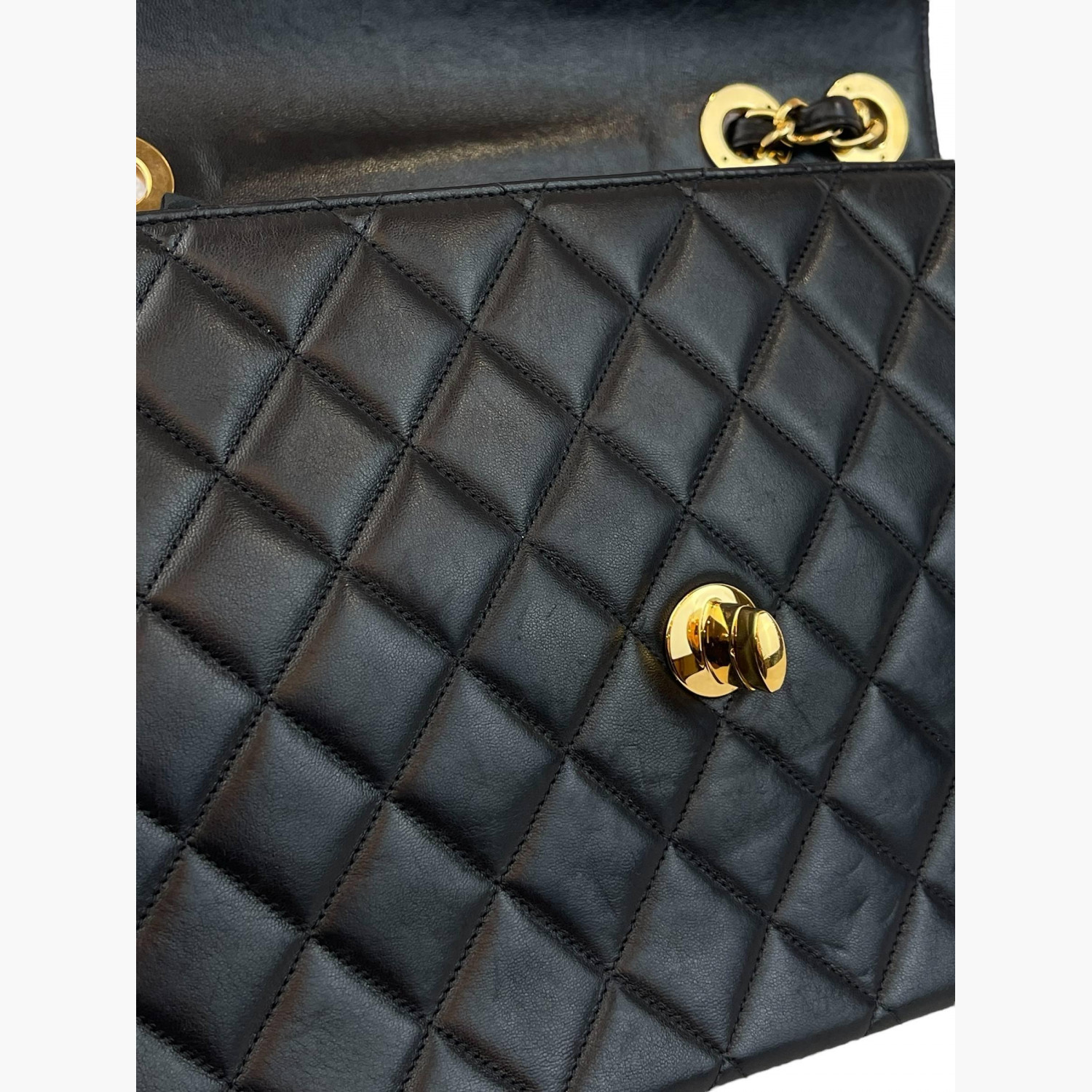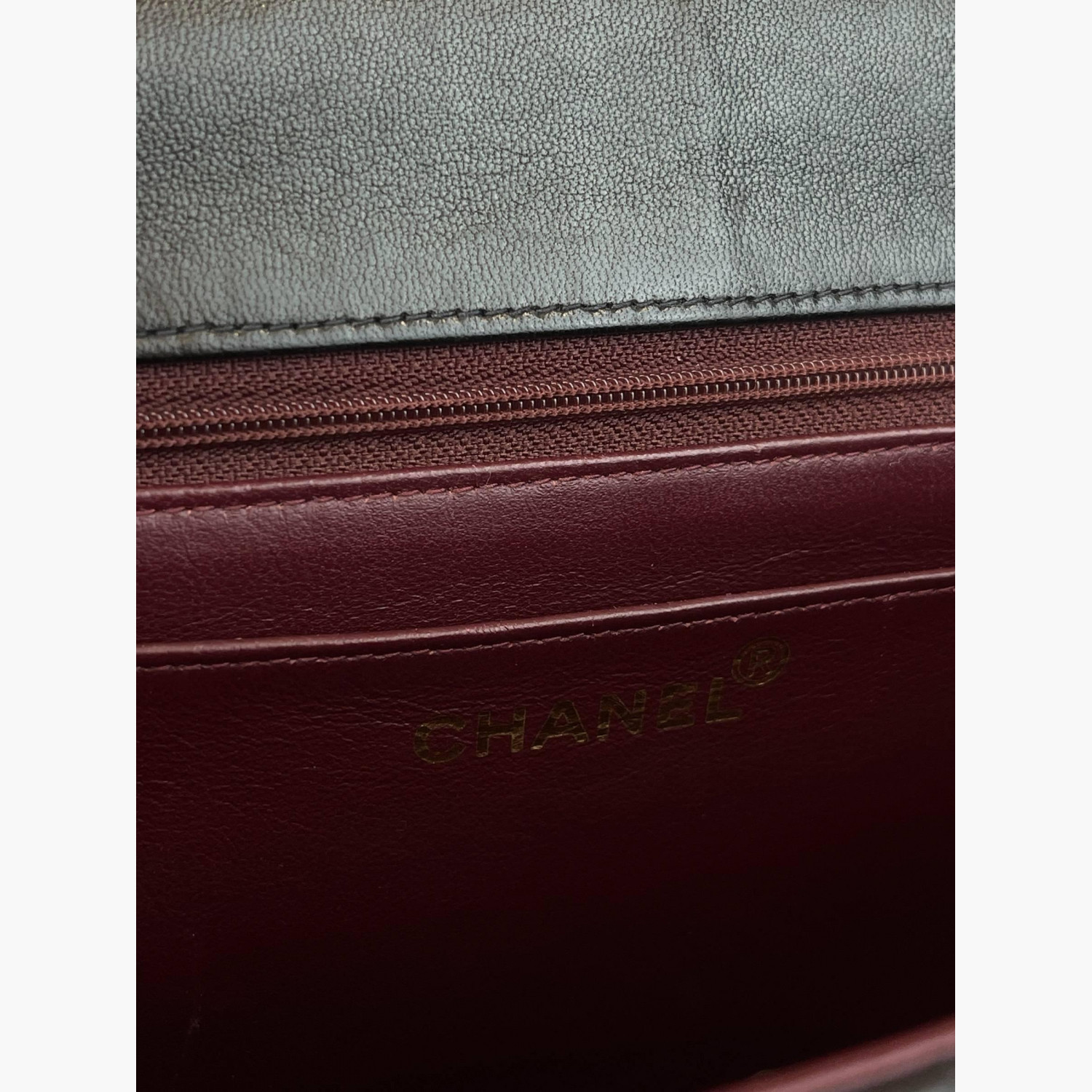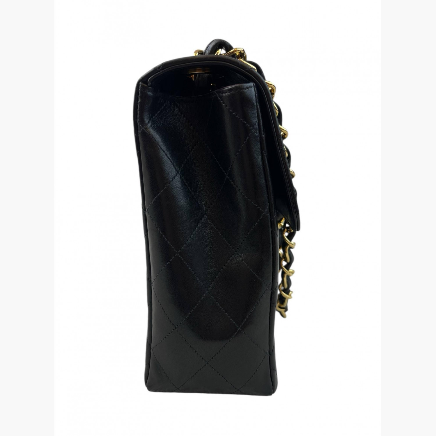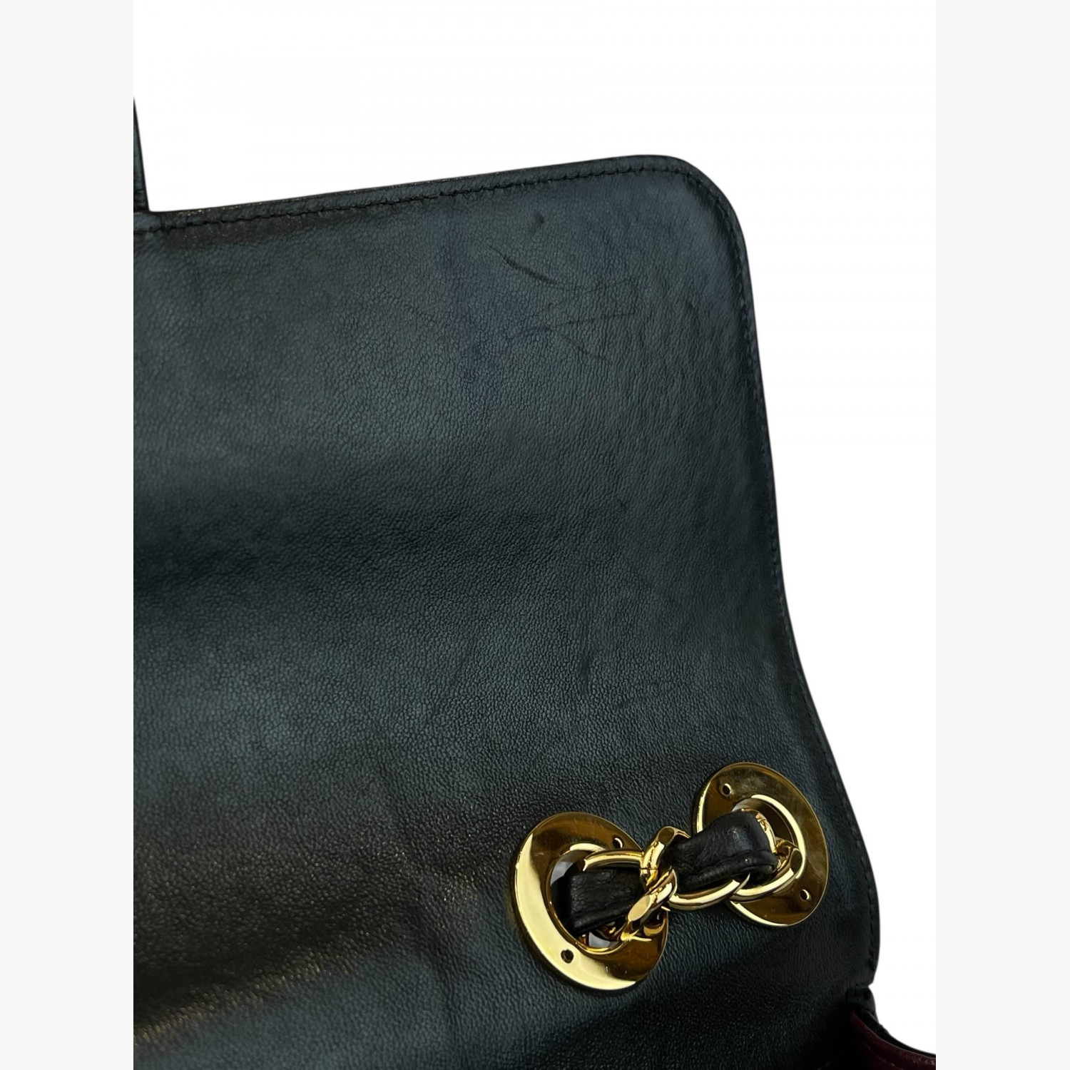 Чорна стьобана шкіряна сумка на ланцюжку. Всередині — одне основне відділення, подвійна кишеня та кишеня на блискавці. Ззаду розташована відкрита кишеня. У відмінному стані, присутні незначні сліди вжитку.