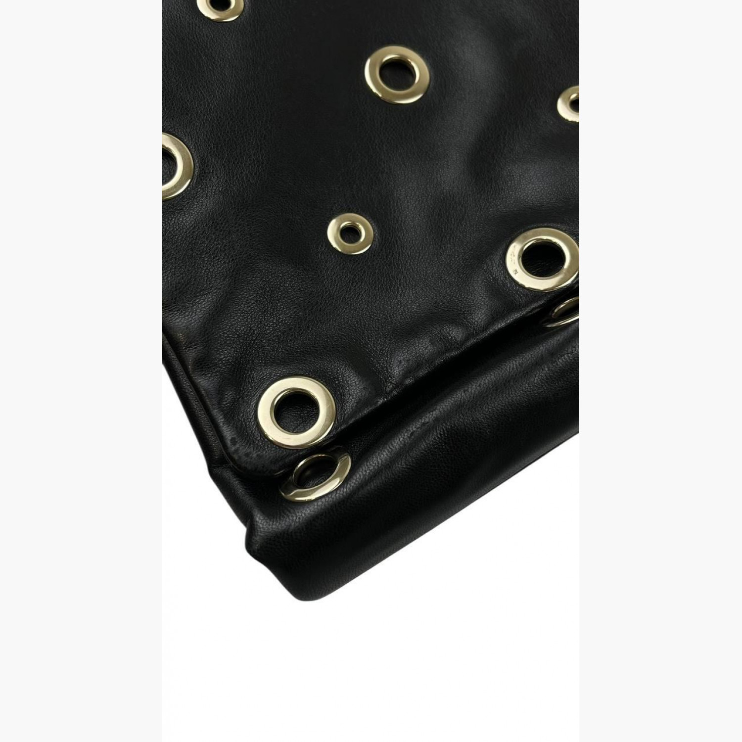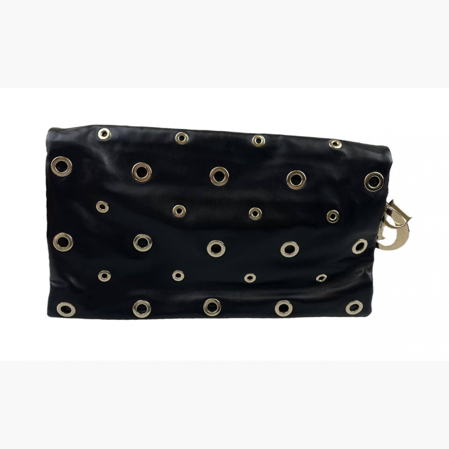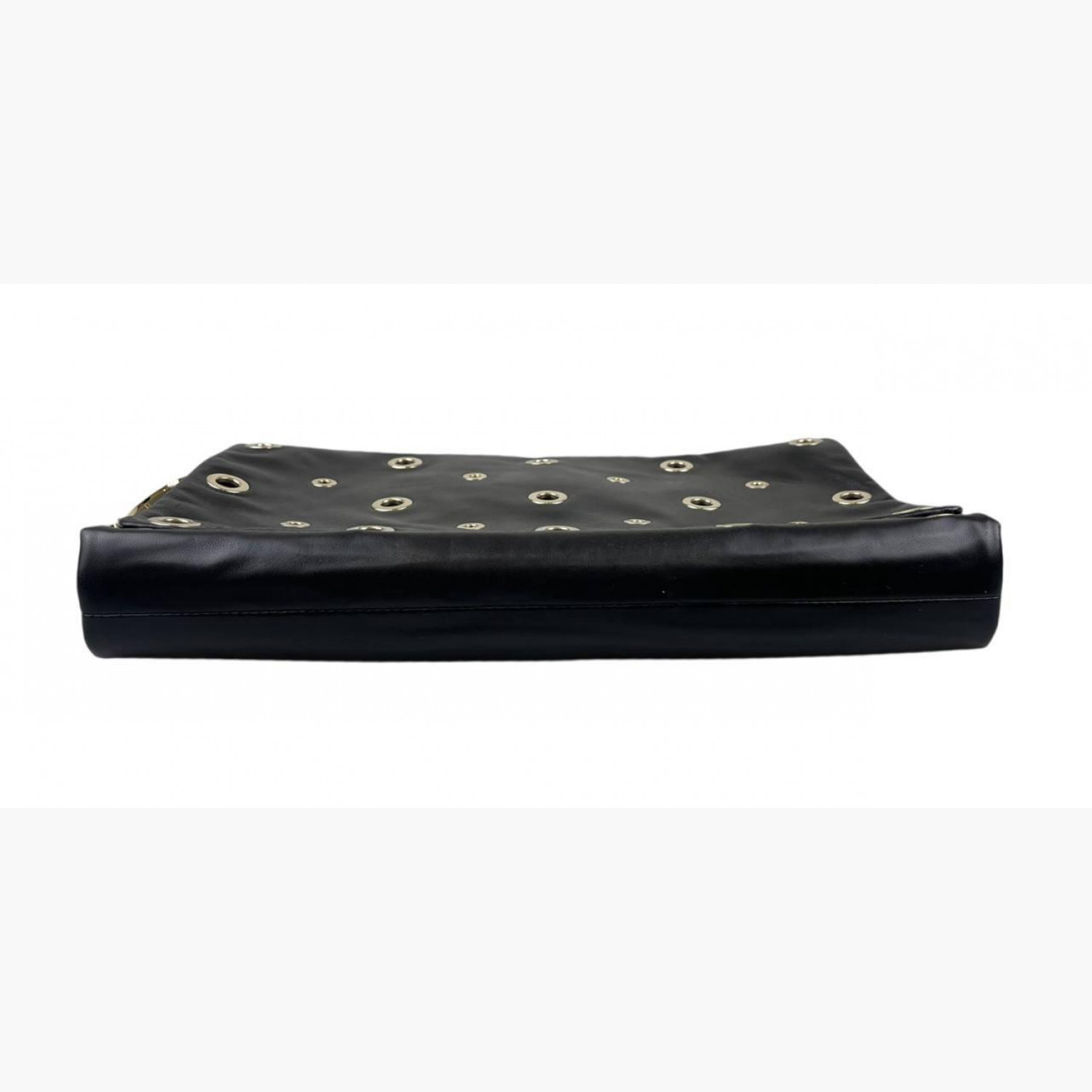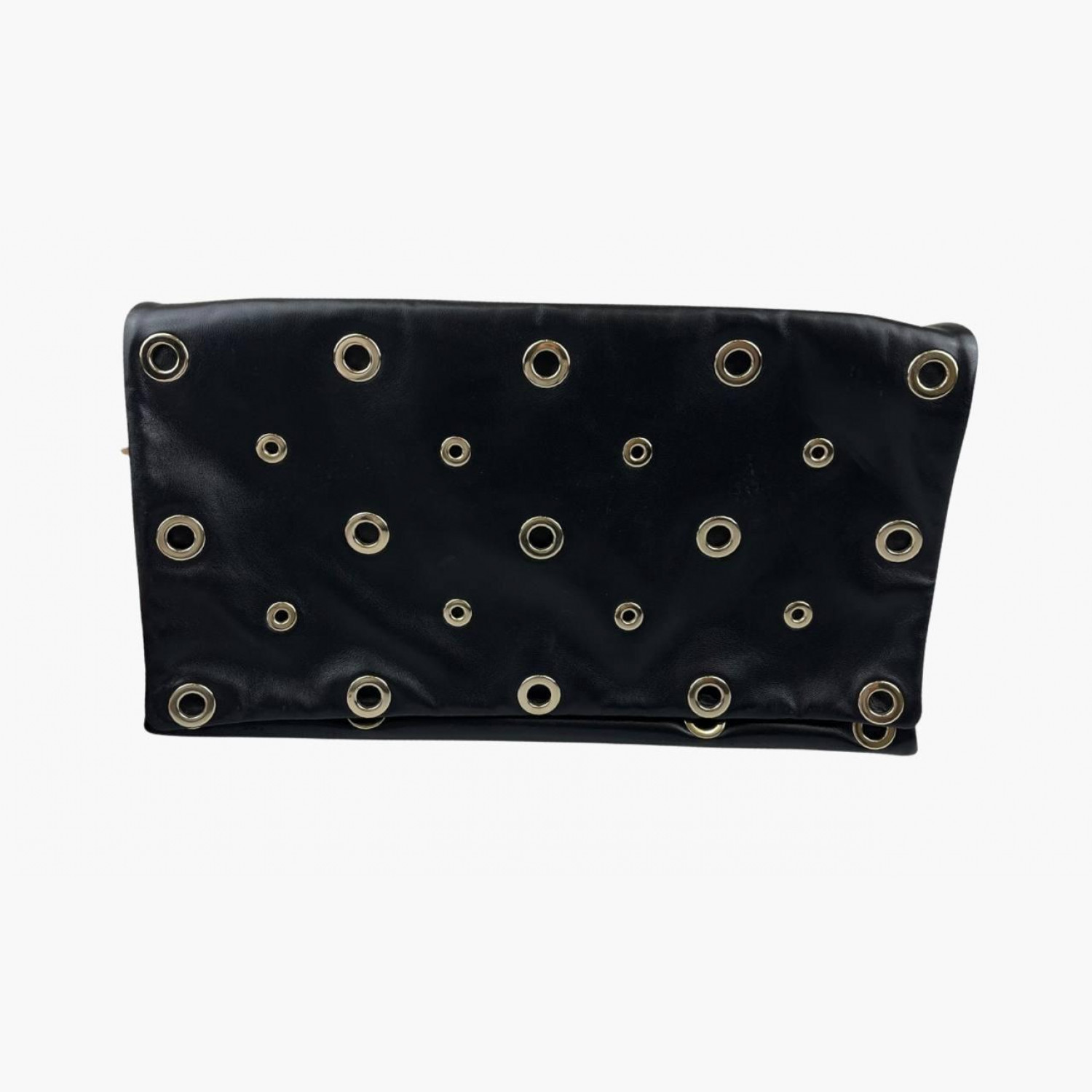 Чорний шкіряний клатч із декоративним золотистим люверсом. Усередині одне основне відділення та кишеня на блискавці. У хорошому стані, є легкі сліди вжитку.