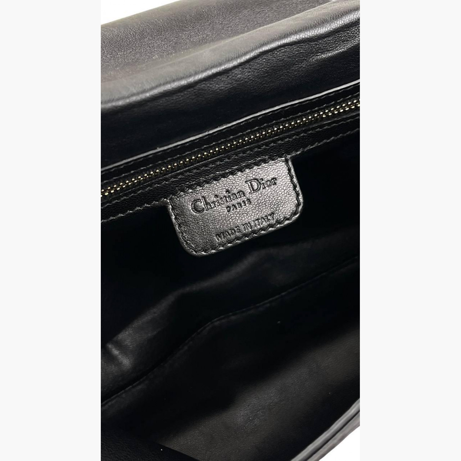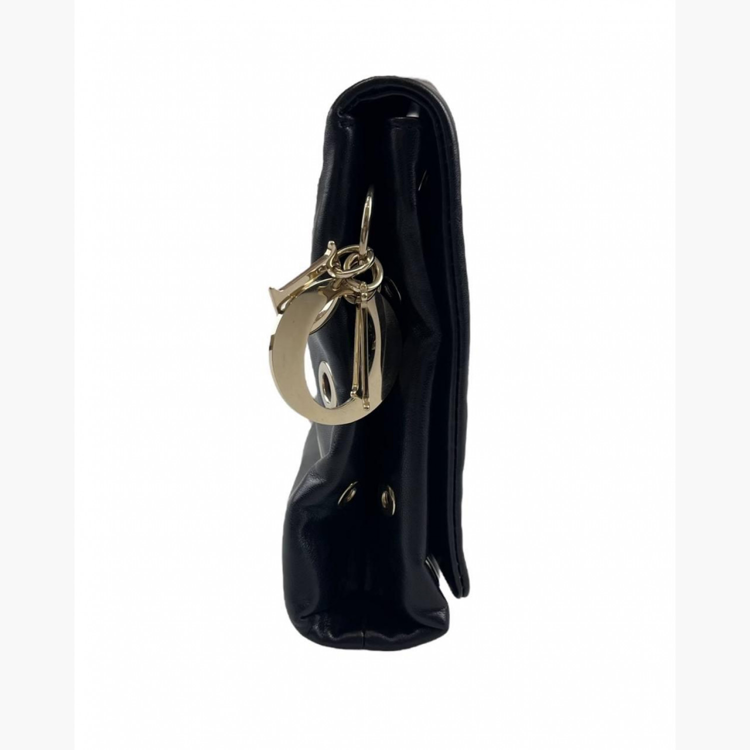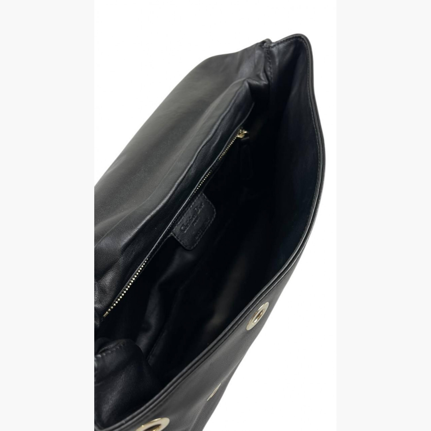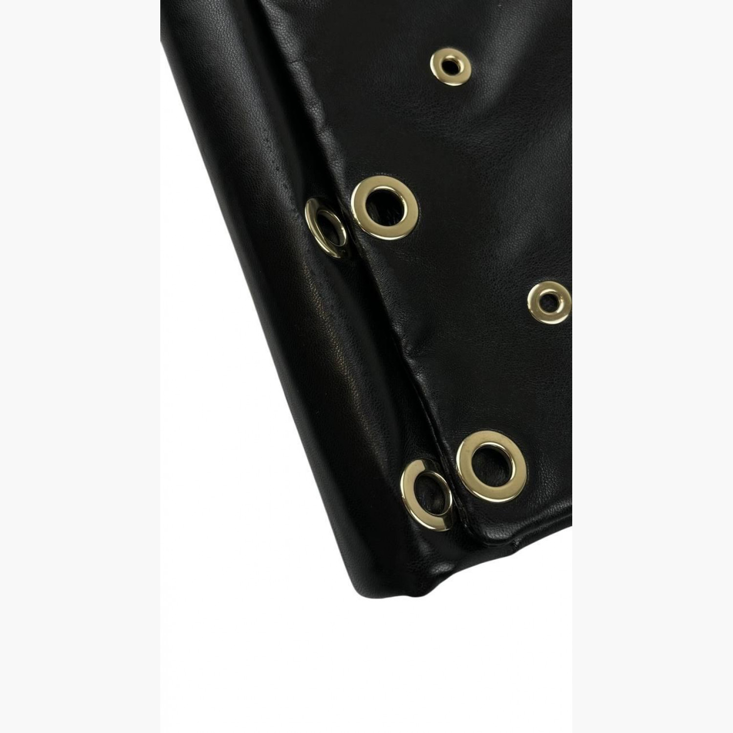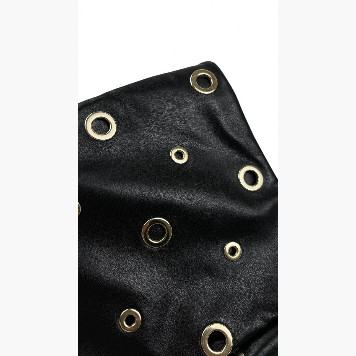Чорний шкіряний клатч із декоративним золотистим люверсом. Усередині одне основне відділення та кишеня на блискавці. У хорошому стані, є легкі сліди вжитку.