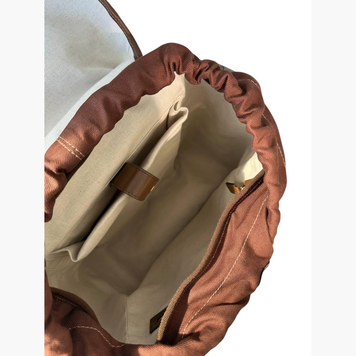 Коричневий рюкзак із канви та шкіри. Усередині одне основне відділення і дві кишені, додаткова кишеня на блискавці спереду. Абсолютно новий, без слідів вжитку.