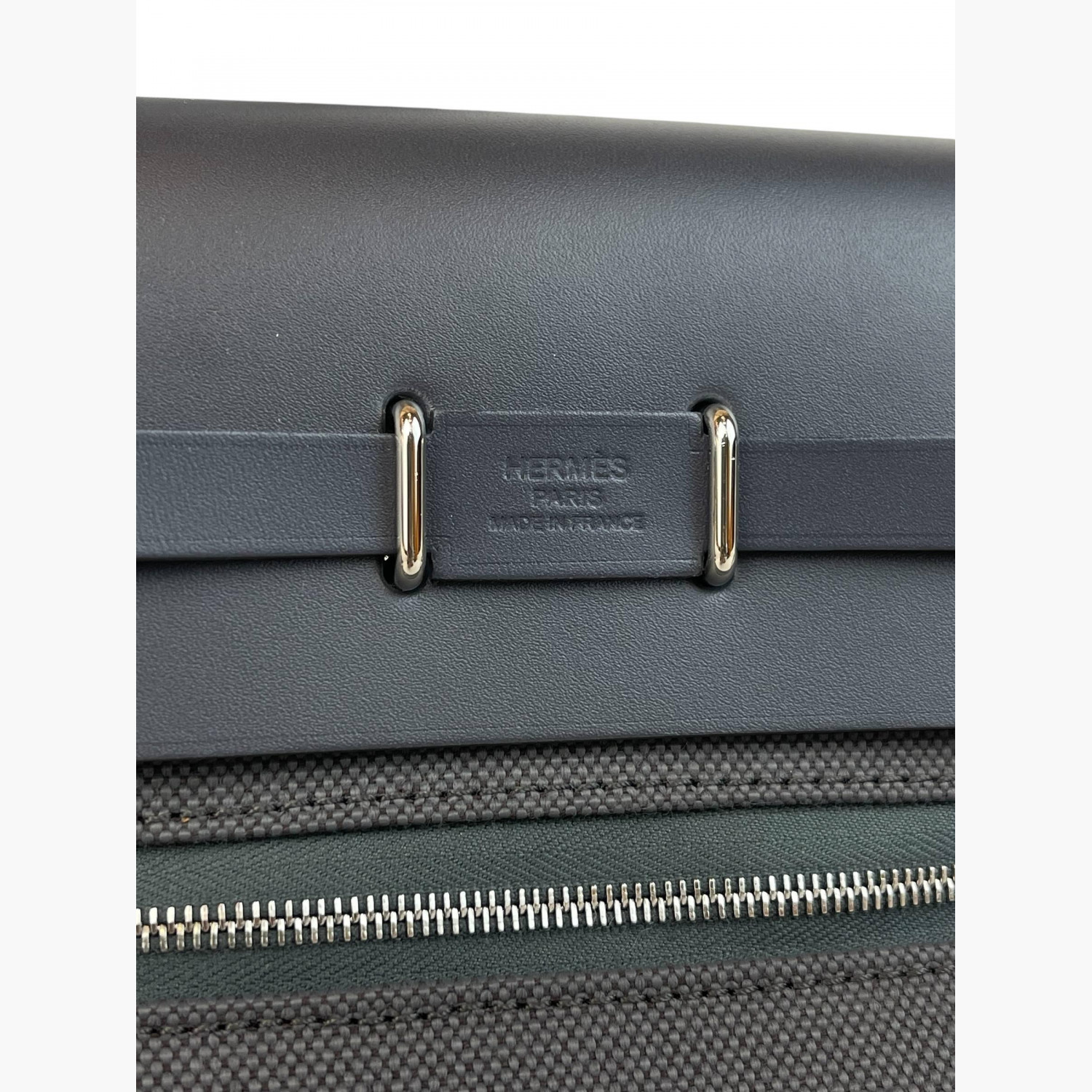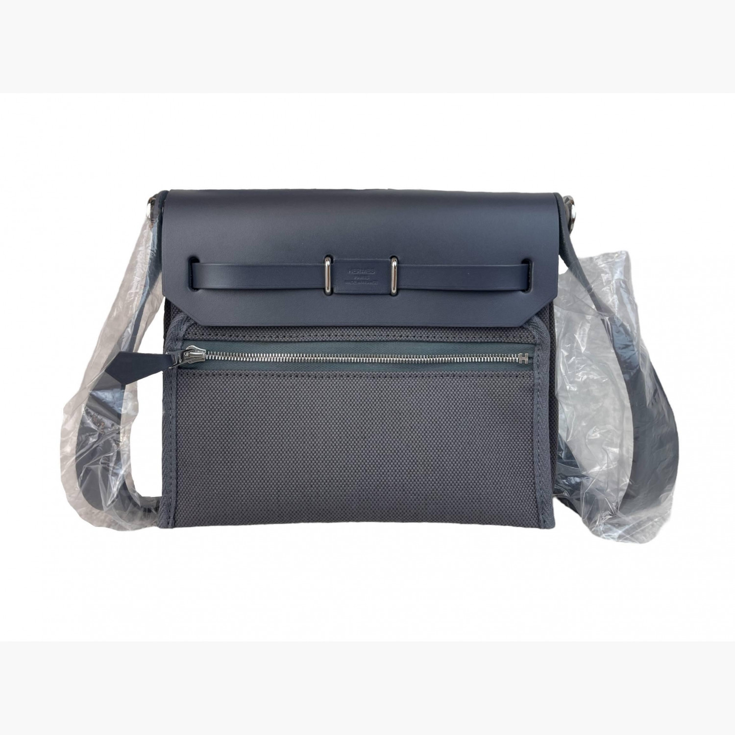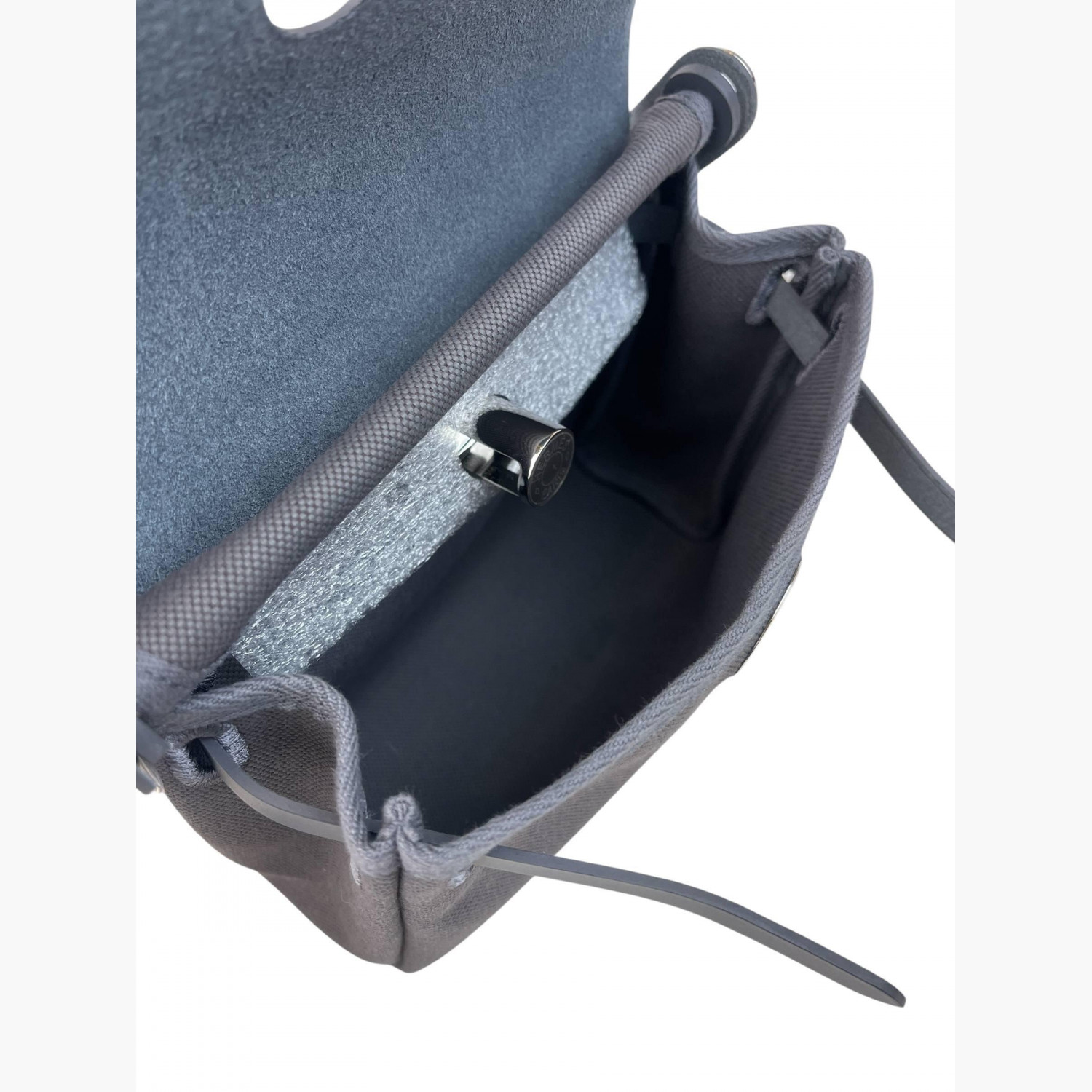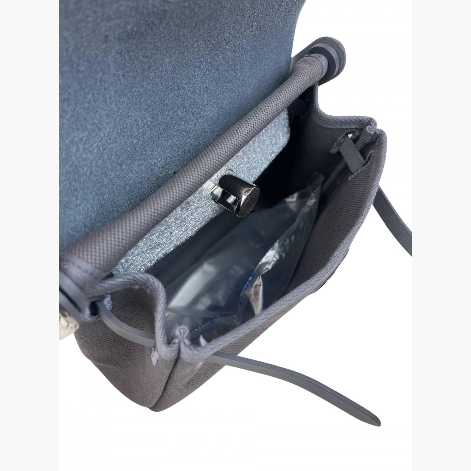 Сіра текстильна сумка зі шкіряною сірою кришкою. Усередині — одне основне відділення зі знімною кишенею на блискавці, а також кишеня на блискавці з заднього боку сумки.Абсолютно нова.