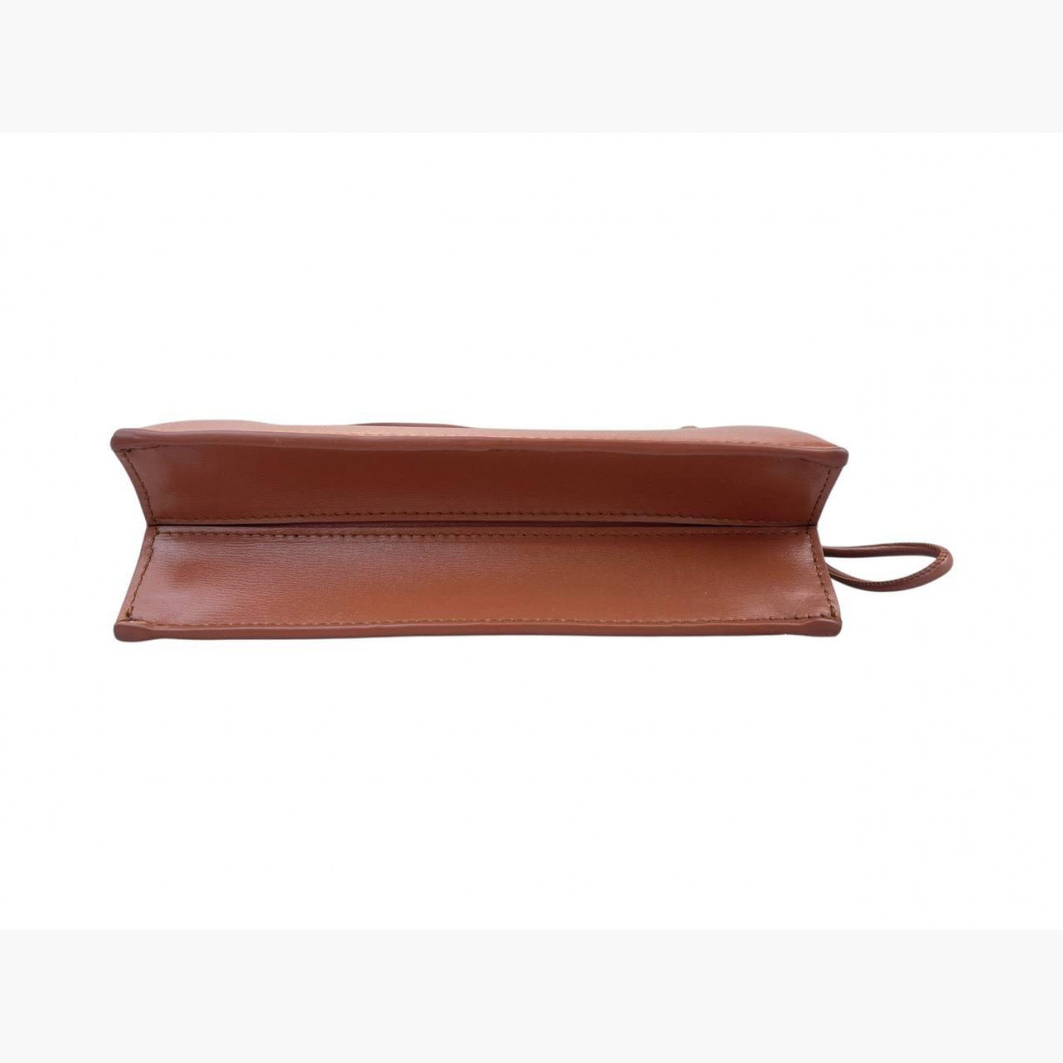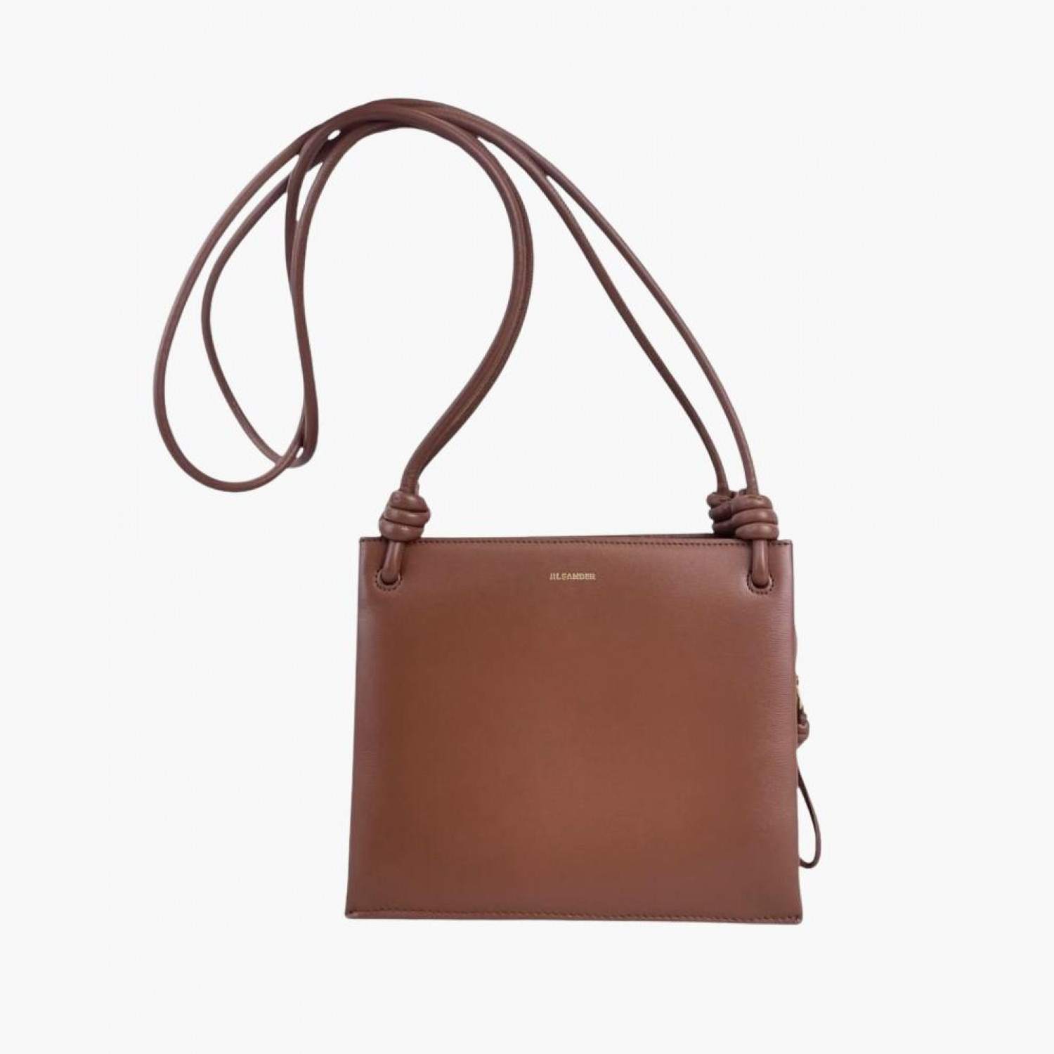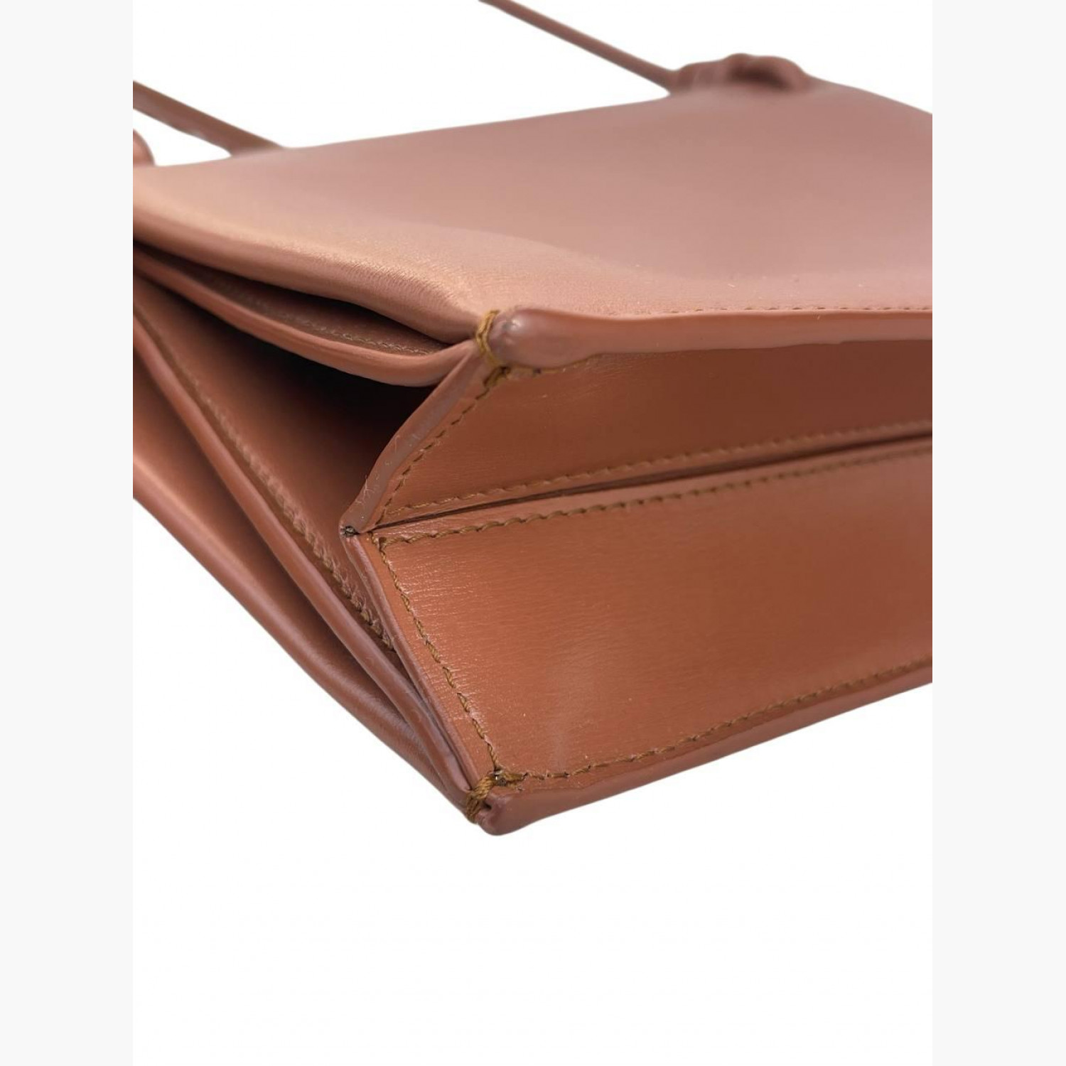 Коричнева шкіряна сумка квадратної форми. Усередині два основні відділення: у першому — без кишень, у другому — відкрита кишеня. Між ними розташована кишеня на блискавці. У хорошому стані, є плями та інші сліди вжитку.