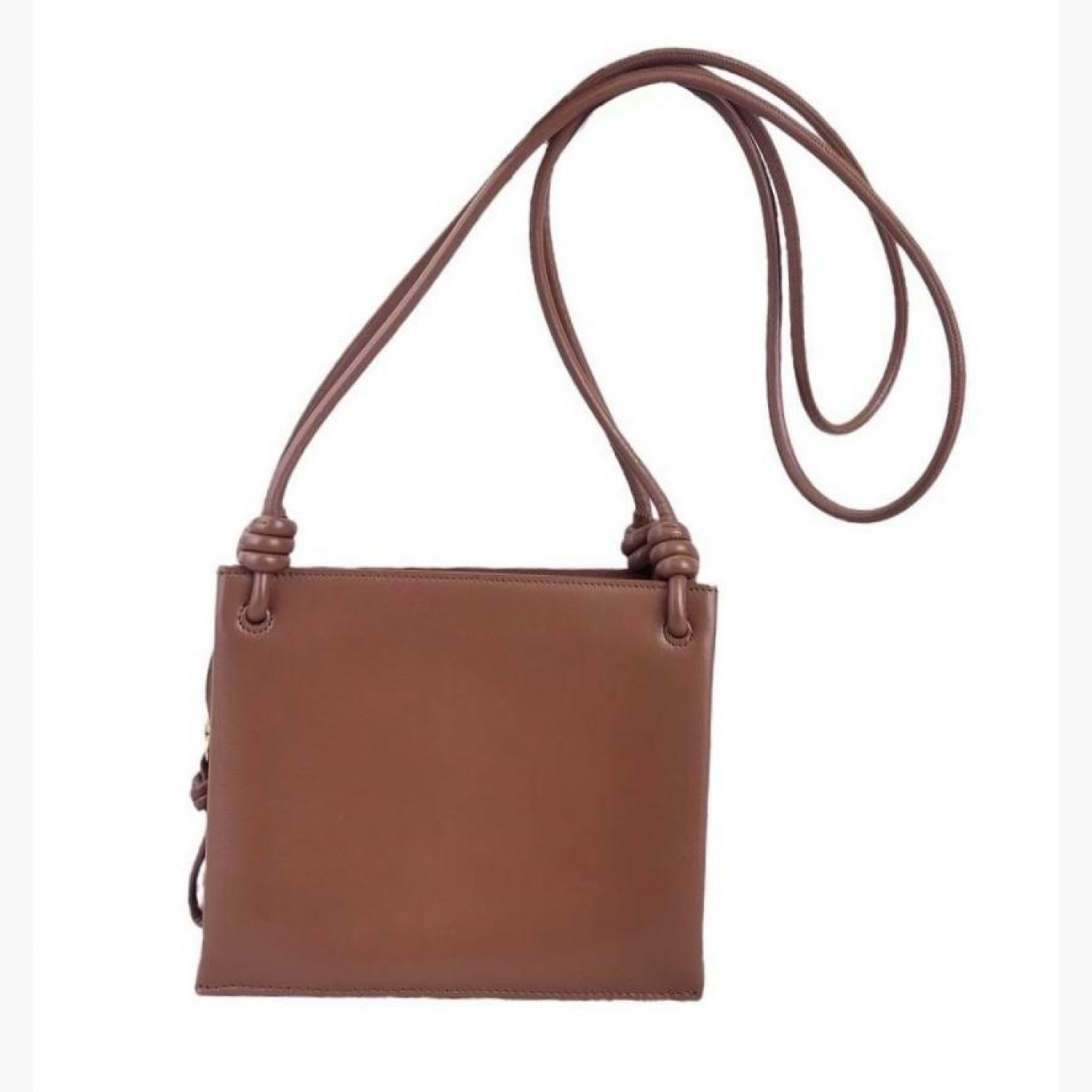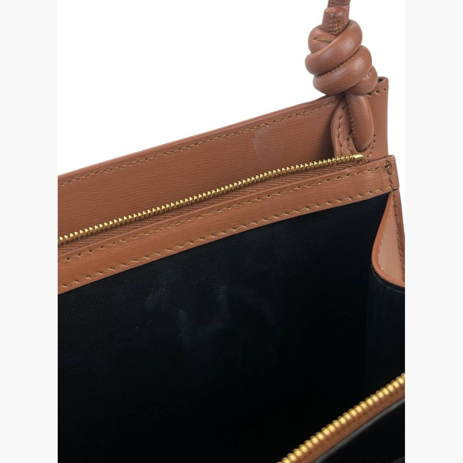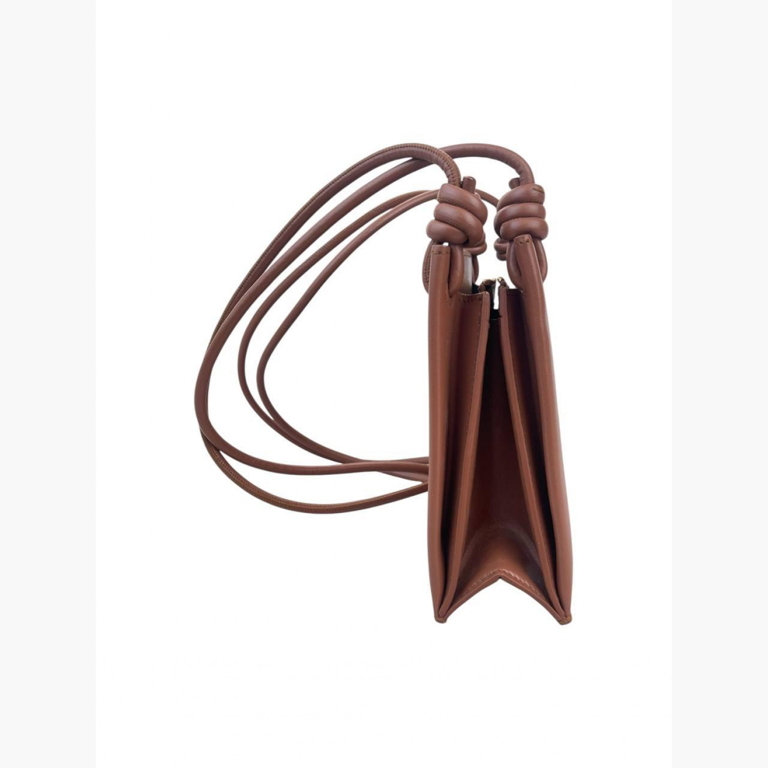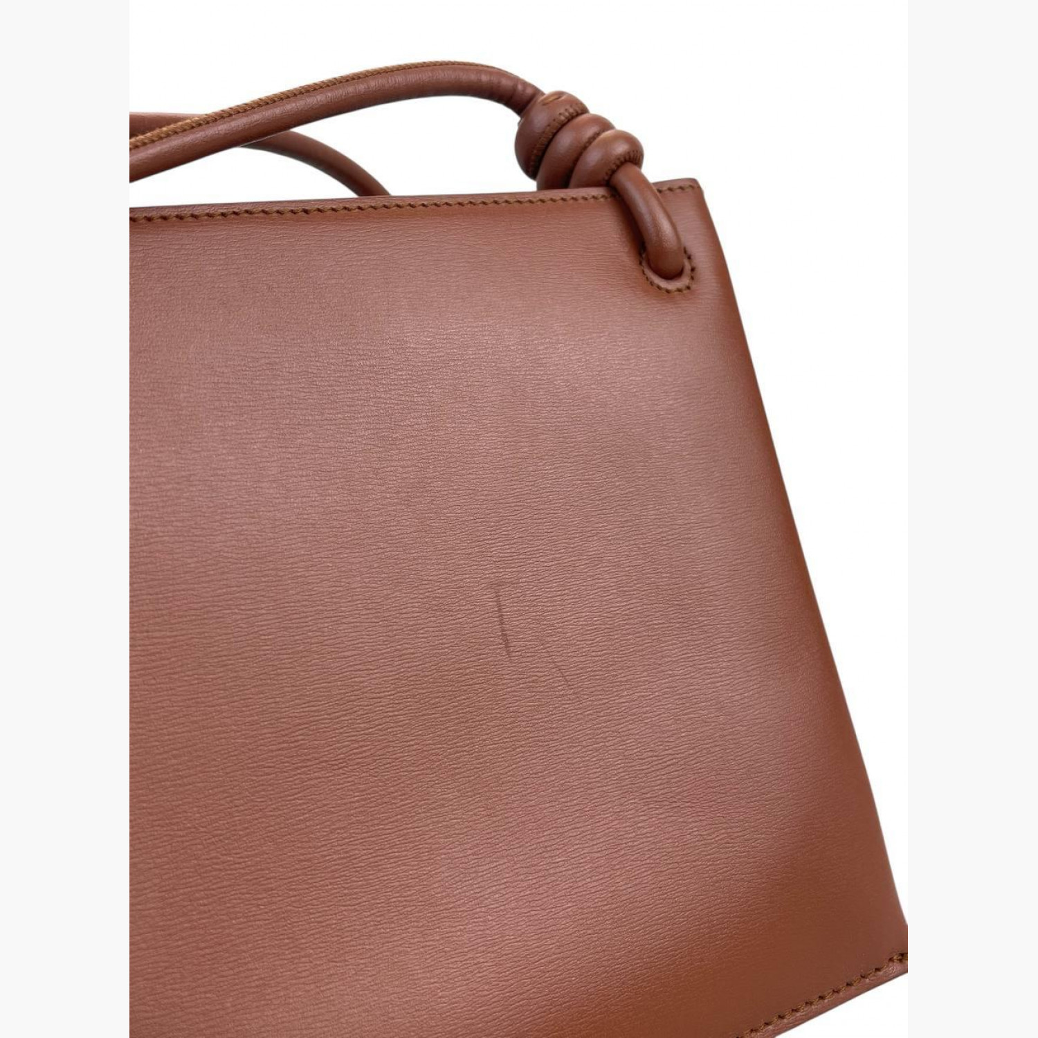 Коричнева шкіряна сумка квадратної форми. Усередині два основні відділення: у першому — без кишень, у другому — відкрита кишеня. Між ними розташована кишеня на блискавці. У хорошому стані, є плями та інші сліди вжитку.