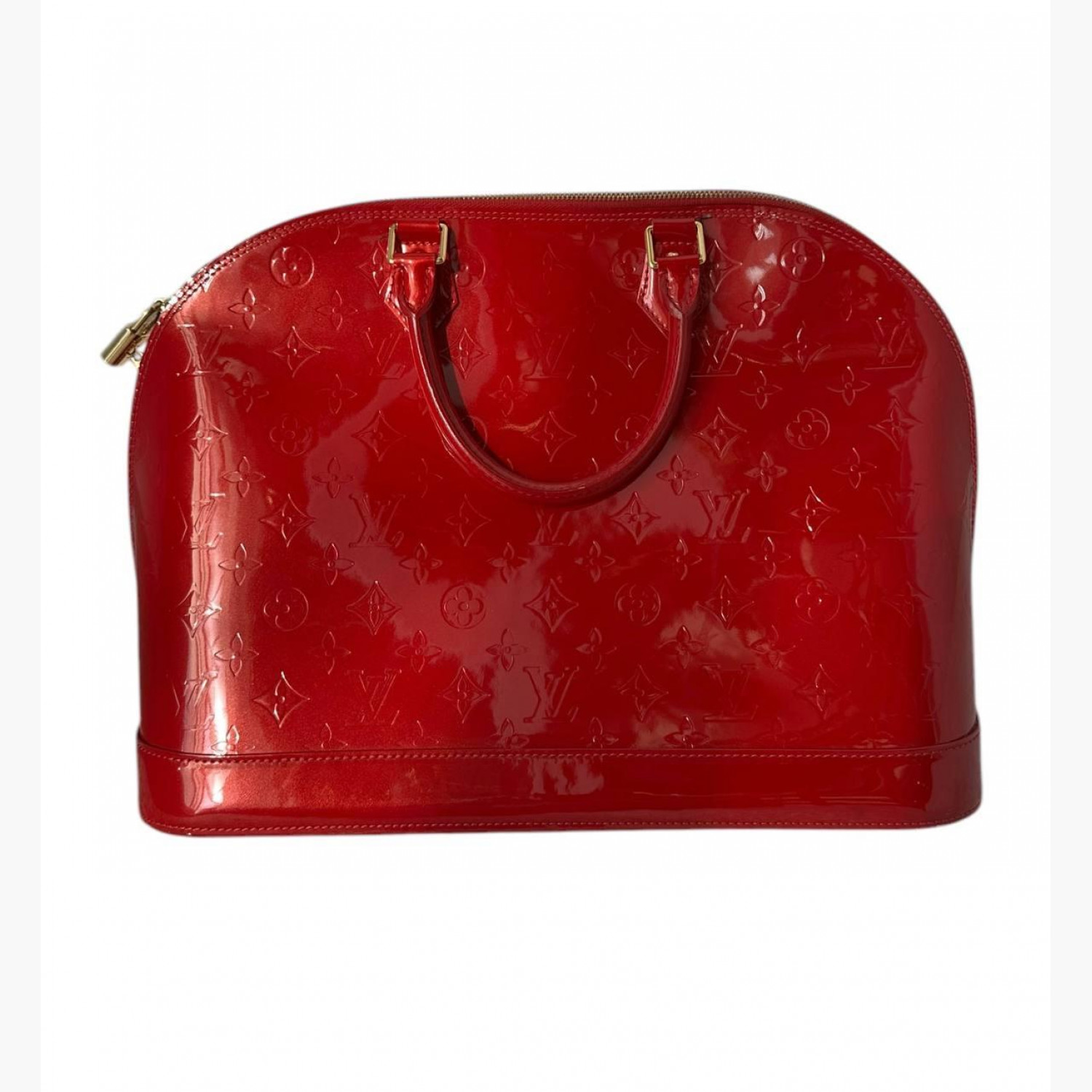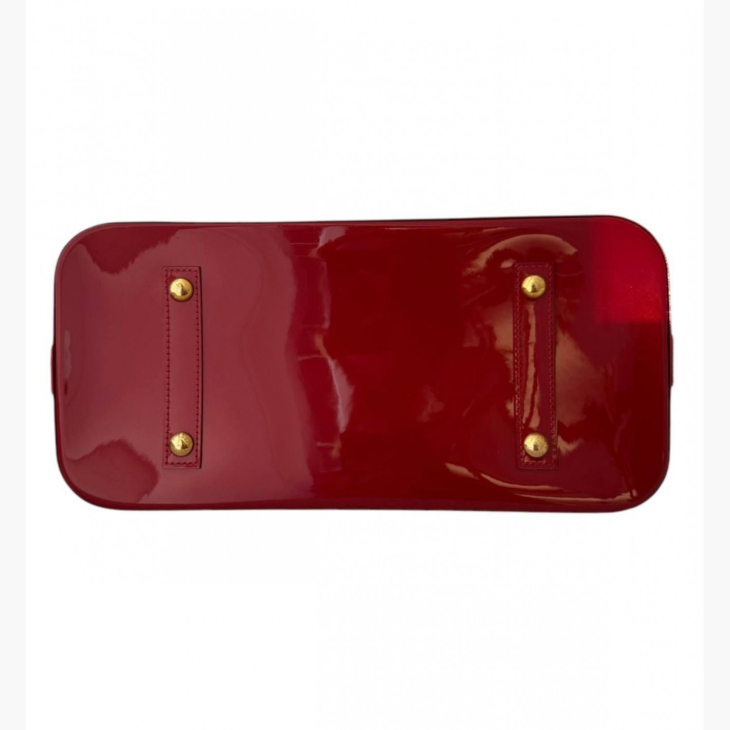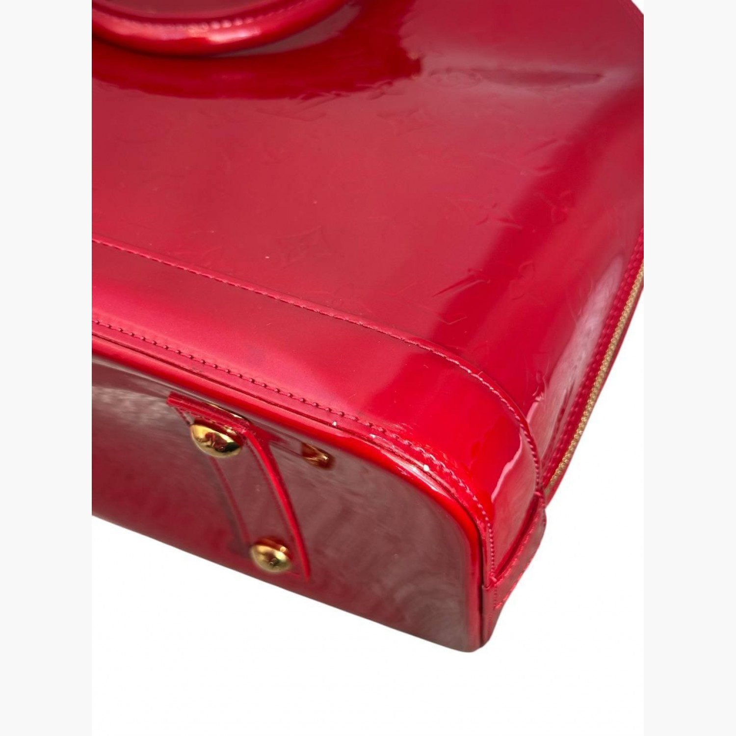 Красная лакированная сумка. Внутри одно основное отделение и два кармана. В хорошем состоянии, есть потертости на коже и фурнитуре.
