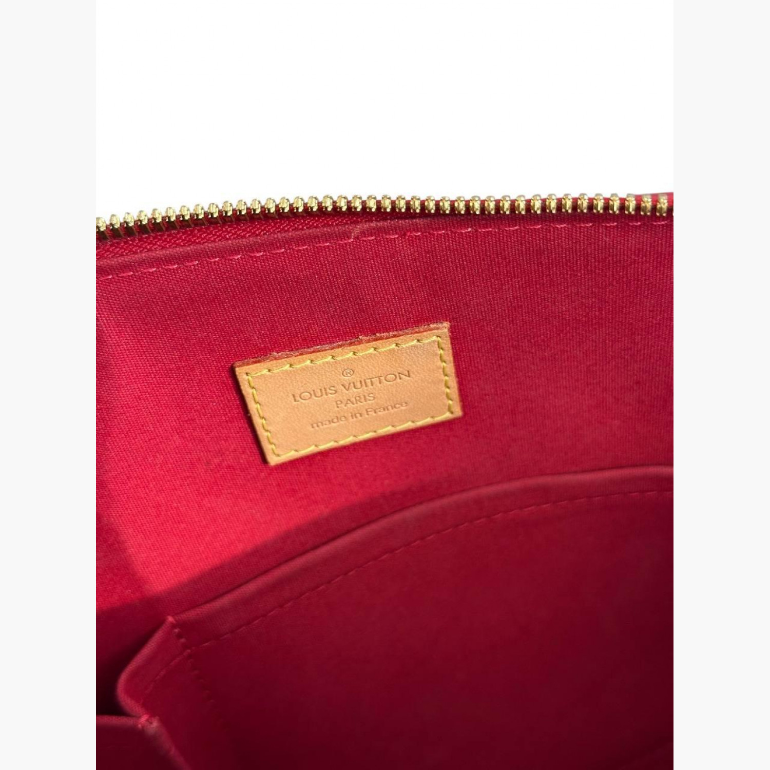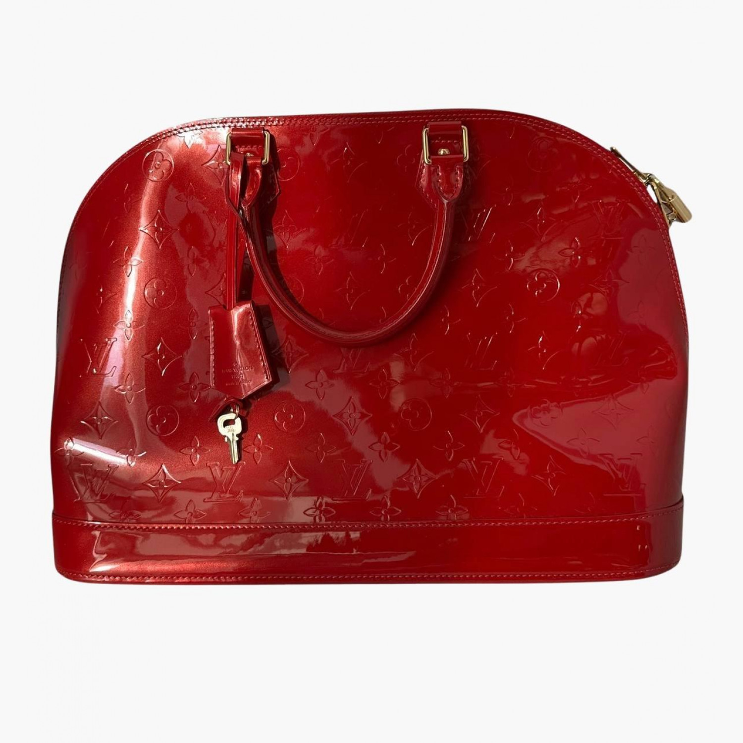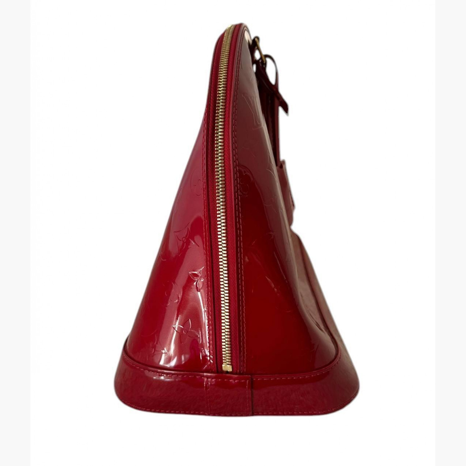 Красная лакированная сумка. Внутри одно основное отделение и два кармана. В хорошем состоянии, есть потертости на коже и фурнитуре.
