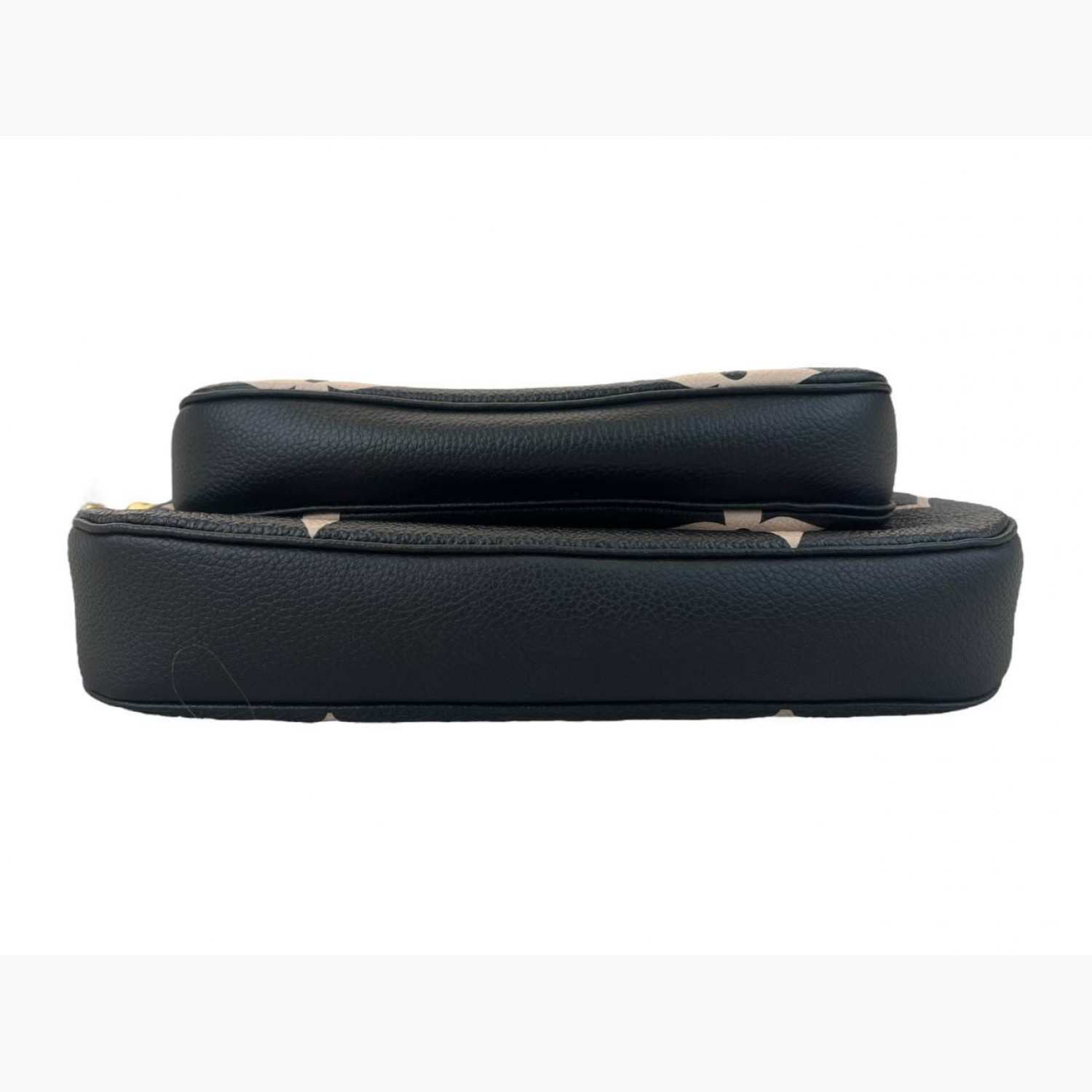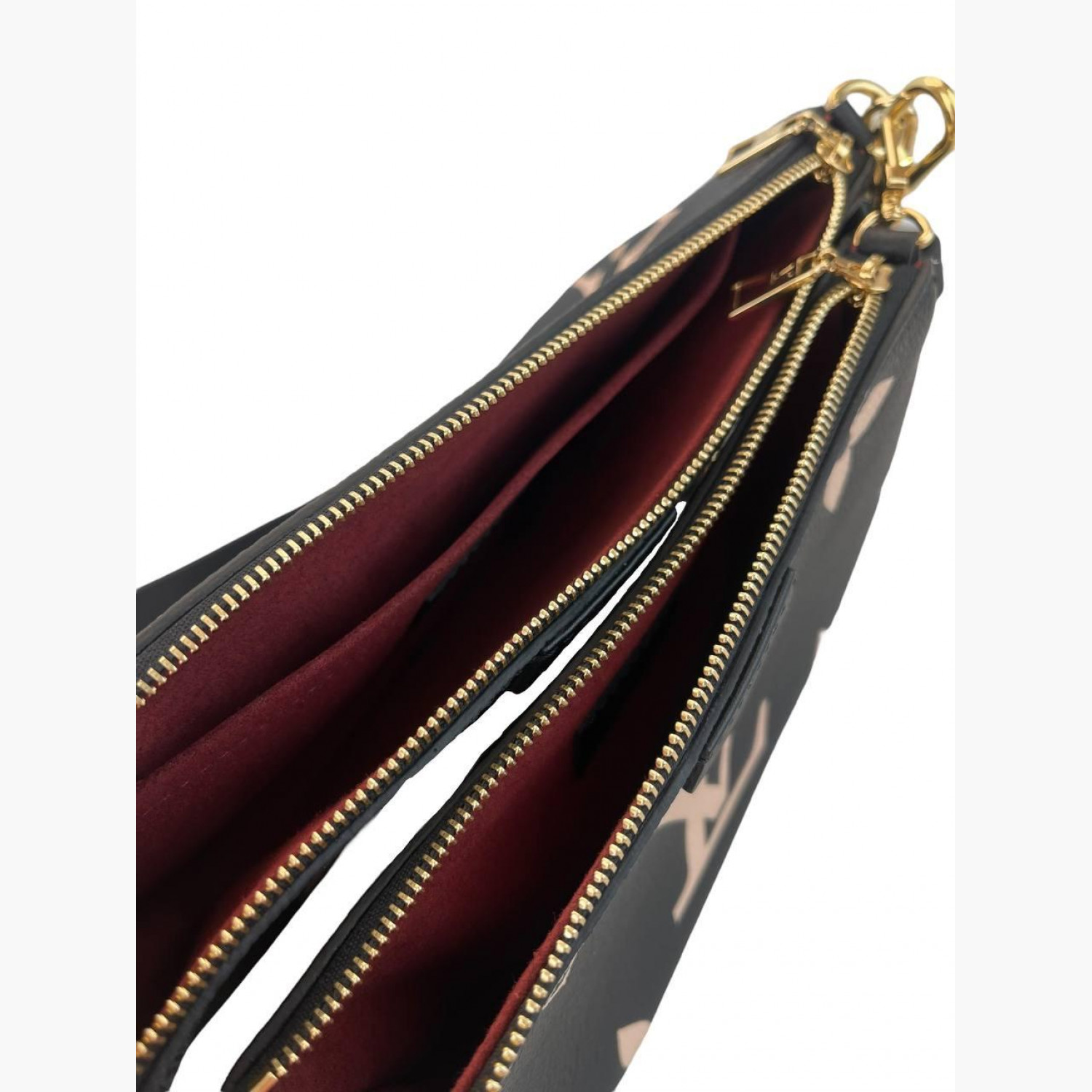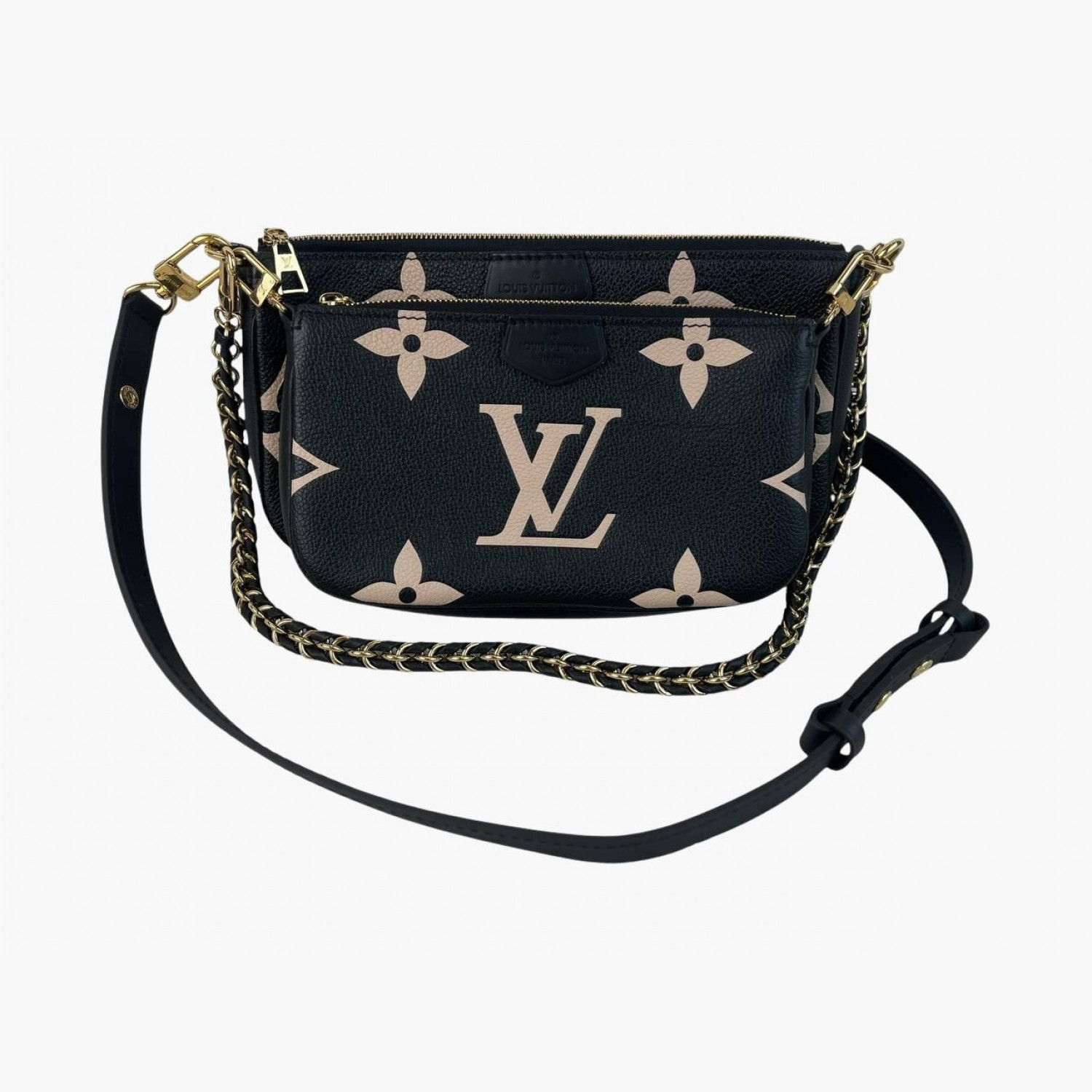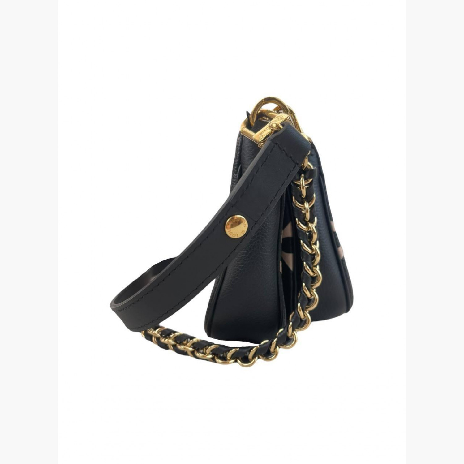 Чорна шкіряна сумка з великою рожевою монограмою на металевому ланцюжку золотого кольору та чорною шкіряною ручкою, зі знімним карманом на блискавці. Усередині — одне основне відділення з відкритою кишенею. У відмінному стані, є незначні сліди вжитку.