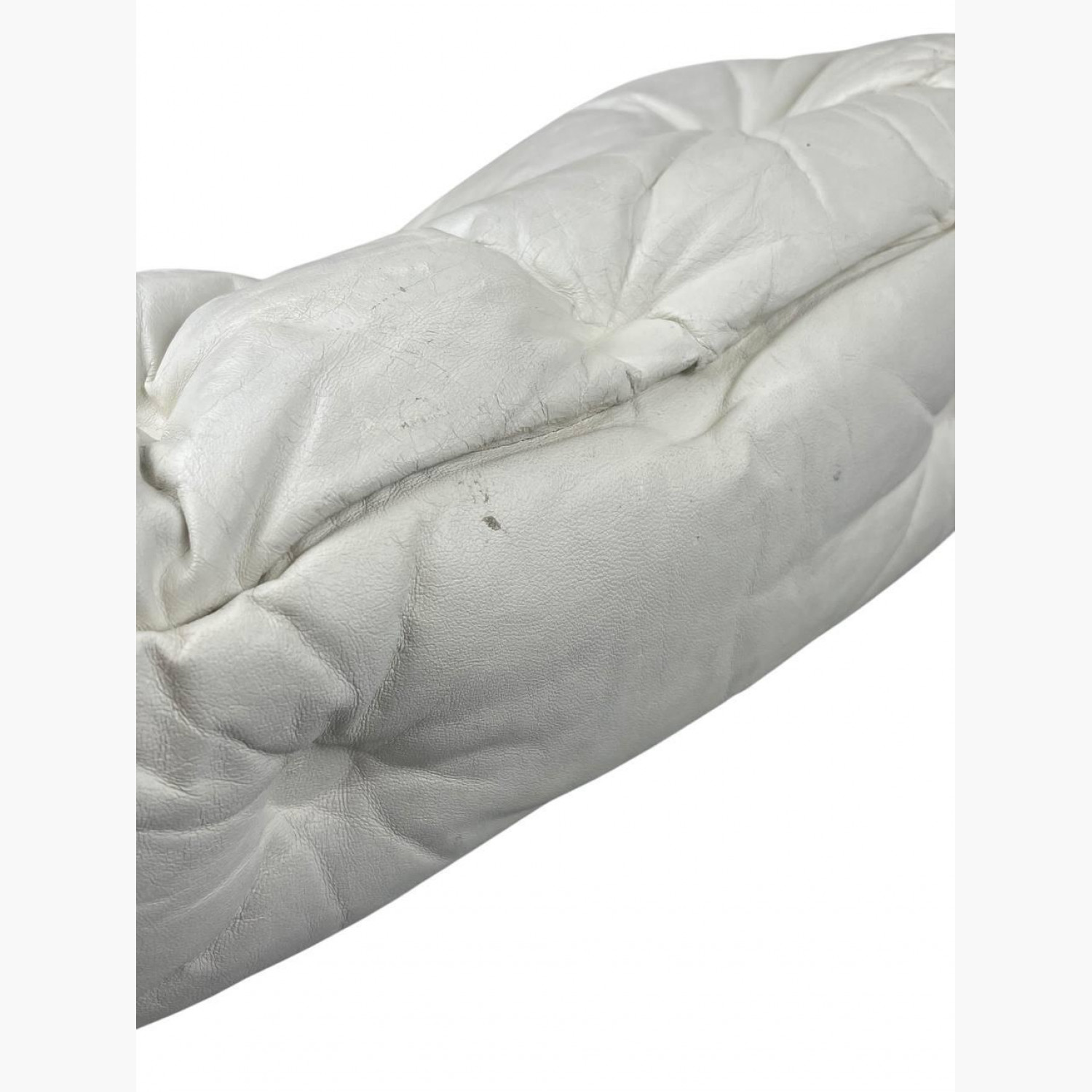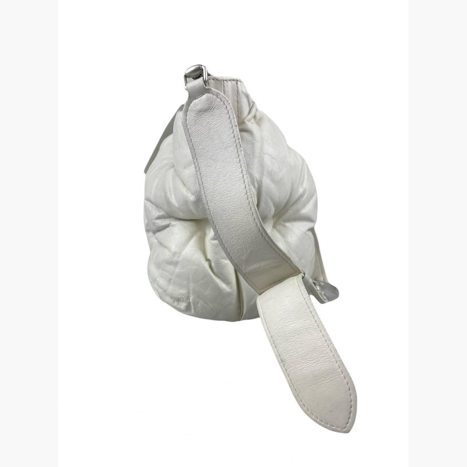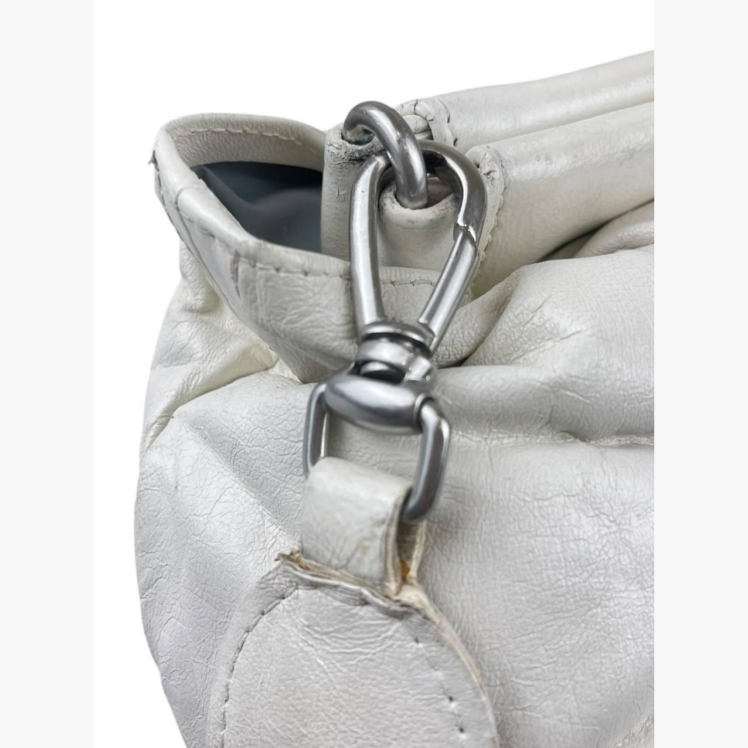 Біла шкіряна пухка сумка на регульованому ремінці. Усередині одне основне відділення без кишень. У хорошому стані, є сліди вжитку.