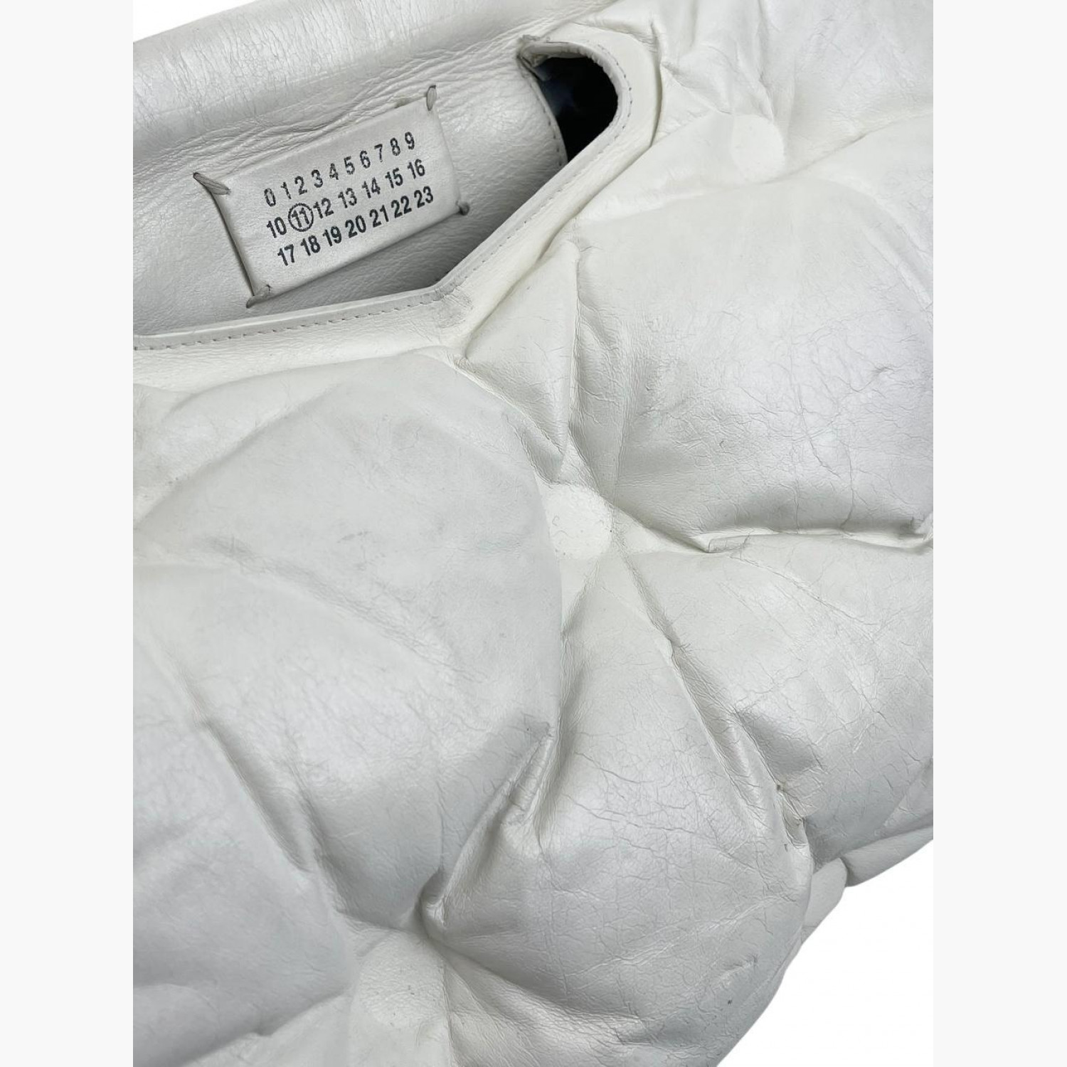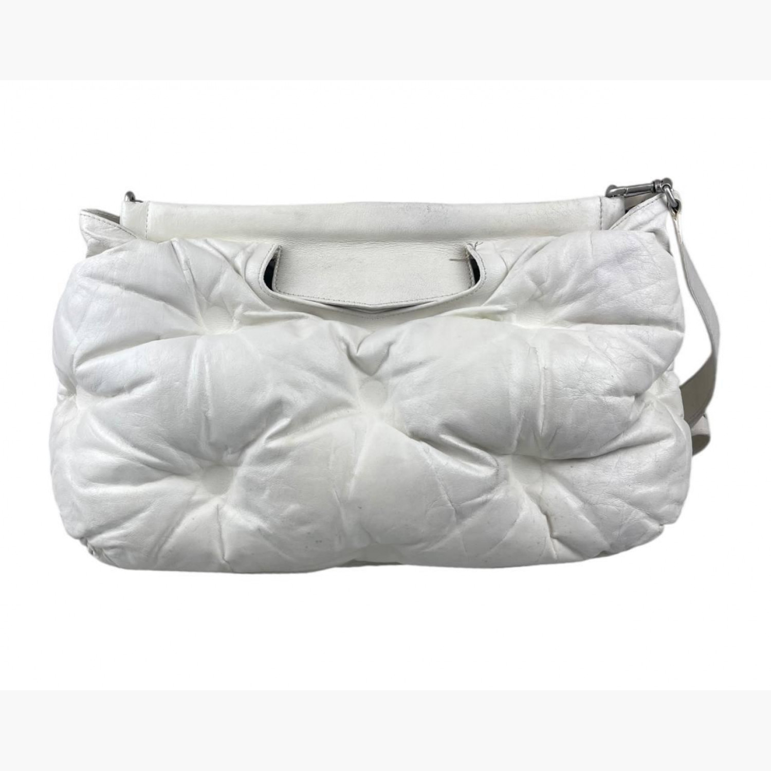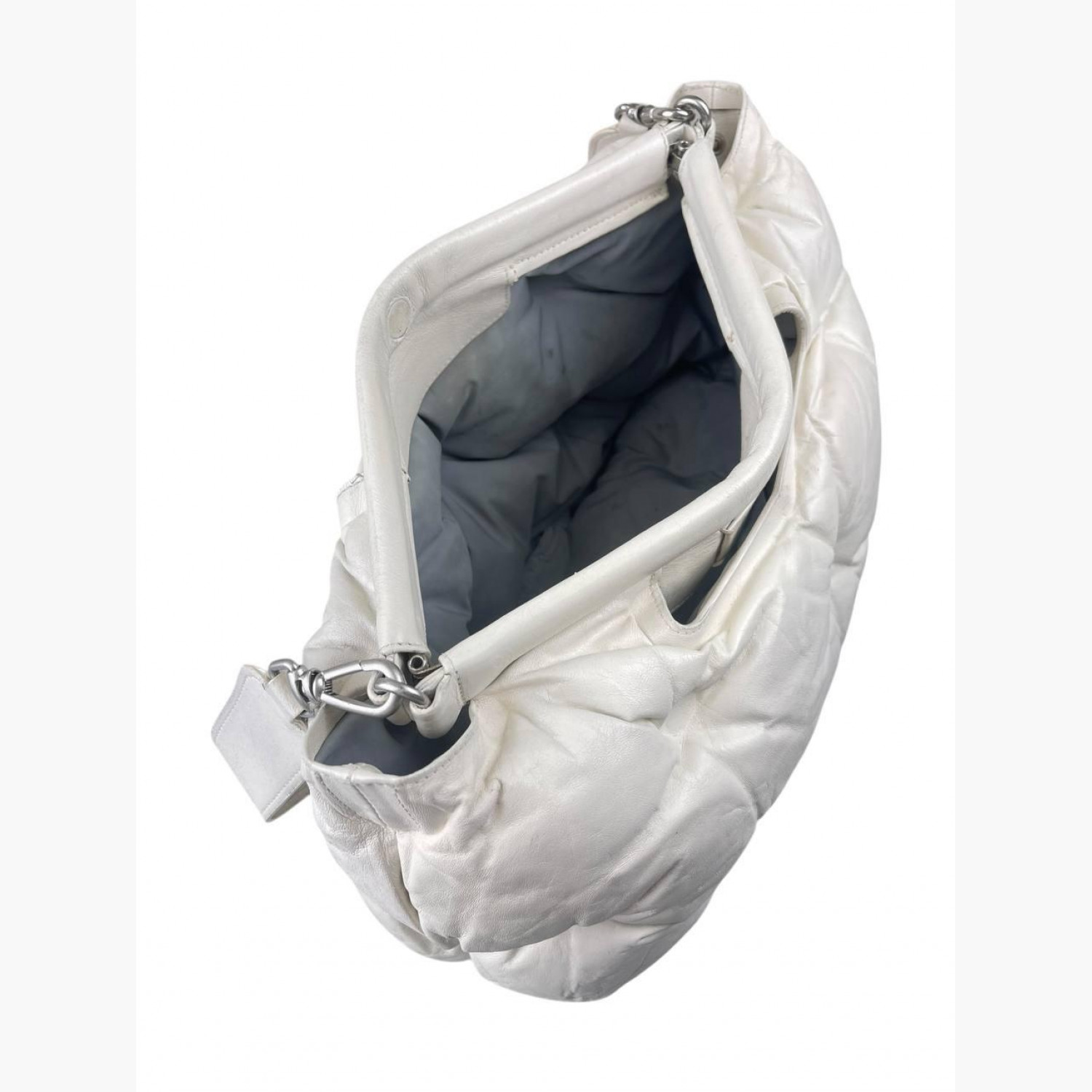 Біла шкіряна пухка сумка на регульованому ремінці. Усередині одне основне відділення без кишень. У хорошому стані, є сліди вжитку.
