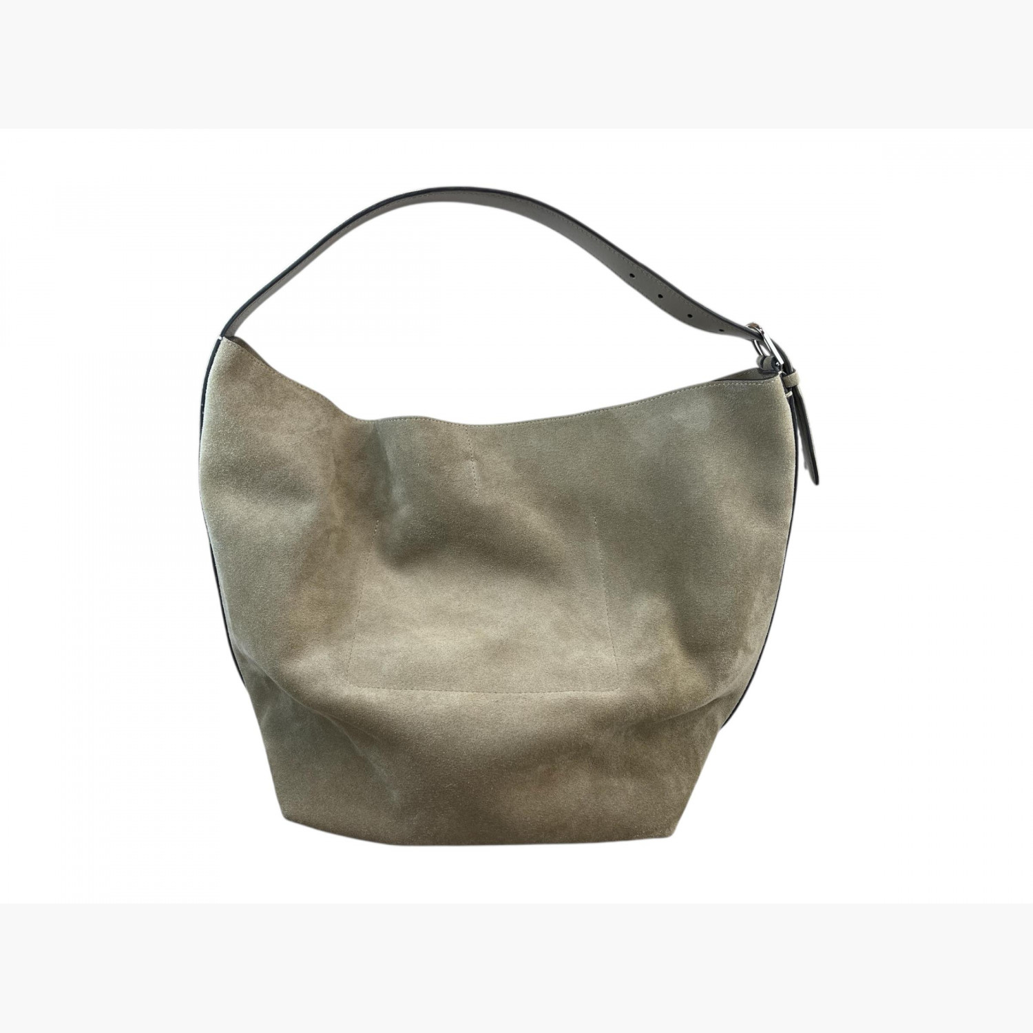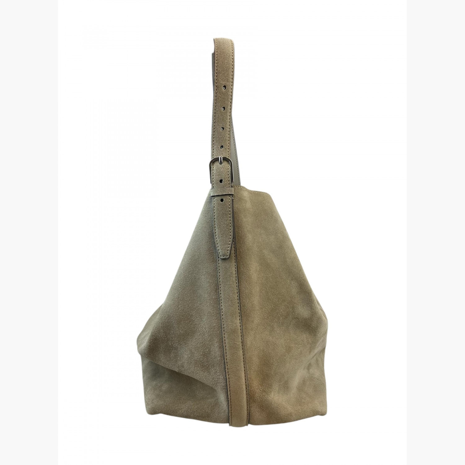 Бежева замшева сумка на ремінці. Усередині — одне основне відділення з великим відкритим кишенею, поверх якого розташована подвійна відкрита кишеня.Абсолютно нова, з біркою.
