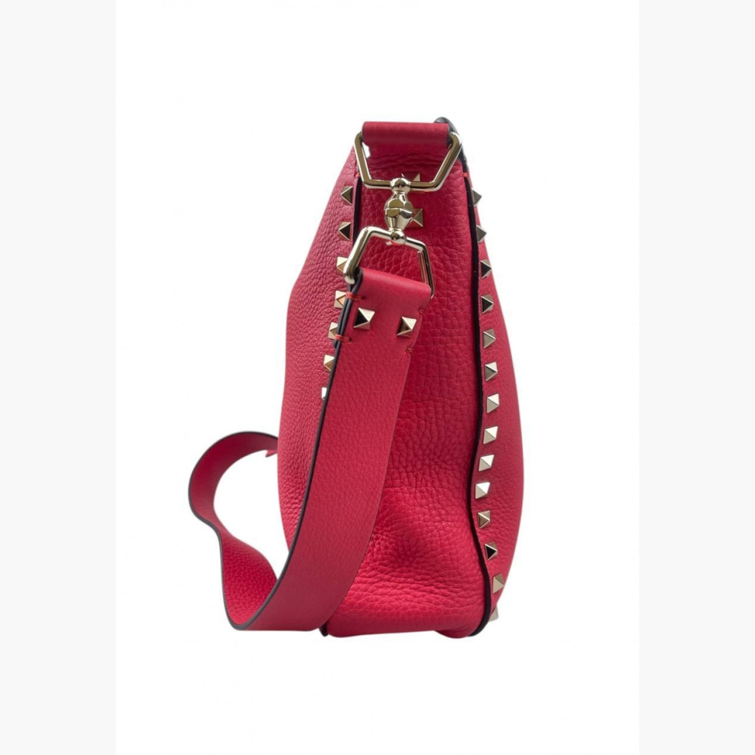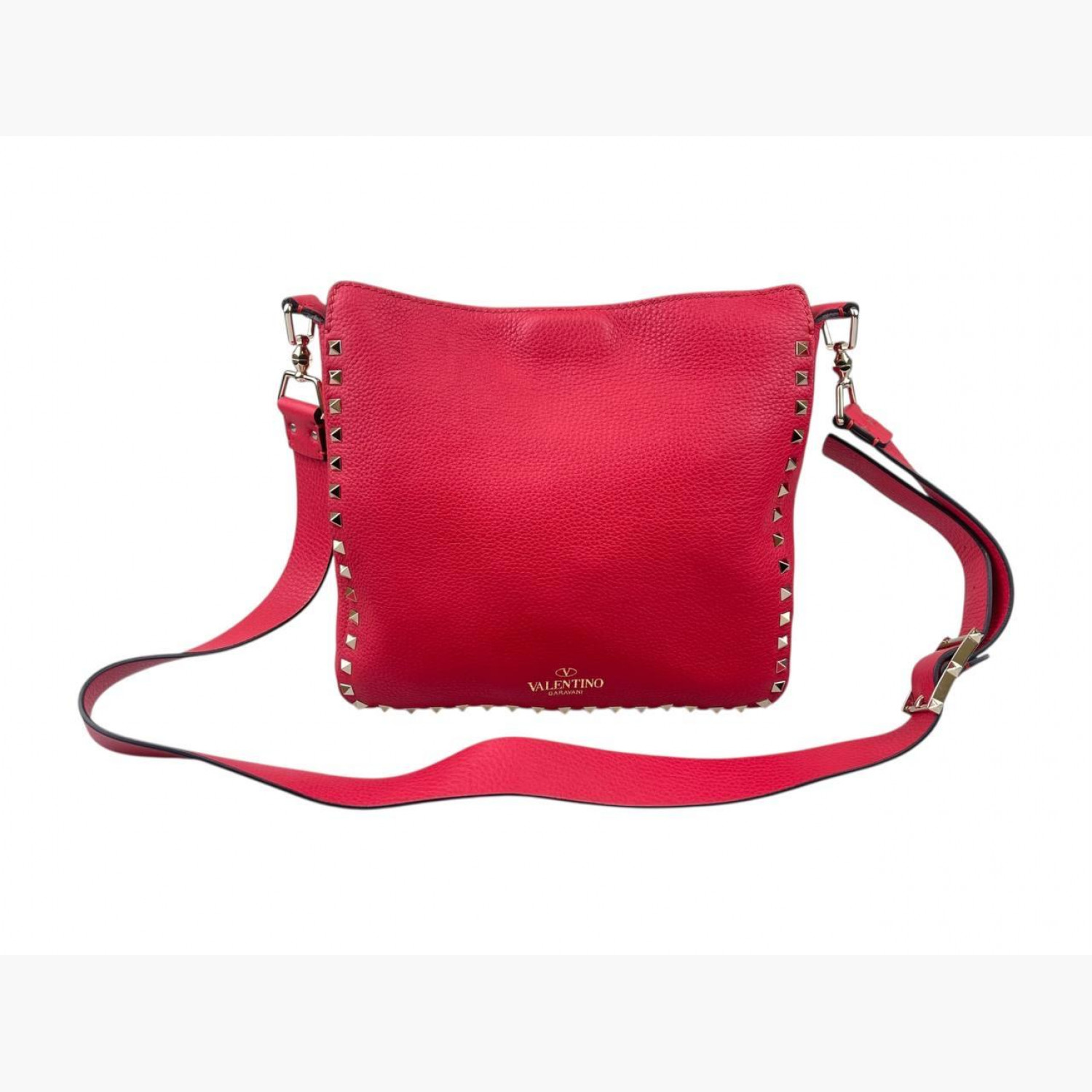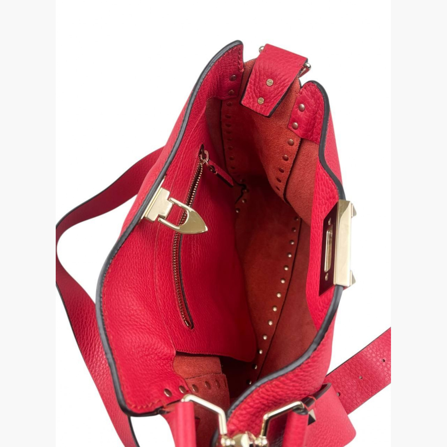 Червона шкіряна сумка з регульованим плечовим ременем. Всередині — одне основне відділення з кишенею на блискавці. У комплекті додаткові шипи. У відмінному стані, без слідів вжитку.