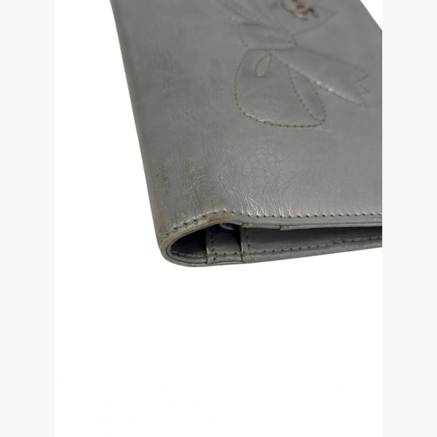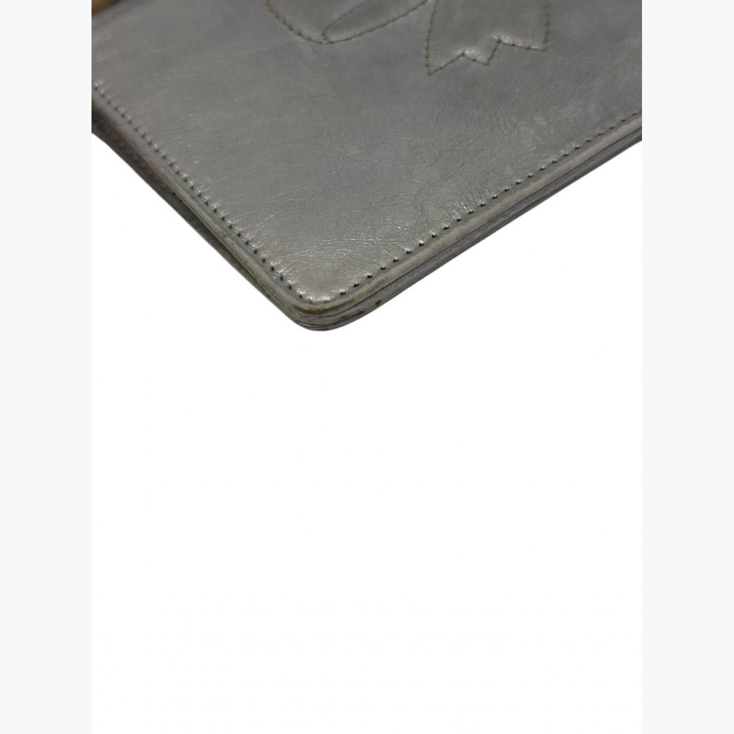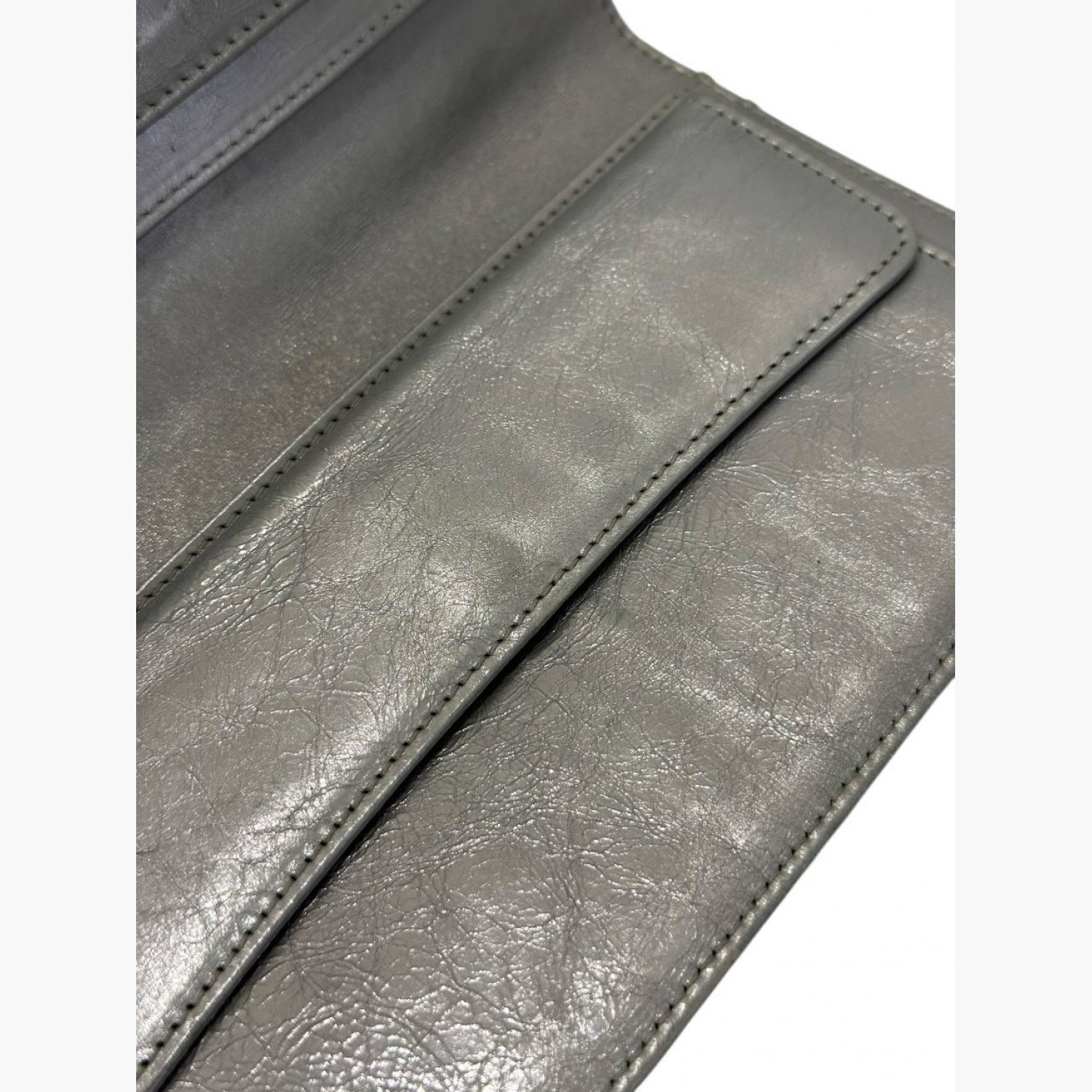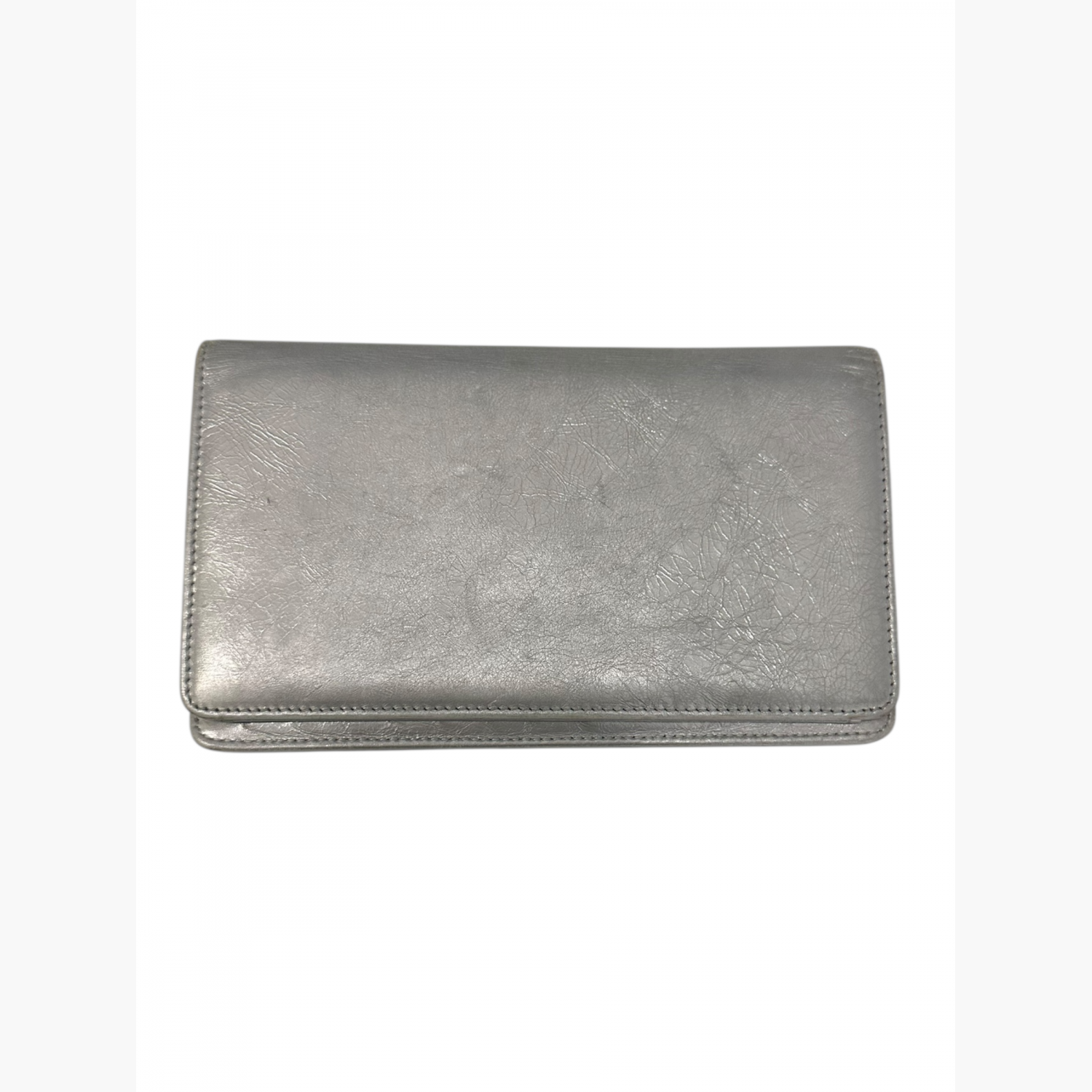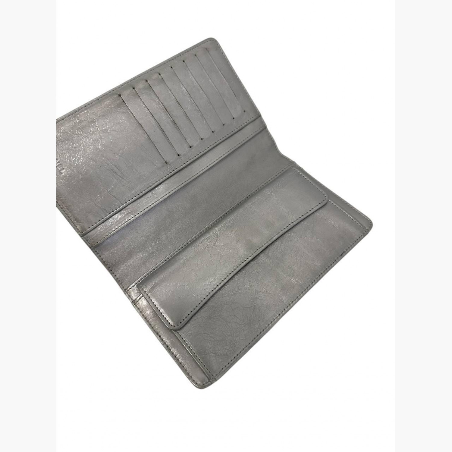Сріблястий шкіряний гаманець. Всередині три відділення, кишеня на кнопці та кілька відсіків для карток. У хорошому стані, є потертості та подряпини.