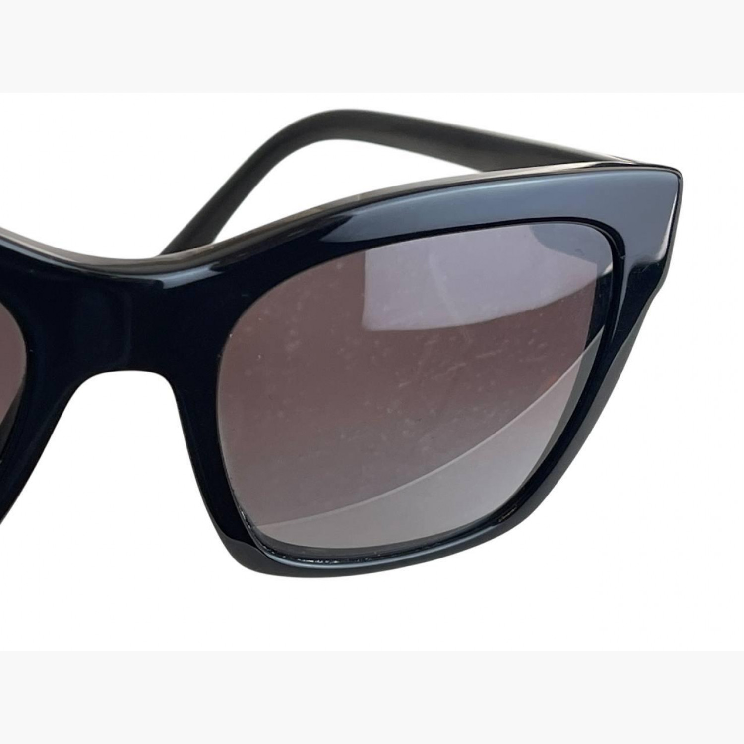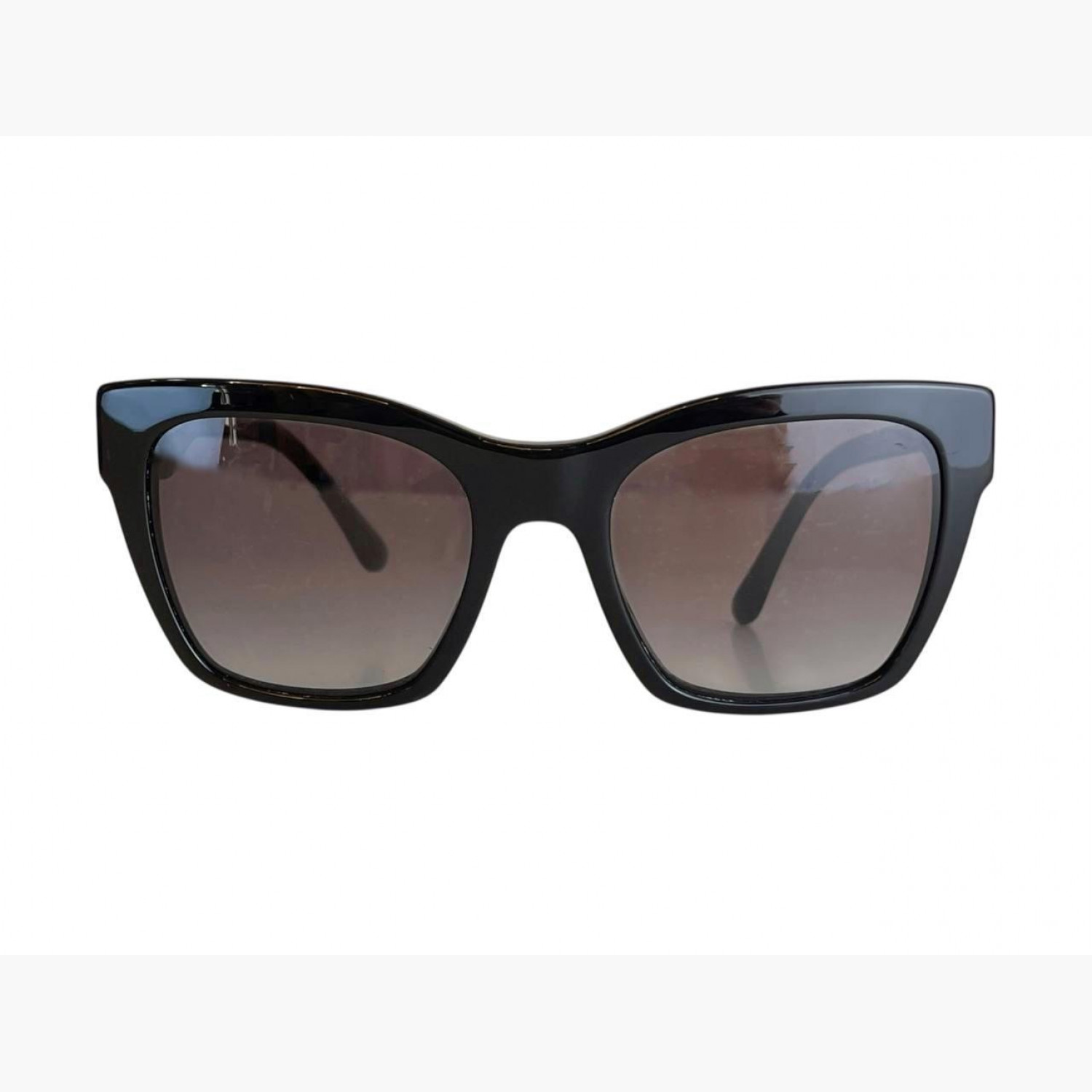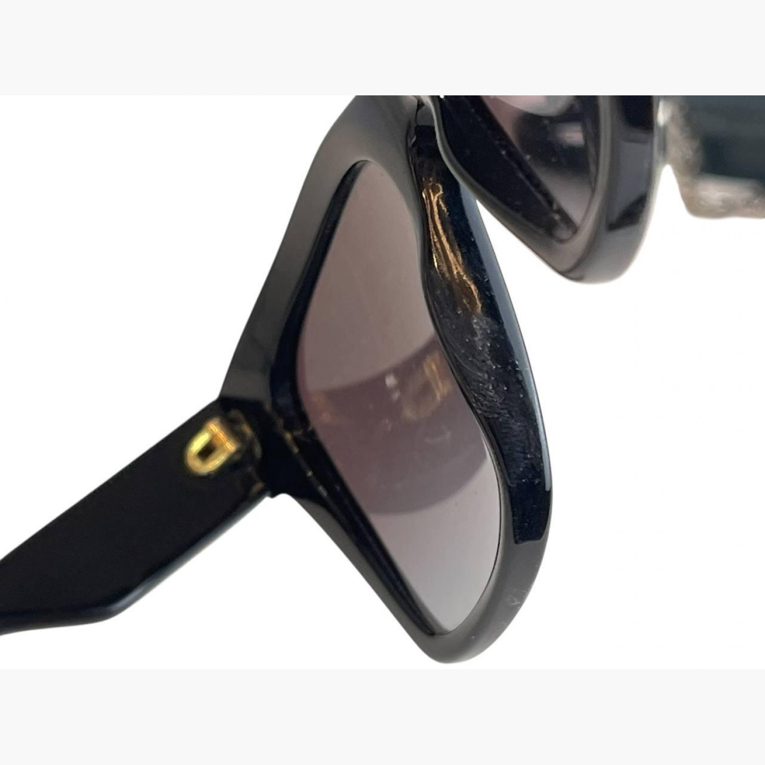 Сонцезахисні чорні окуляри з пластиковою оправою та дужками, на дужках — металевий логотип золотого кольору, форма лінз cat eye. У комплекті — оригінальний футляр. У хорошому стані, є сліди вжитку.