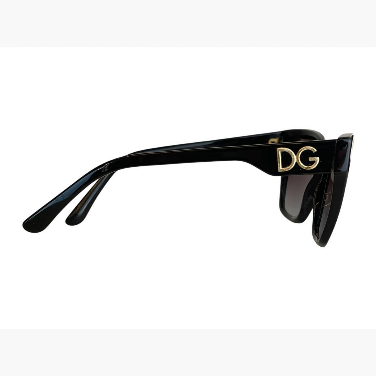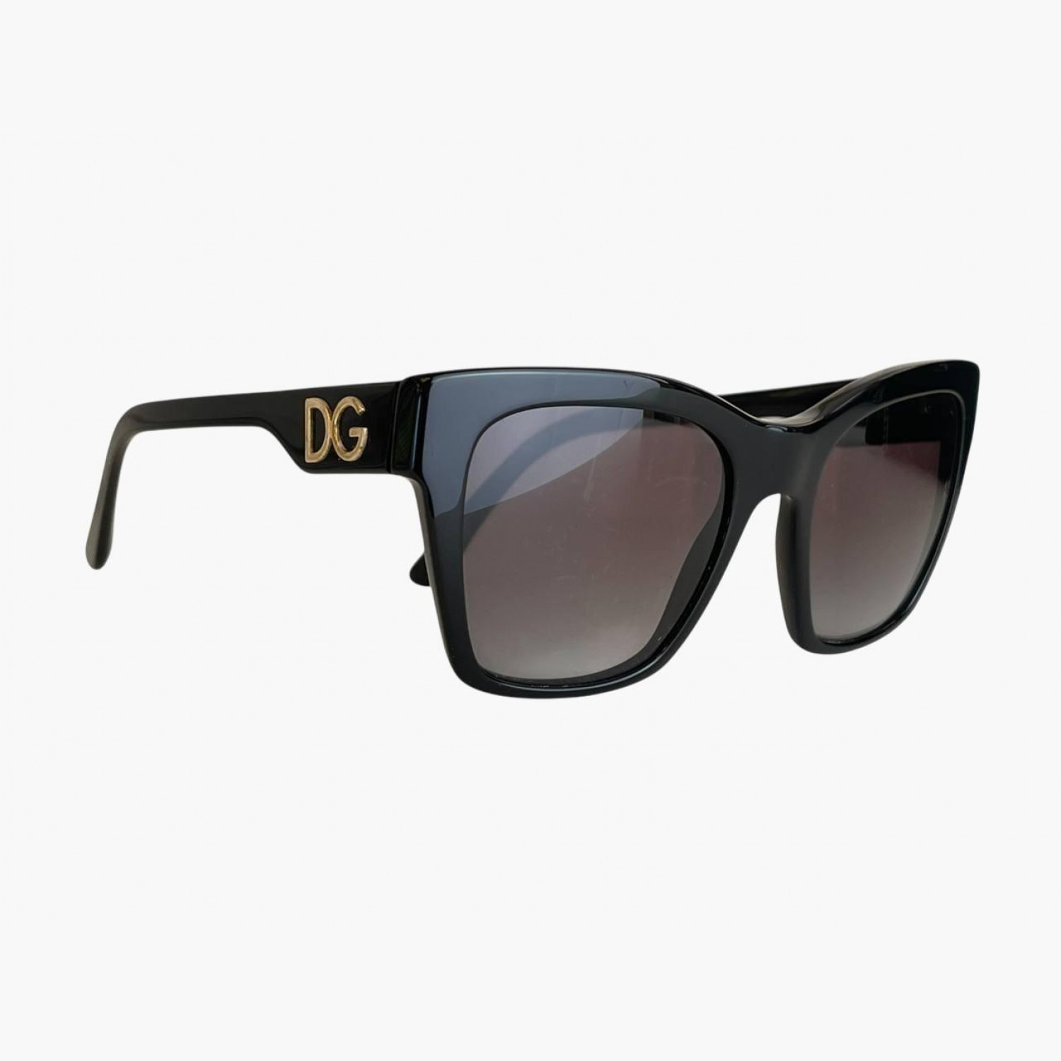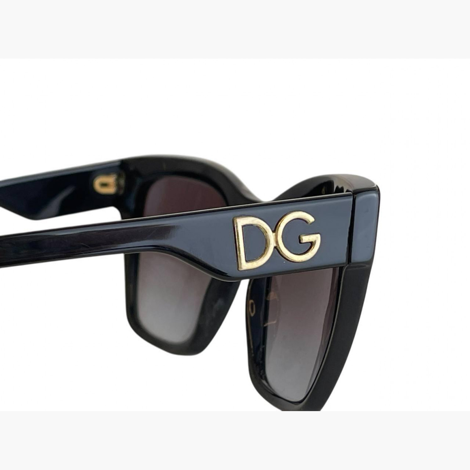 Сонцезахисні чорні окуляри з пластиковою оправою та дужками, на дужках — металевий логотип золотого кольору, форма лінз cat eye. У комплекті — оригінальний футляр. У хорошому стані, є сліди вжитку.