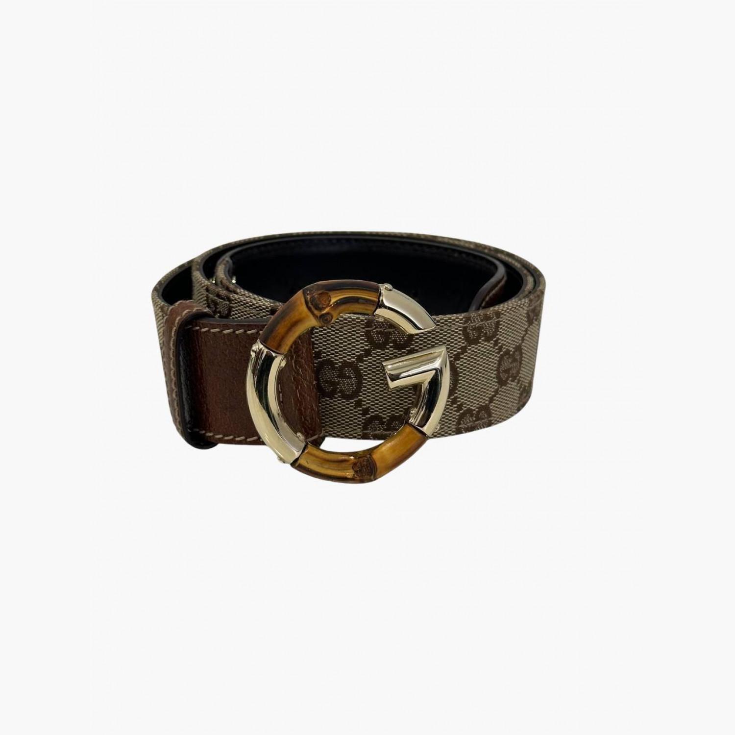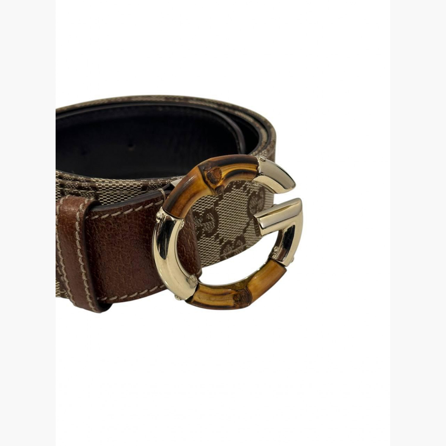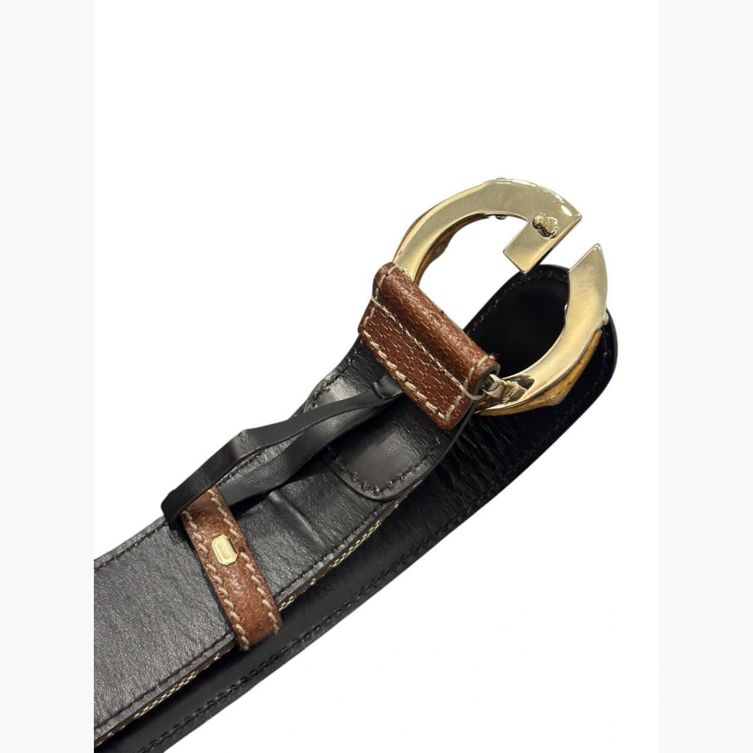 Коричневий текстильний ремінь з шкіряними вставками. У хорошому стані, є потертості.