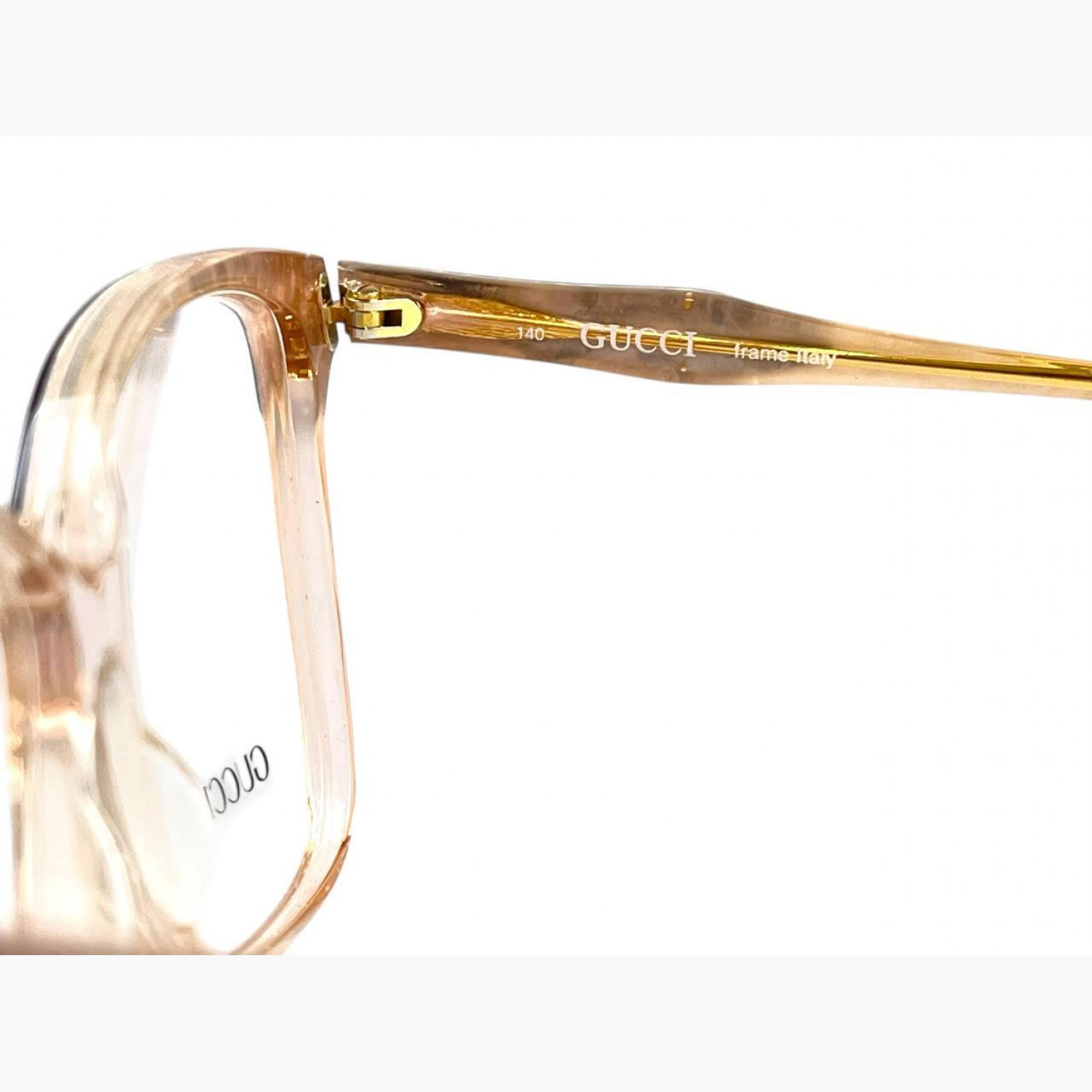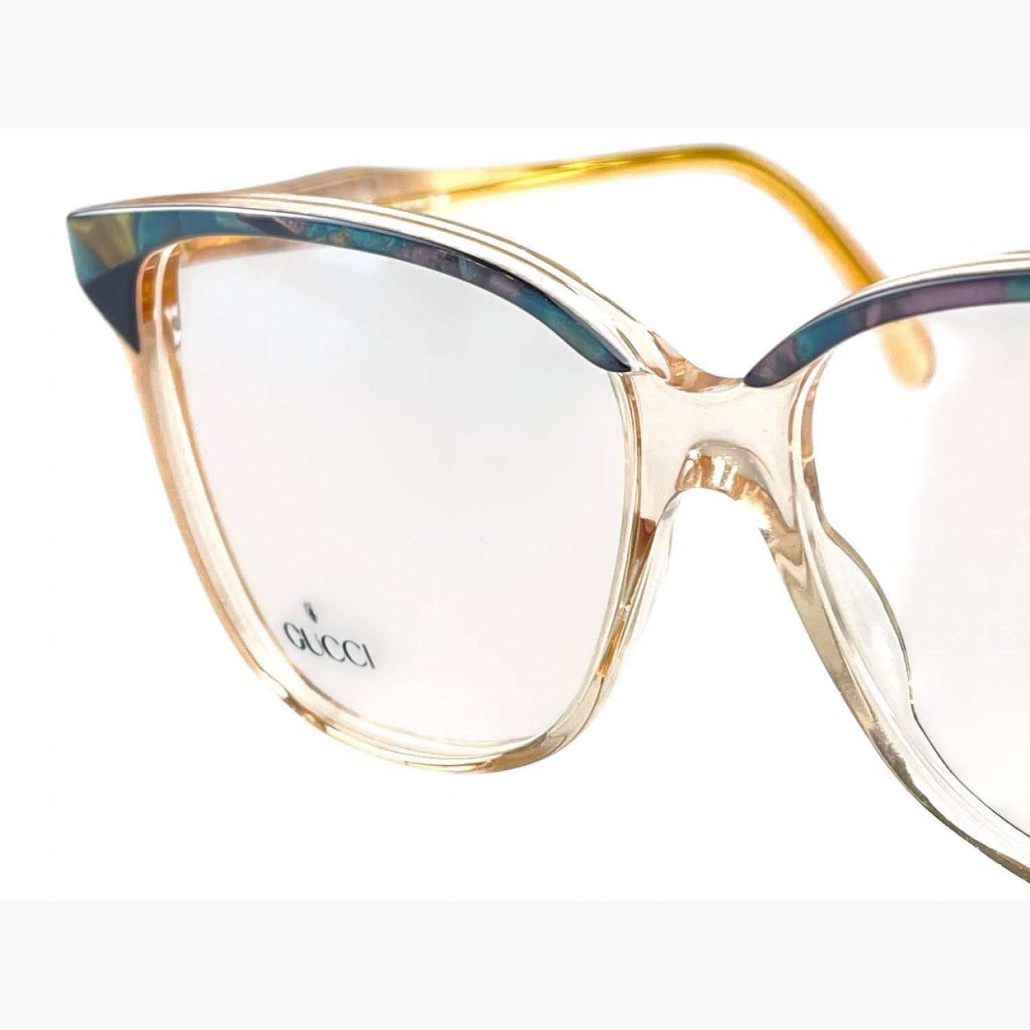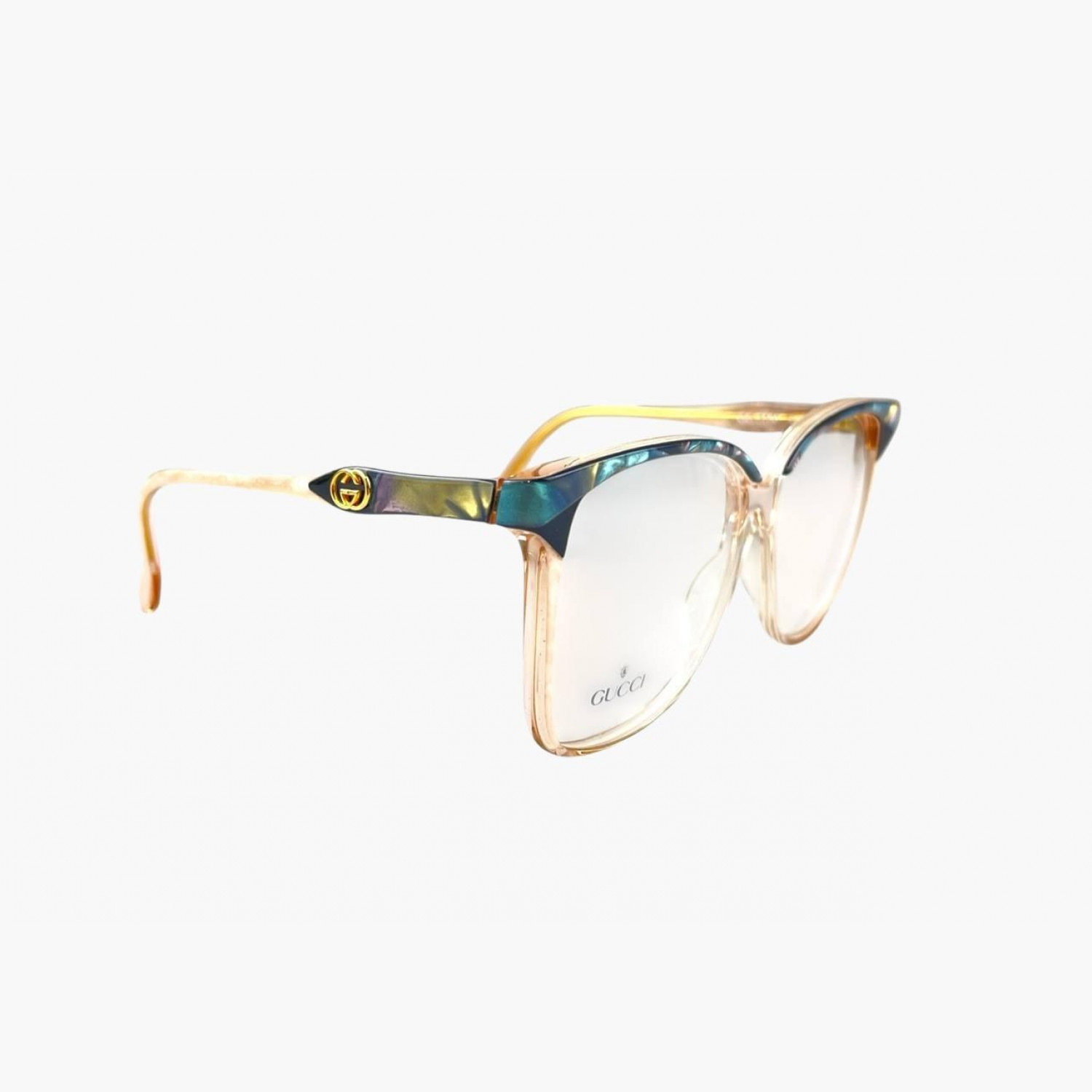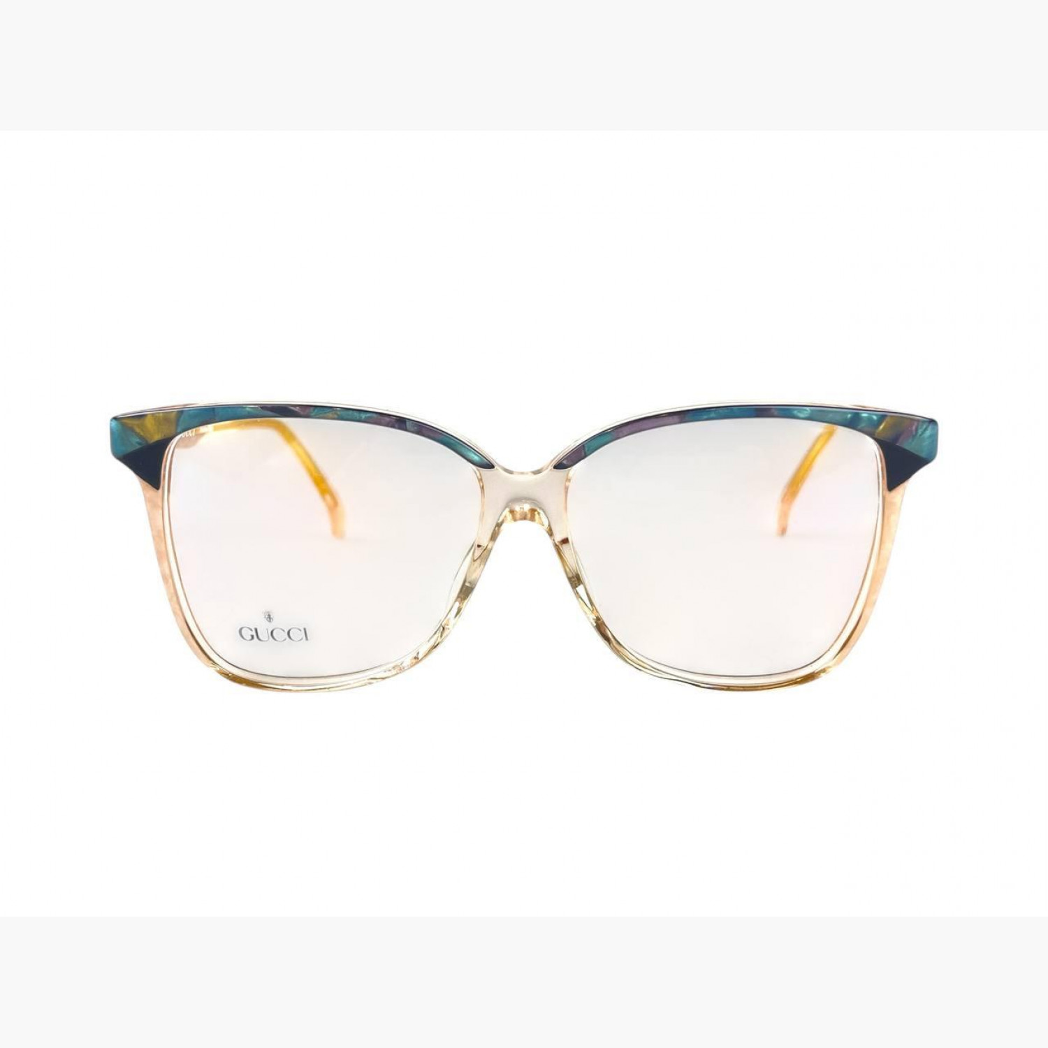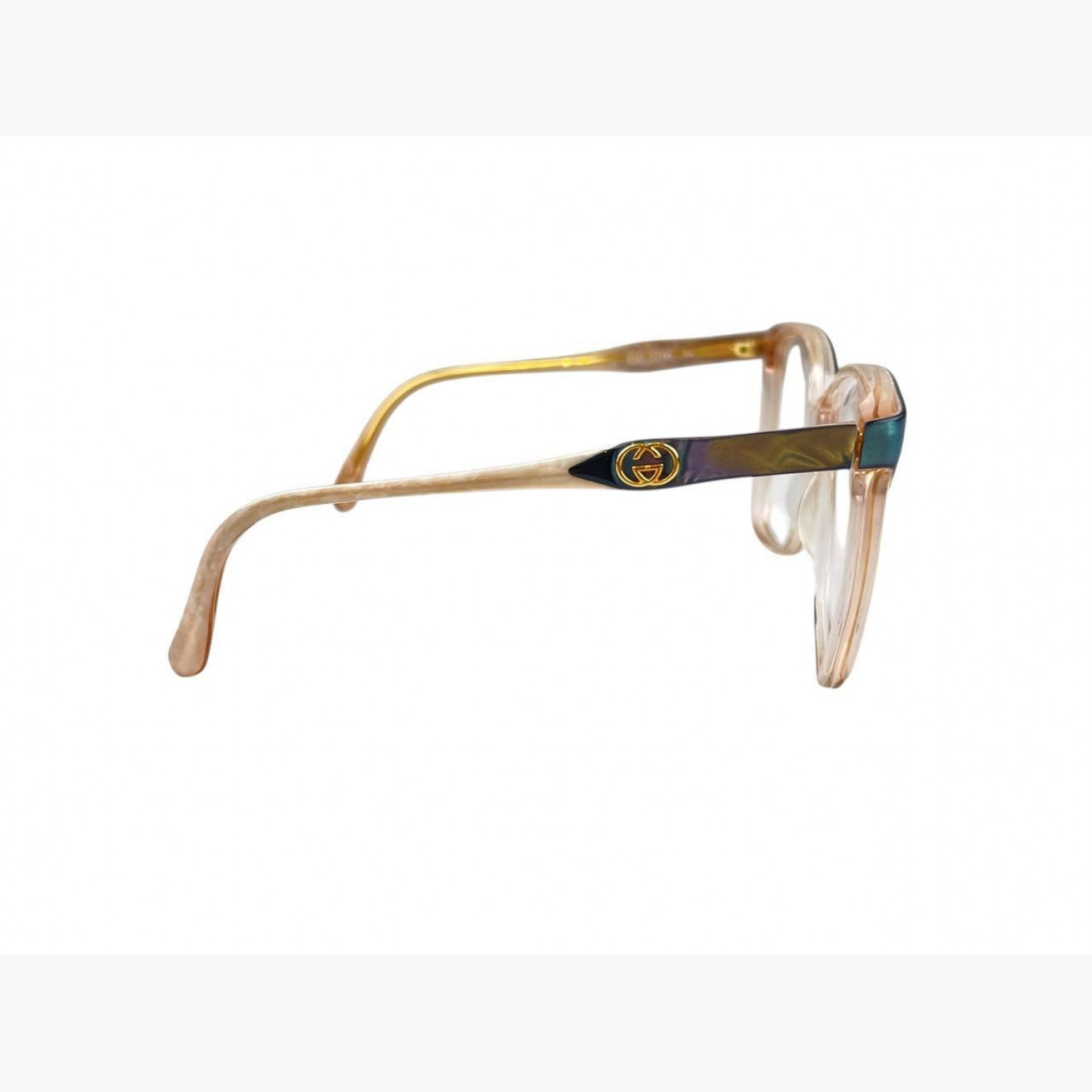 Окуляри з прозорими лінзами, синьою оправою та мармуровими дужками світло-рожевого кольору. У відмінному стані, без слідів вжитку.