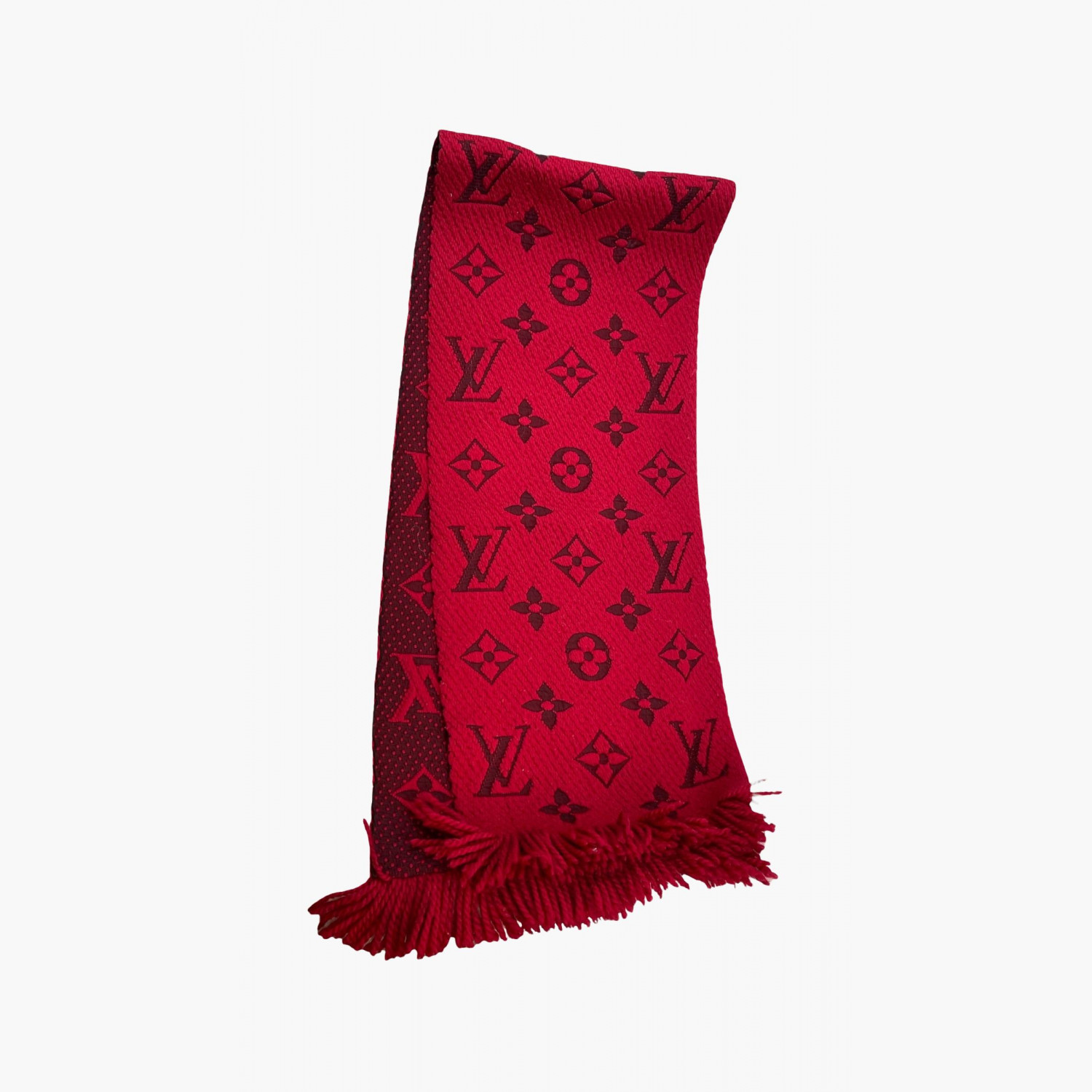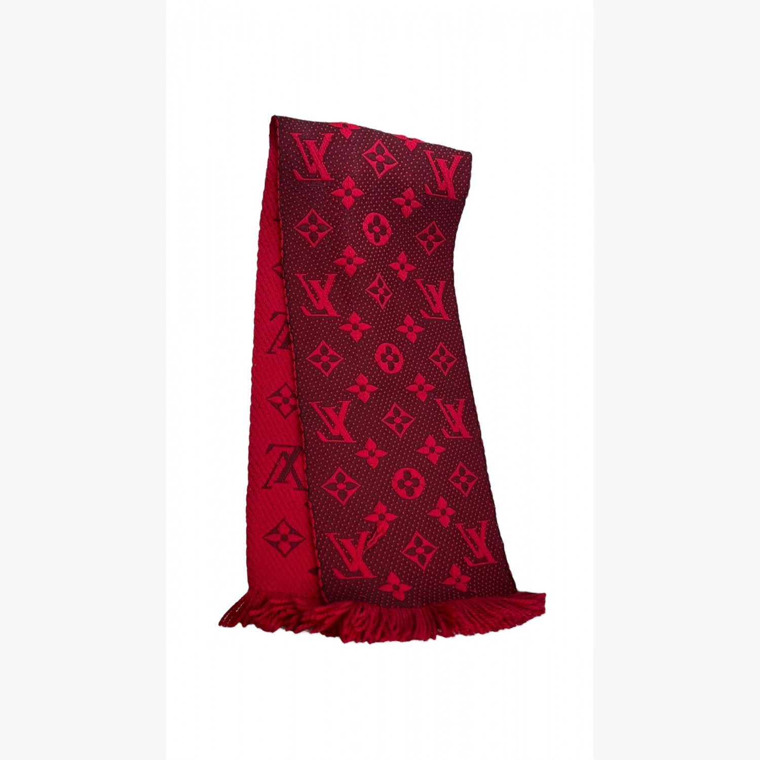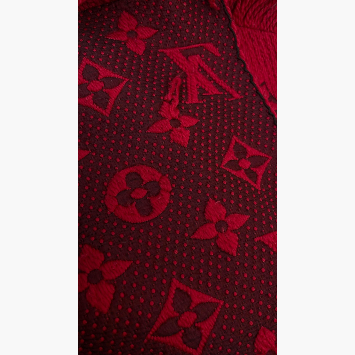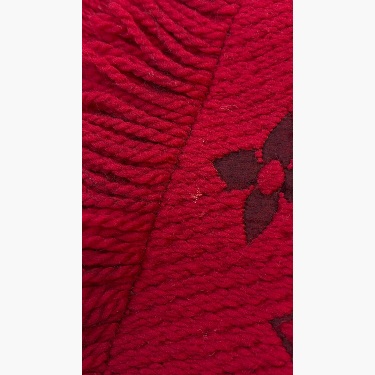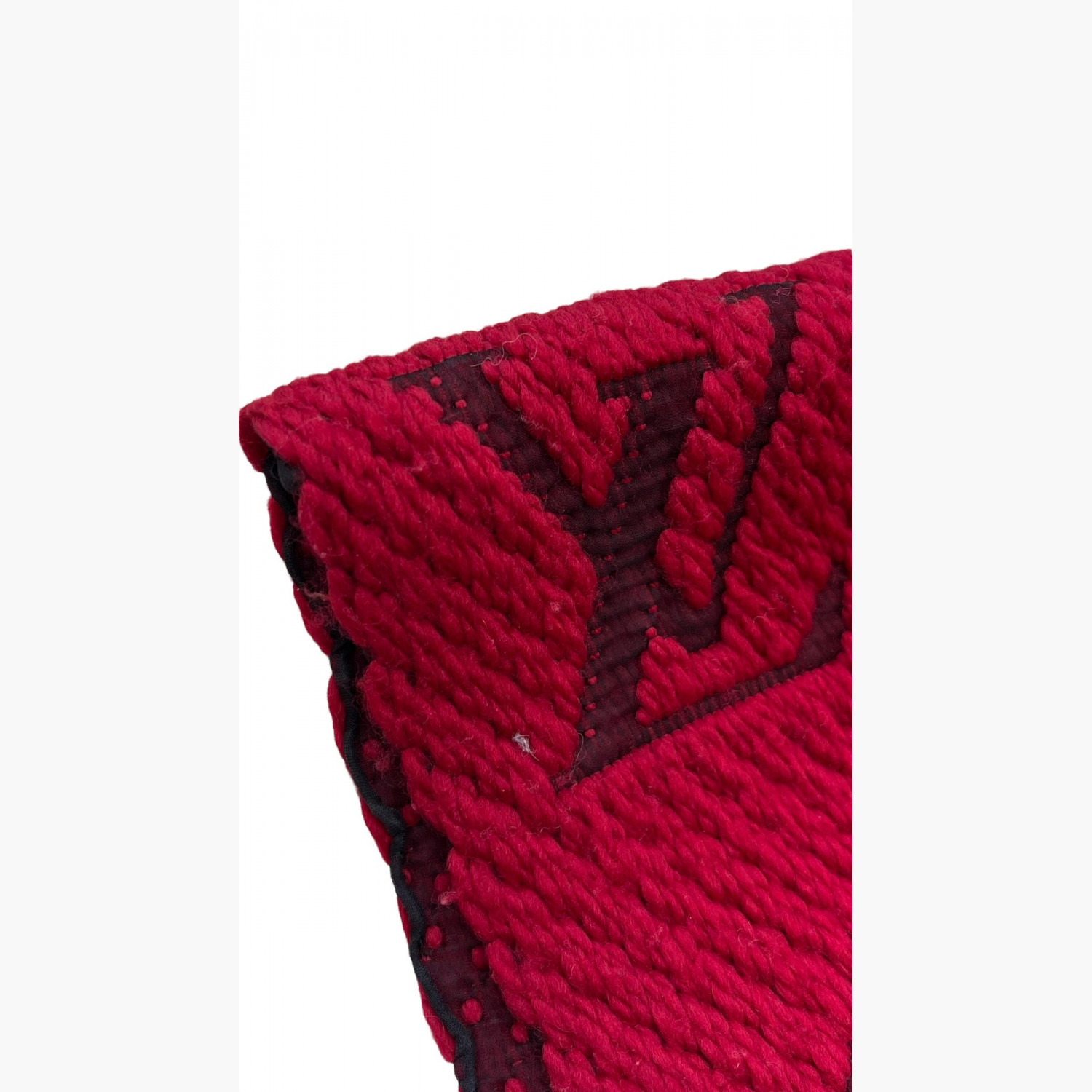 Червоний вовняний шарф з логотипом і бахромою по краях. Склад: 94% вовна, 6% шовк. У гарному стані, є пляма, кошлатість і затяжка.