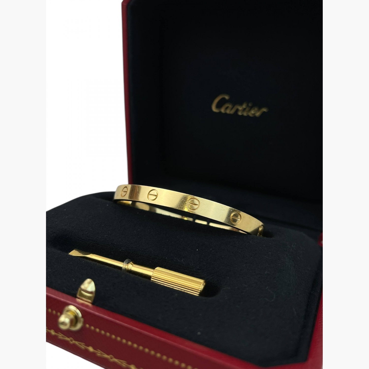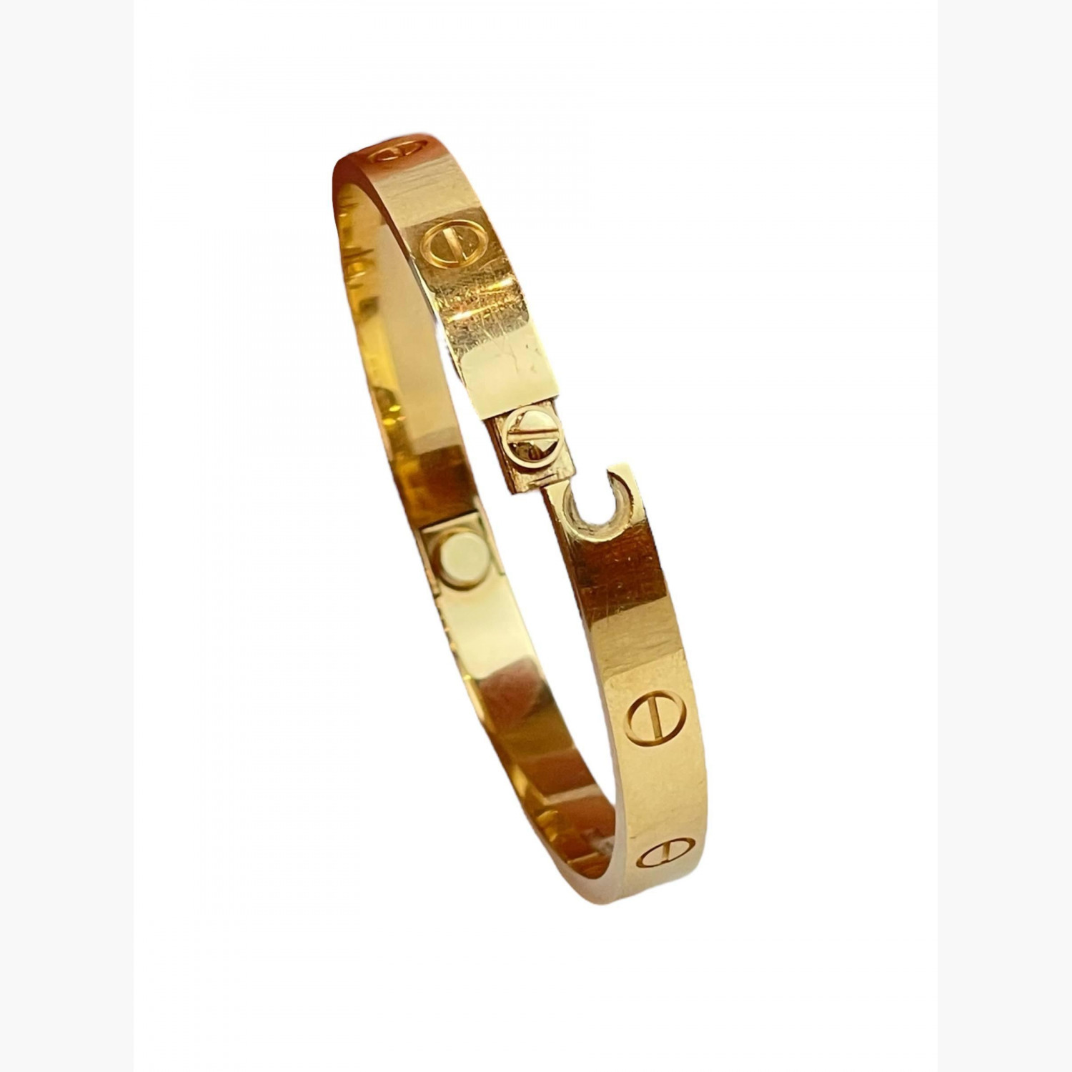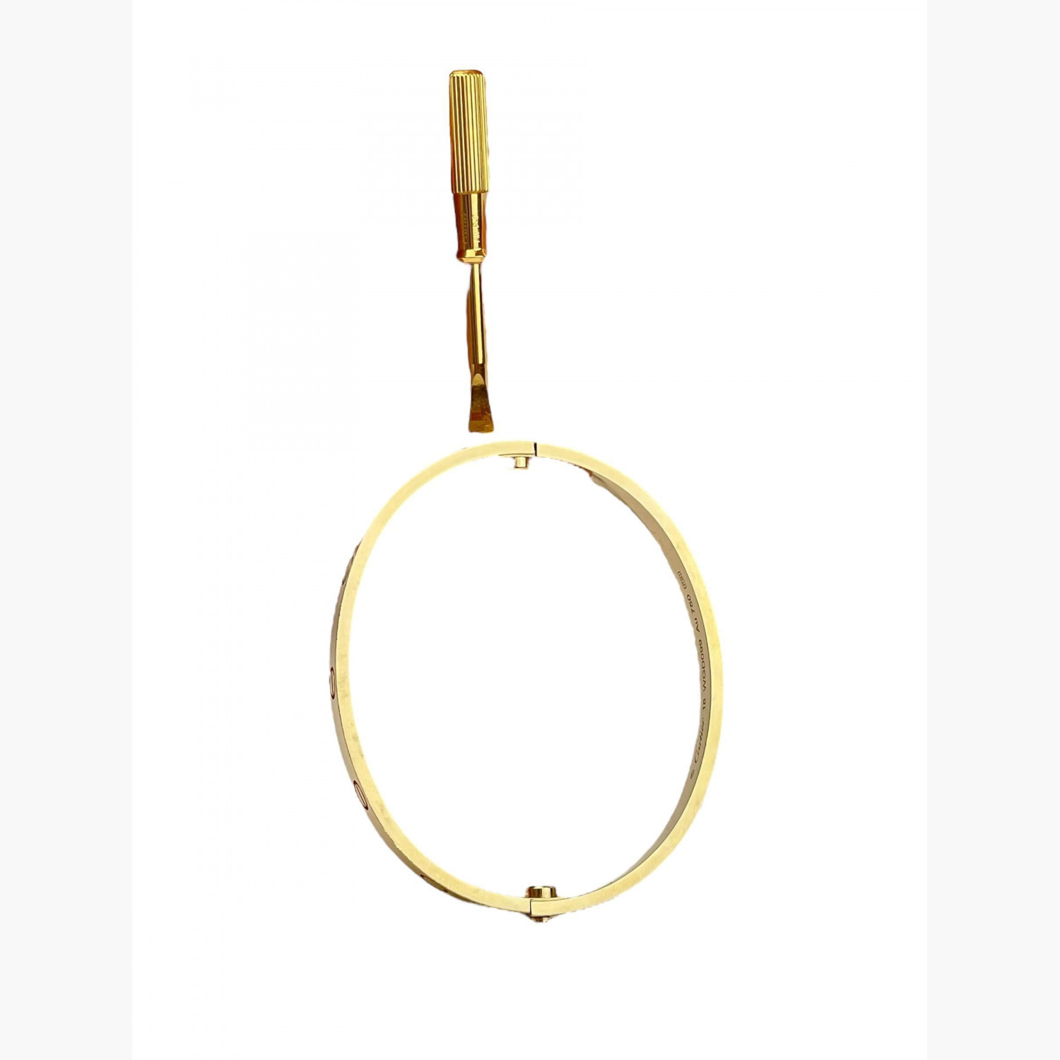 Золотий браслет із гвинтами, що складається з двох половинок, які з’єднуються на зап’ясті за допомогою спеціальної мініатюрної викрутки. У комплекті — пильник, викрутка та засіб для догляду.У відмінному стані, є незначні потертості.