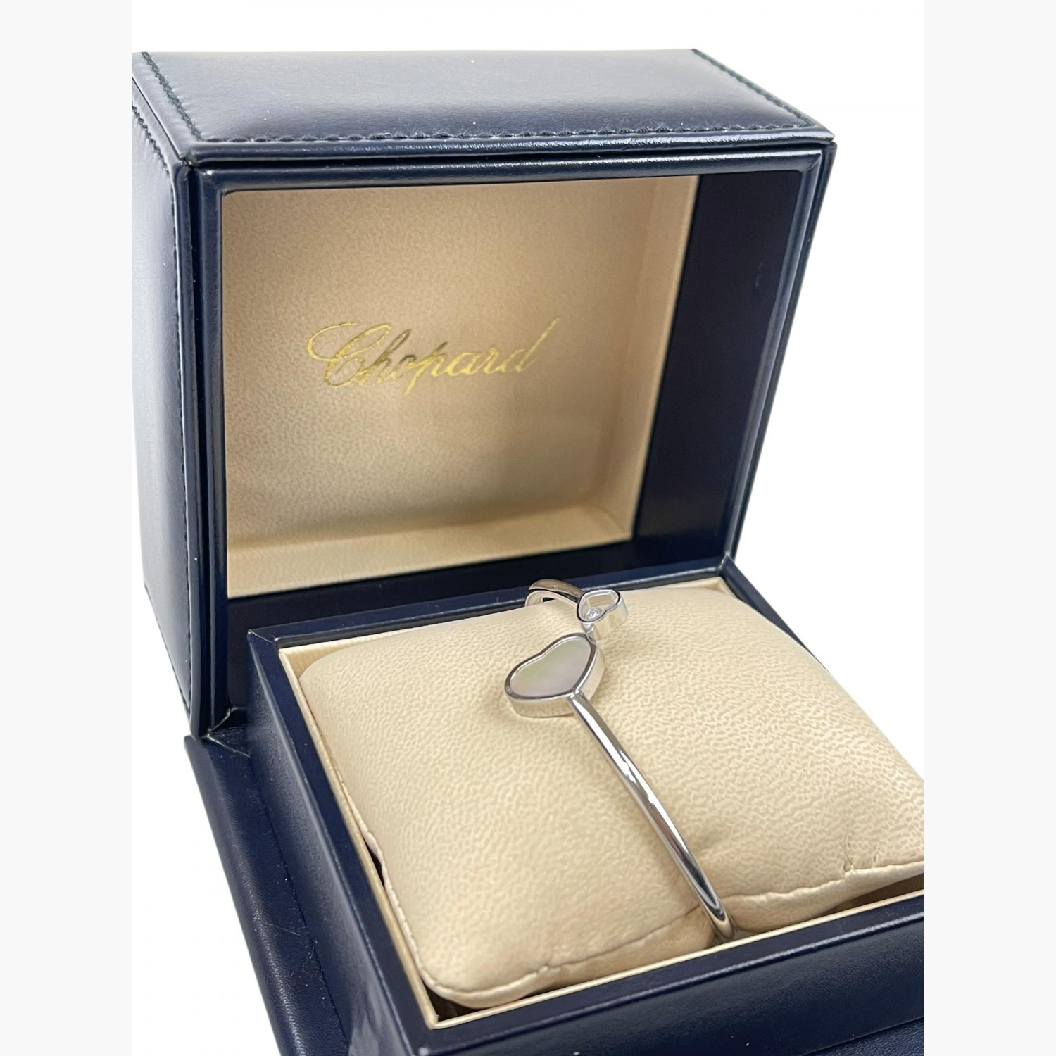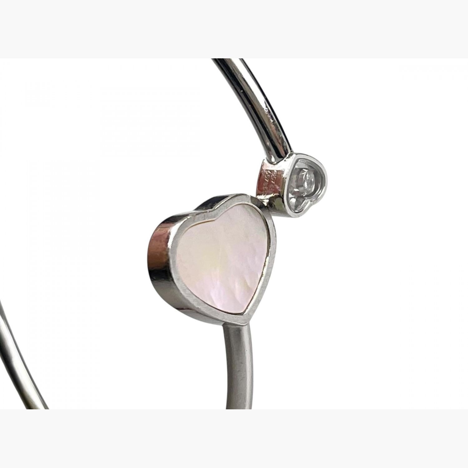 Браслет виготовлений із білого золота, кінчик оздоблений перламутровим серцем. У комплекті є книжечка з догляду. У хорошому стані, наявні ледь помітні сліди вжитку.
