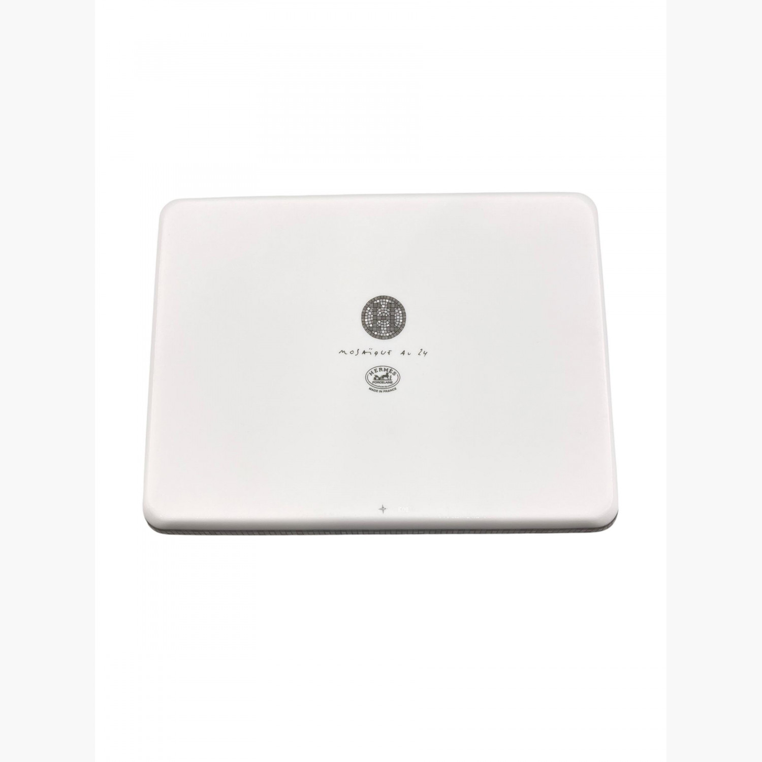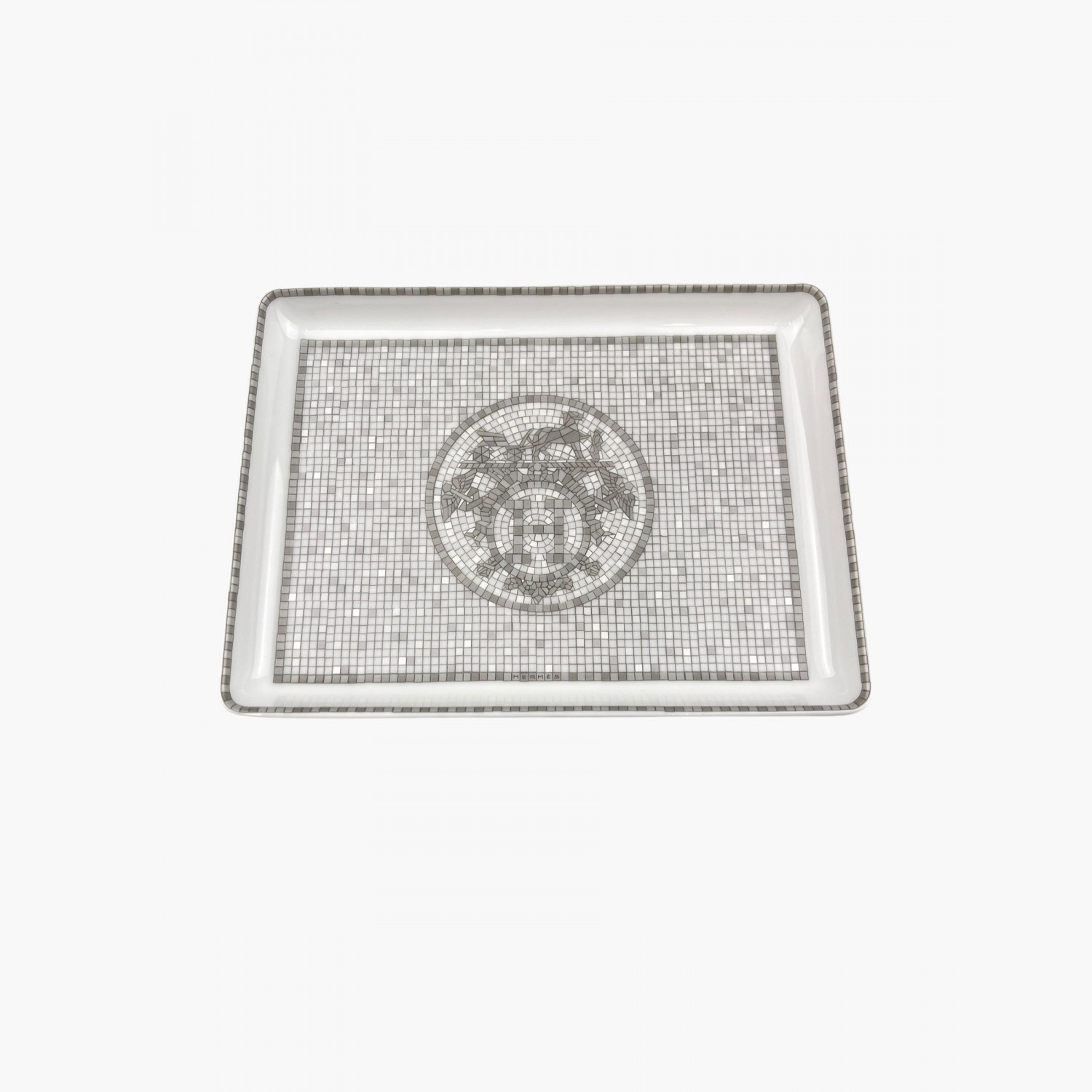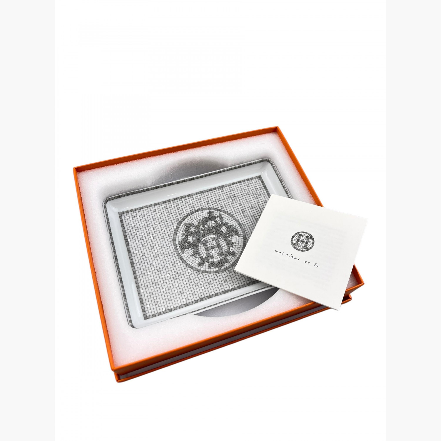 Сіра прямокутна тарілка виготовлена з ліможського фарфору та прикрашена платиновими деталями. У центрі тарілки зображено емблему бренду у вигляді мозаїки. Абсолютно нова.