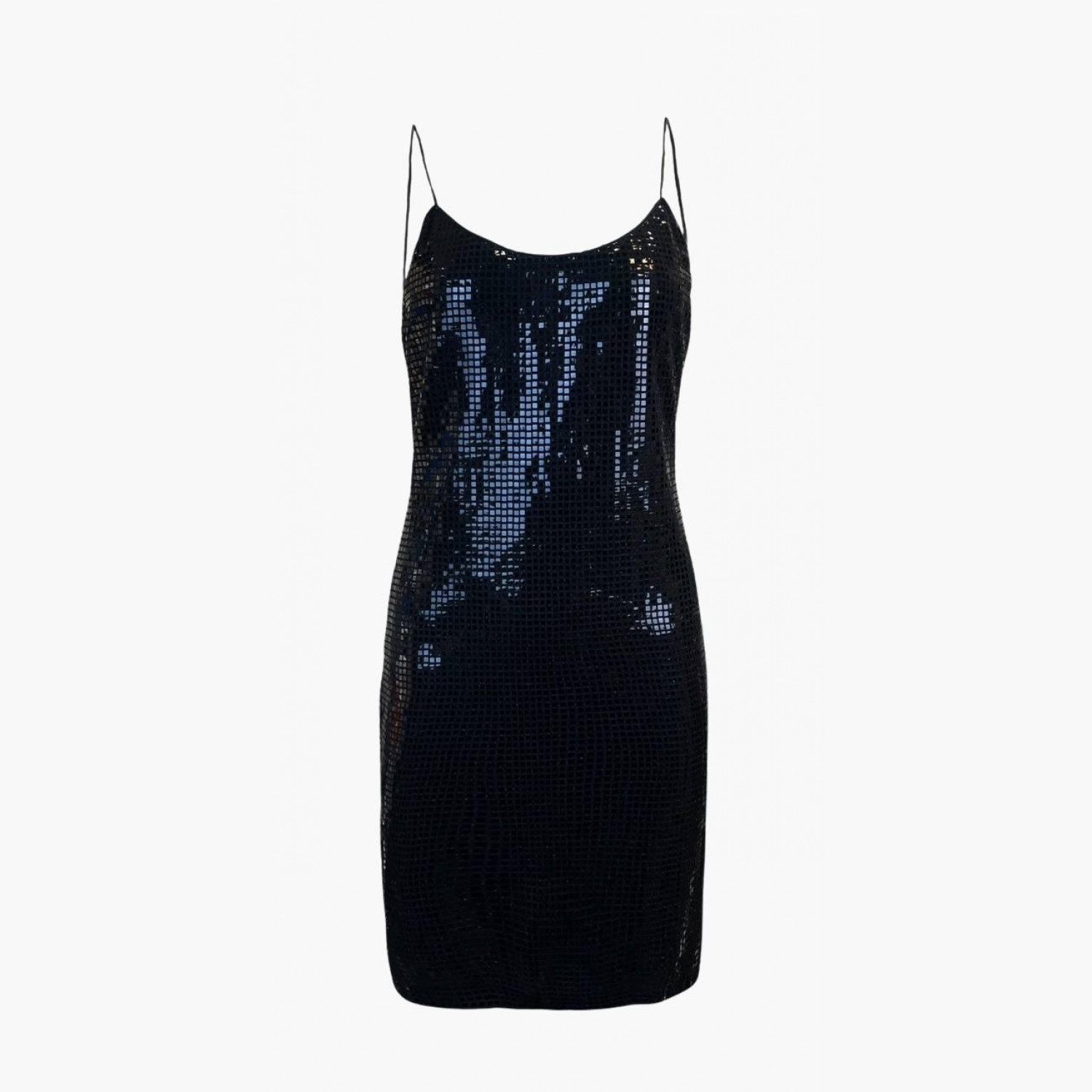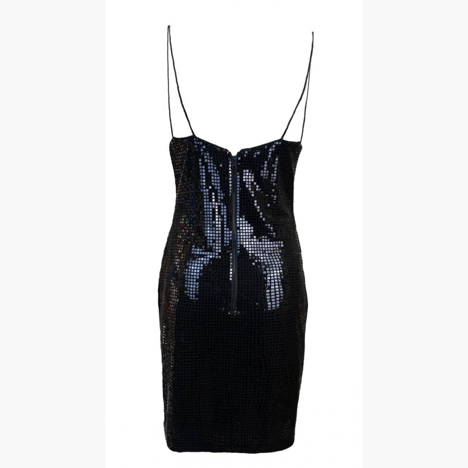 Чорна сукня на тонких бретельках у паєтках, на блискавці, з біркою. Склад: основний матеріал — 93% нейлон, 3% поліестер, 4% еластан; підкладка — 84% нейлон, 16% еластан. Абсолютно нова.