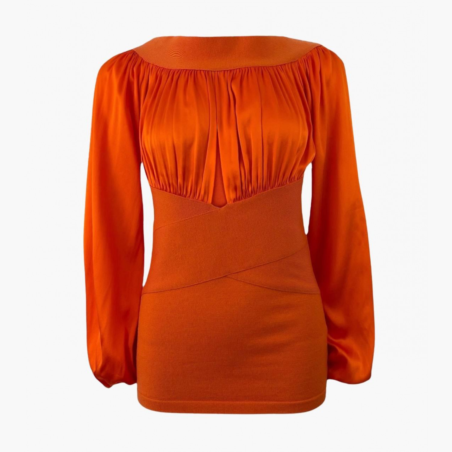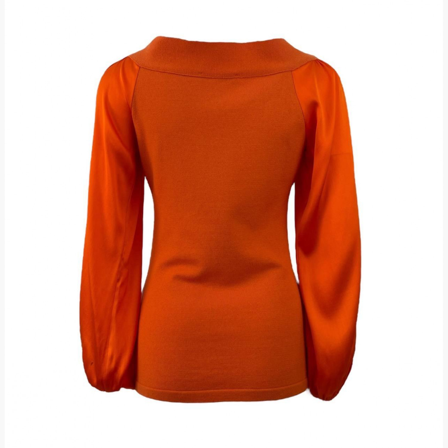 Помаранчева вовняна блуза з атласними рукавами на резинці. Склад: 90% вовна, 10% поліестер. У хорошому стані, є сліди вжитку.