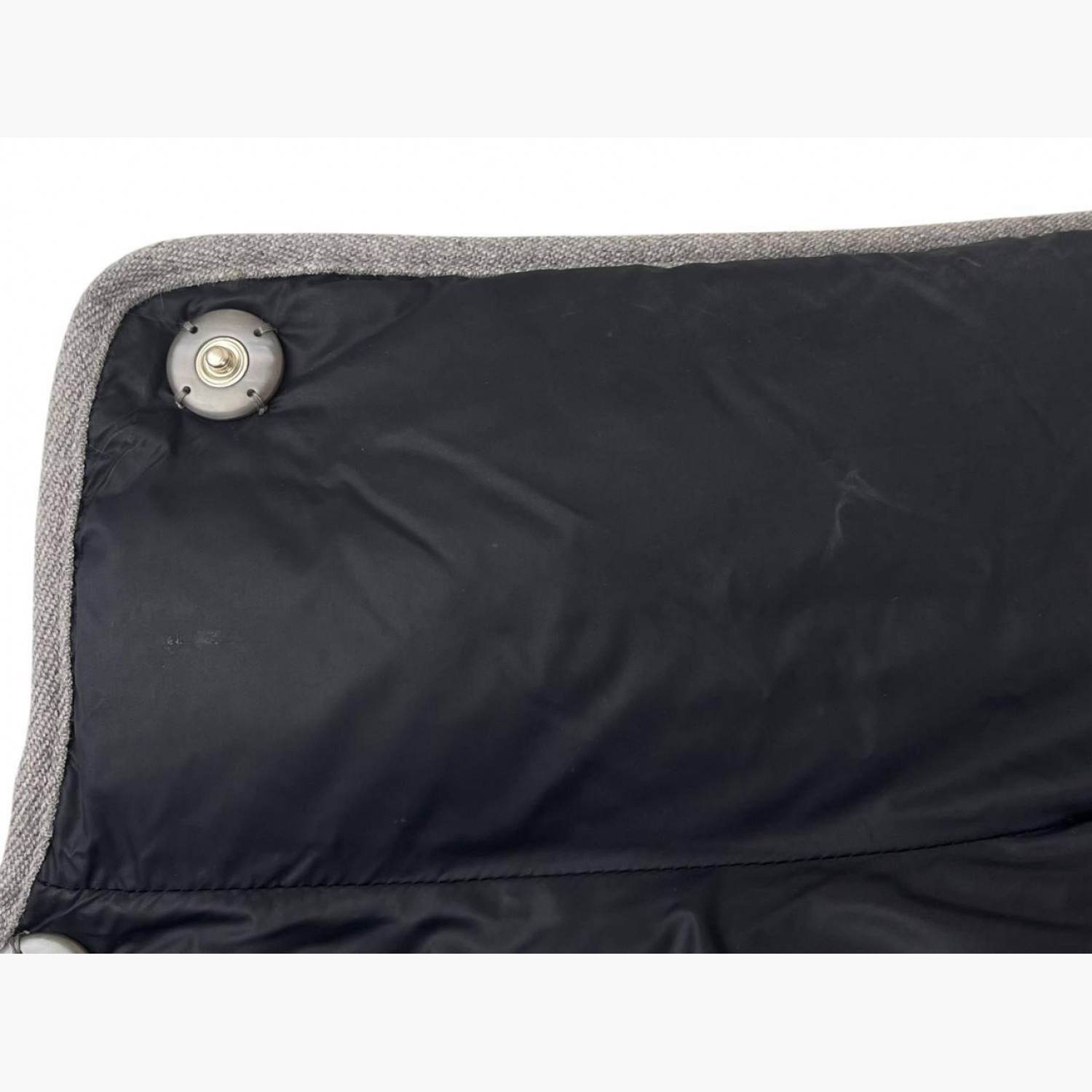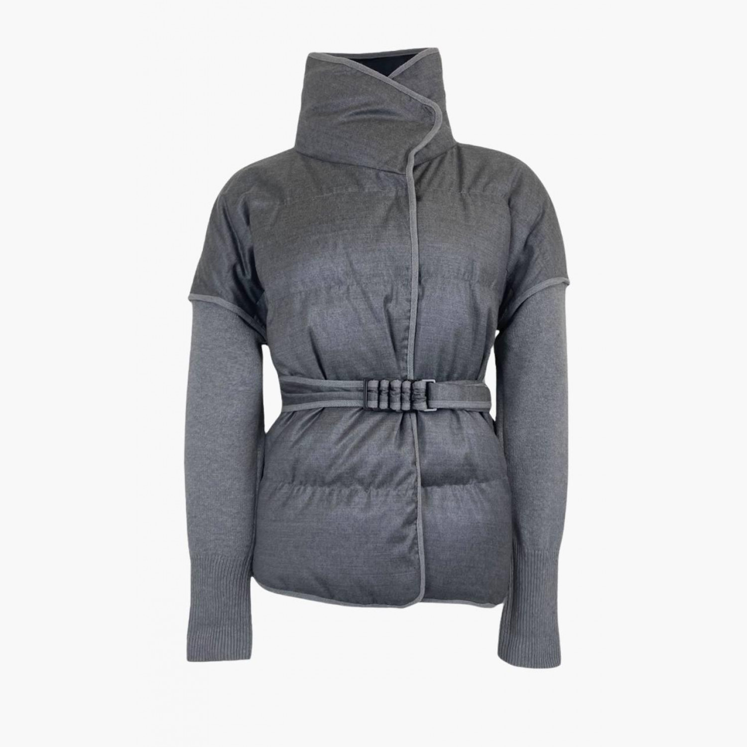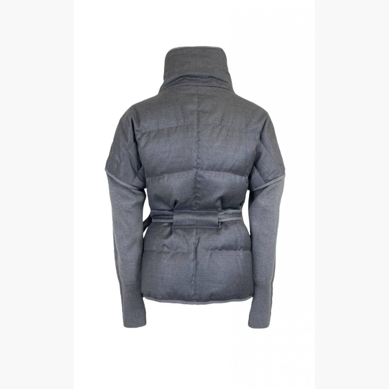 Сірий кашеміровий пуховик із трикотажними рукавами в рубчик. Склад: основний матеріал — 95% вовна, 5% кашемір; підкладка — 100% нейлон; наповнення — 100% гусячий пух. У відмінному стані, є сліди вжитку.