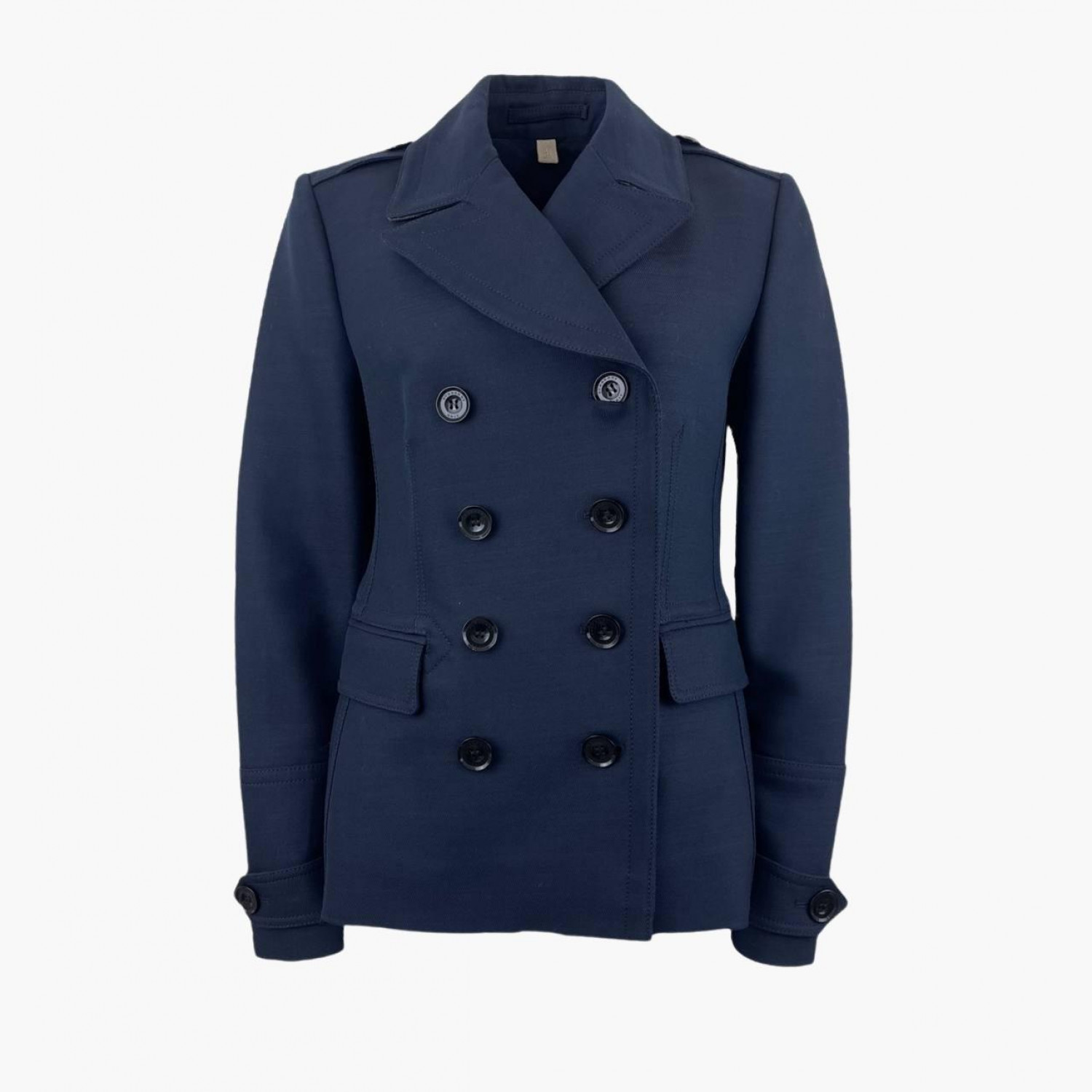 Короткий синій двобортний тренч приталеного силуету. Склад: основний матеріал — 57% бавовна, 22% поліестер, 21% вовна; підкладка рукавів — 100% віскоза; підкладка — 54% бавовна, 37% ацетат, 9% купро. У відмінному стані, без слідів вжитку.