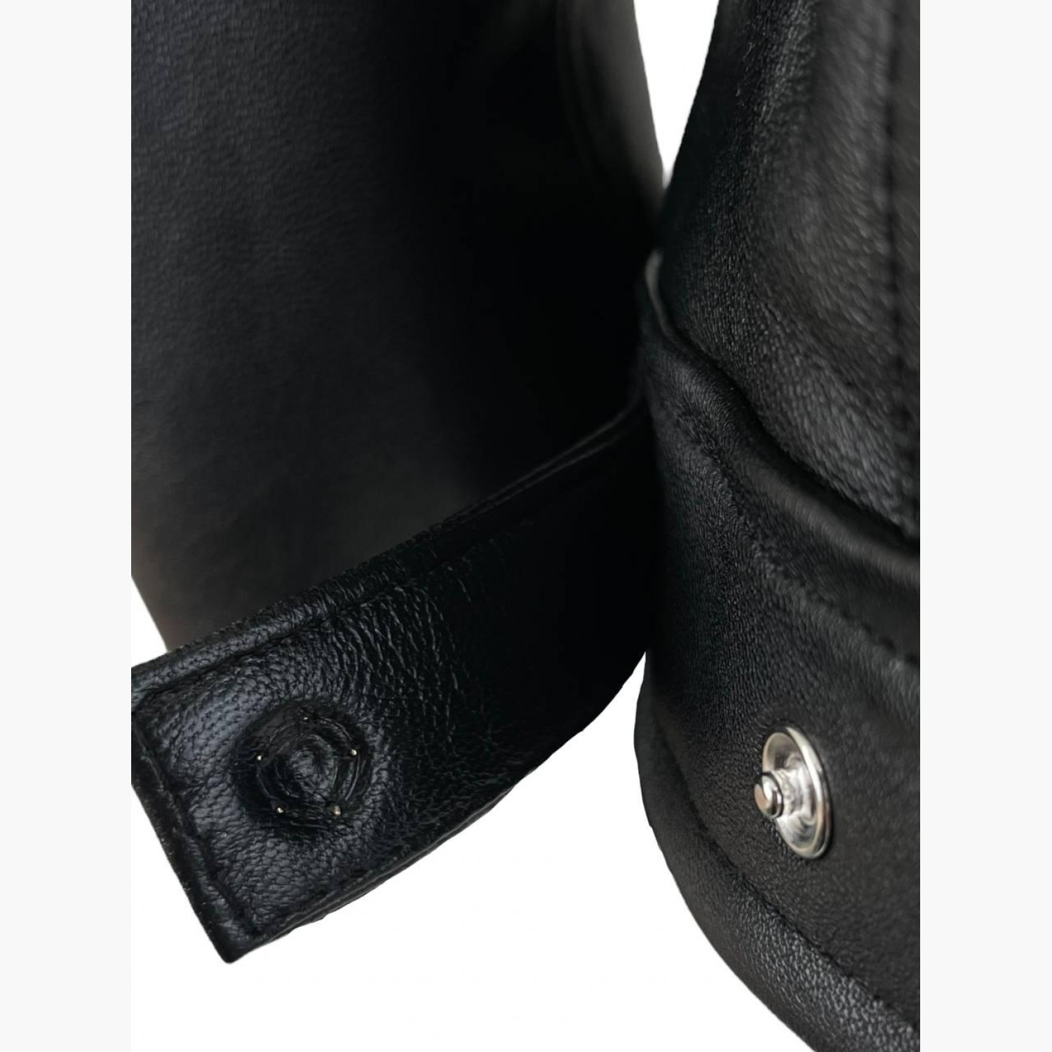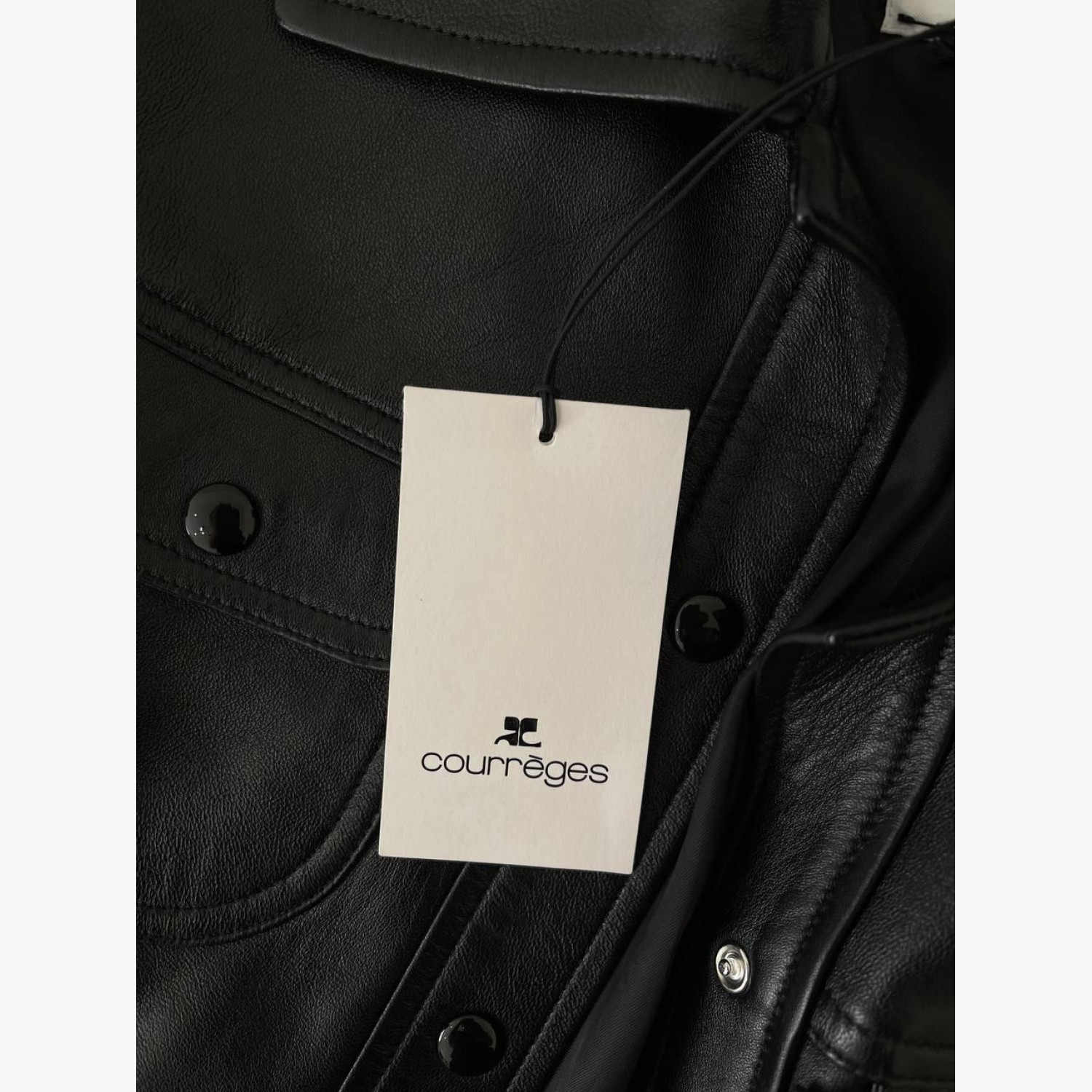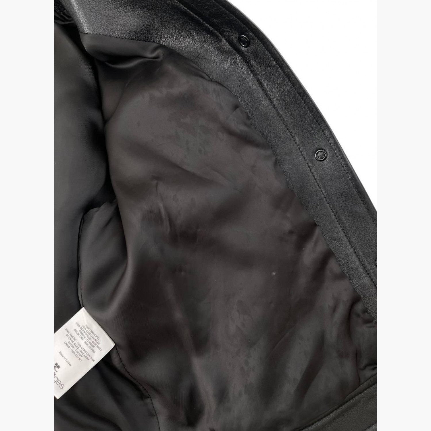 Чорна шкіряна куртка на кнопках з кишенями, з біркою. У хорошому стані, з дефектом та плямою на підкладці.