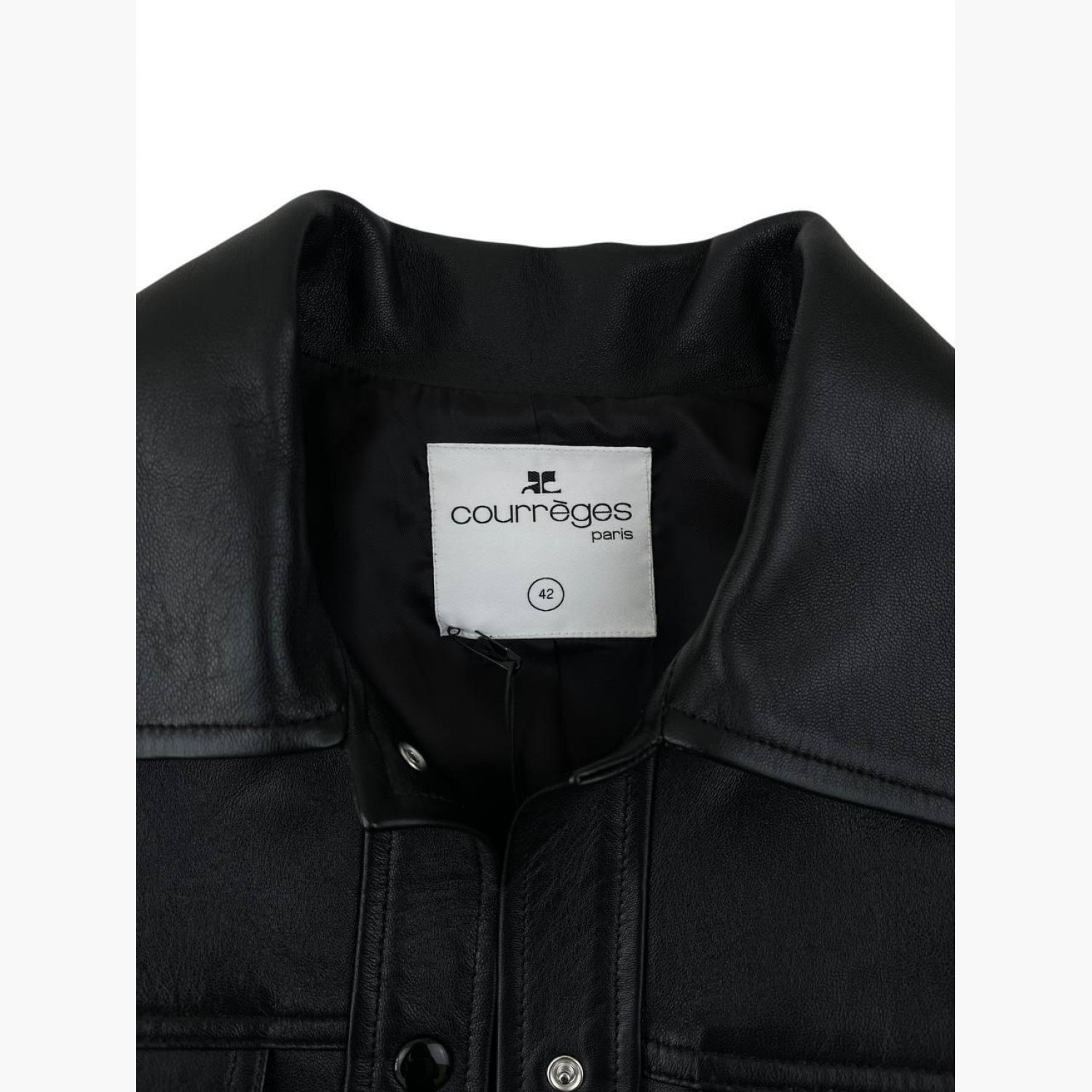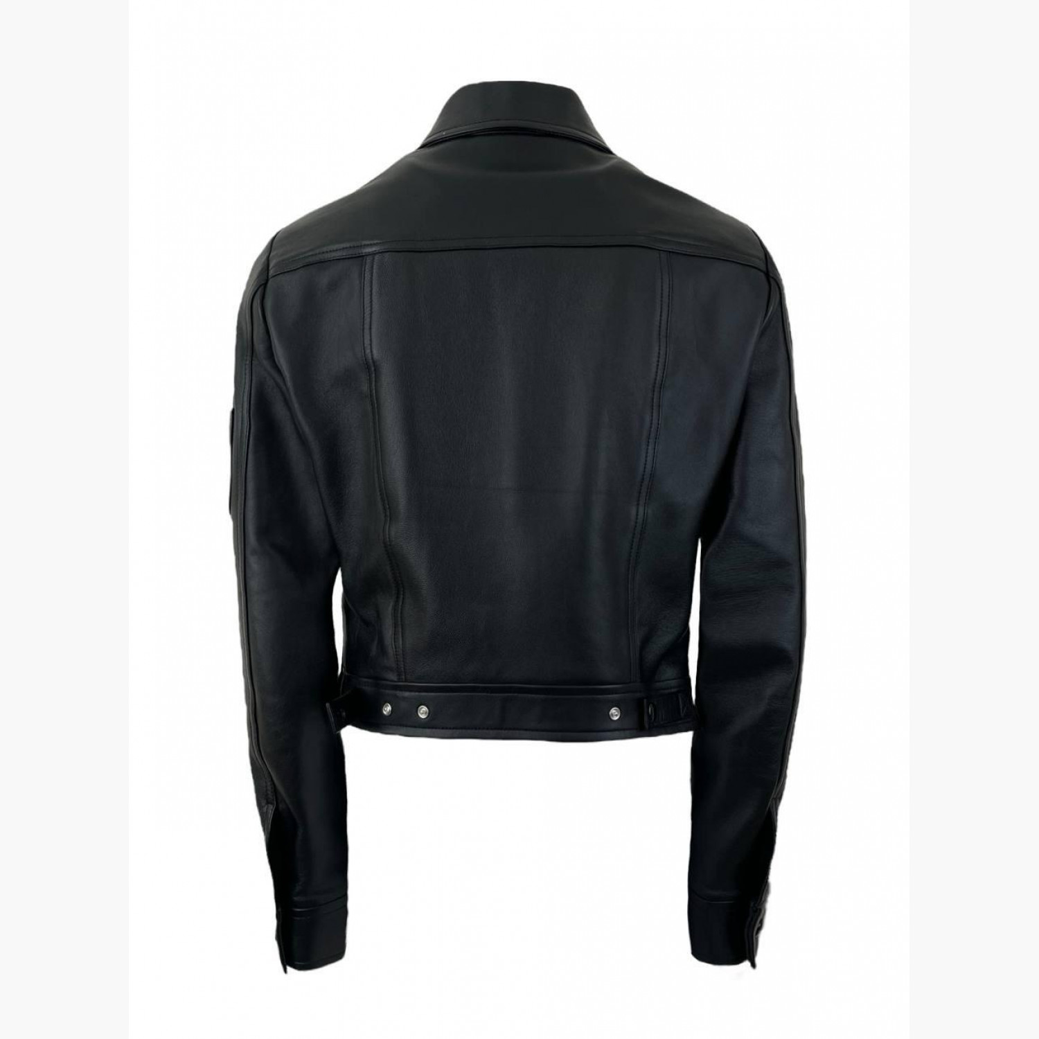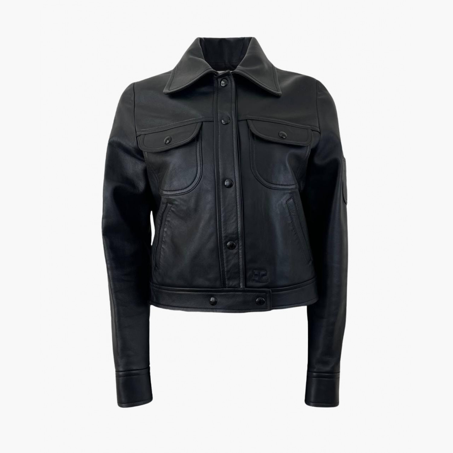 Чорна шкіряна куртка на кнопках з кишенями, з біркою. У хорошому стані, з дефектом та плямою на підкладці.
