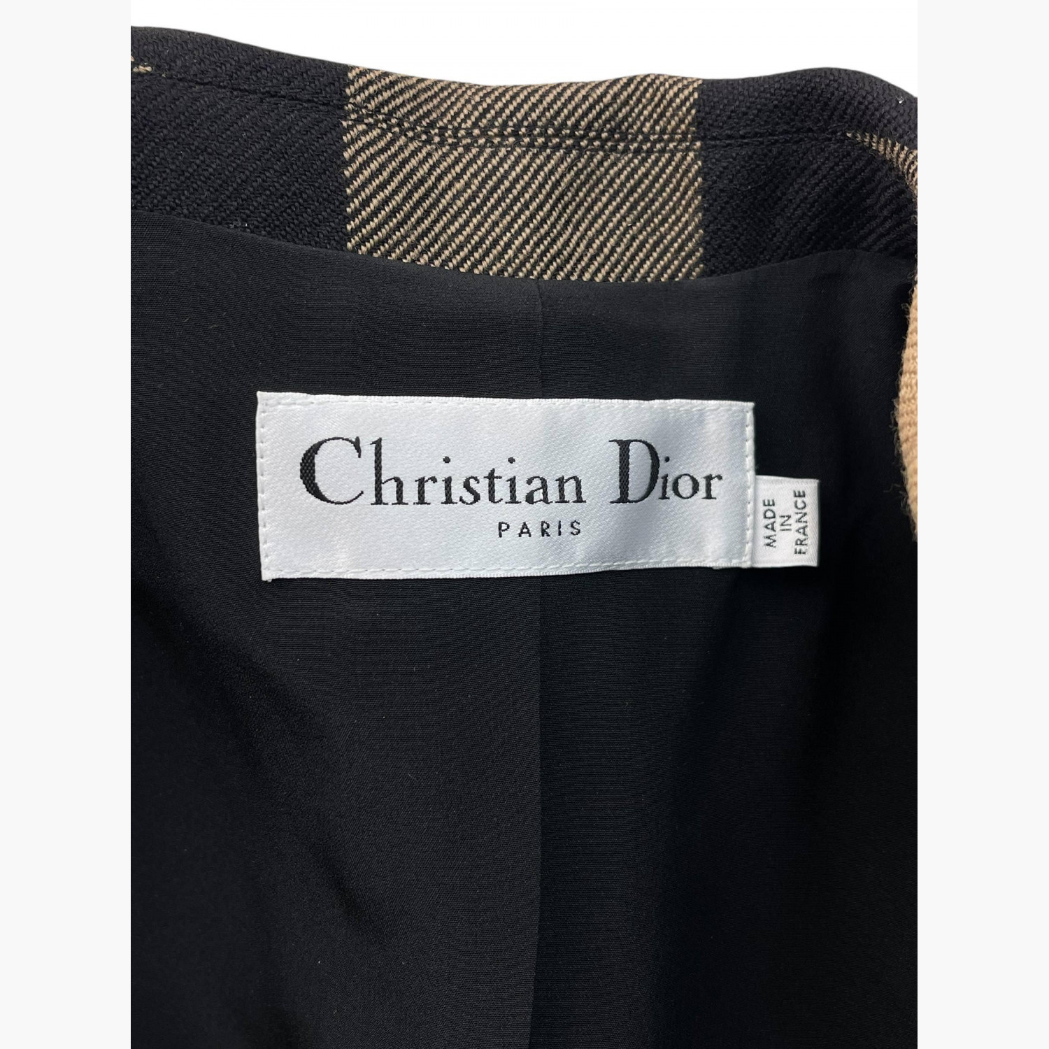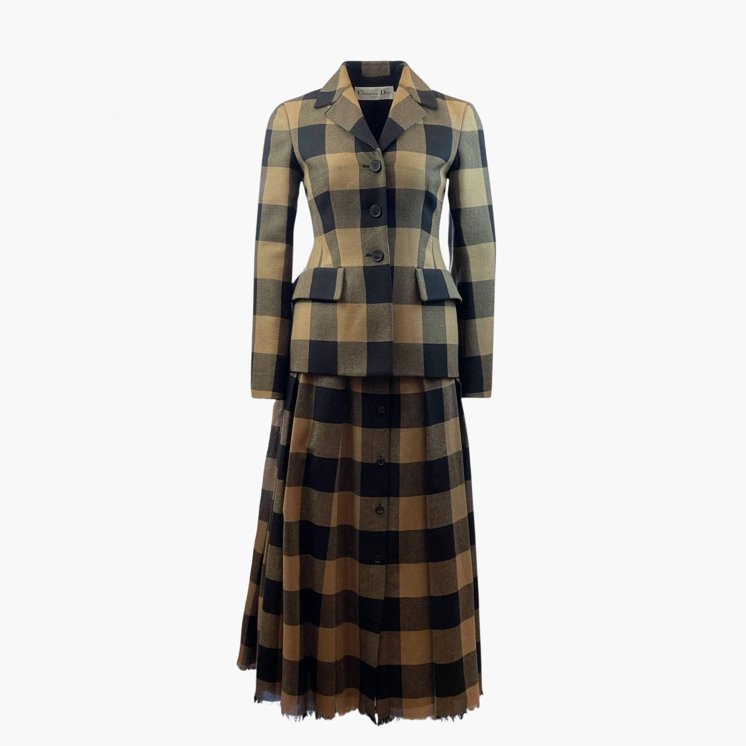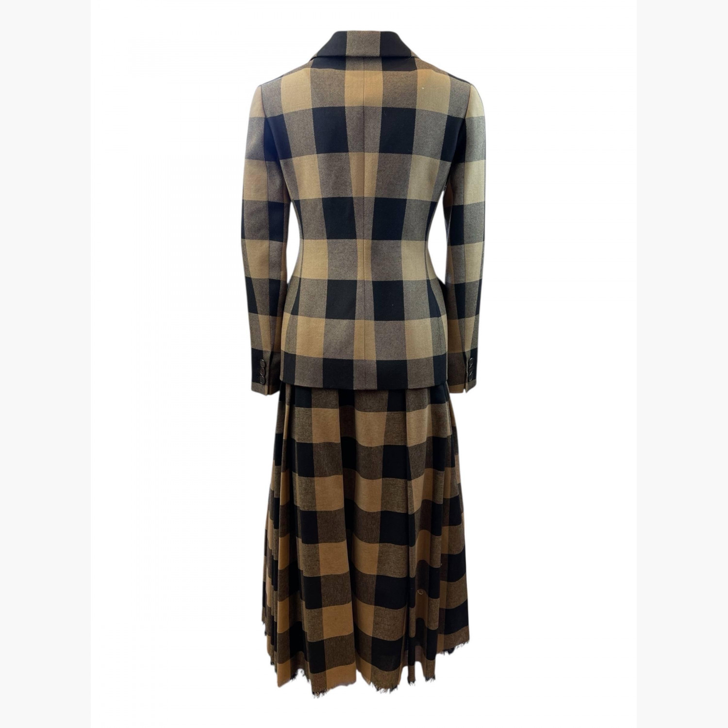 Картатий костюм бежево-коричневого кольору, що складається з приталеного піджака розміру 36 та максі-спідниці в складку розміру 38.Склад: основний матеріал — 100% вовна; підкладка — 100% шовк.У відмінному стані, є сліди носіння.