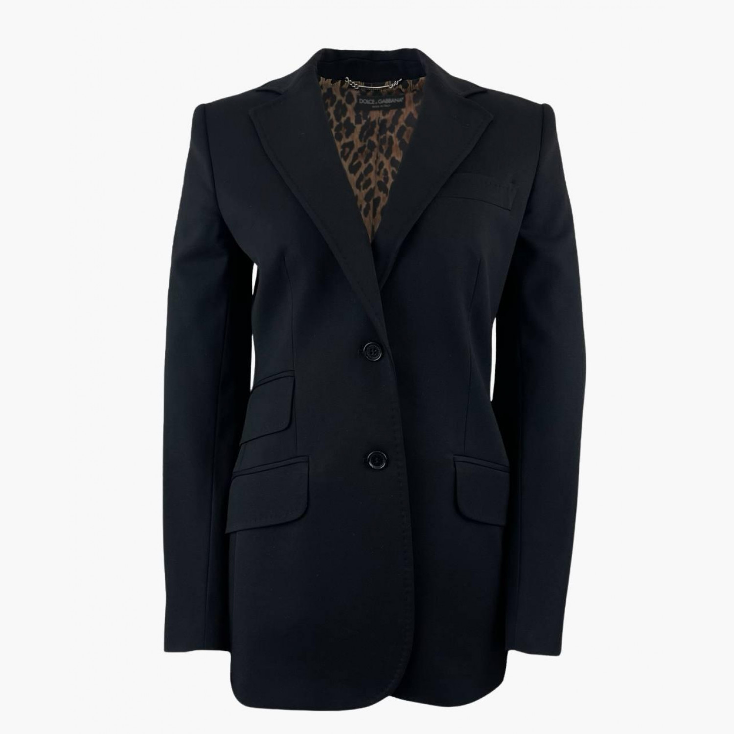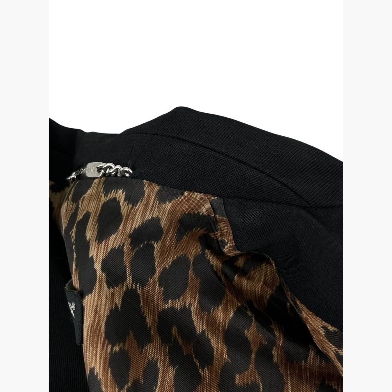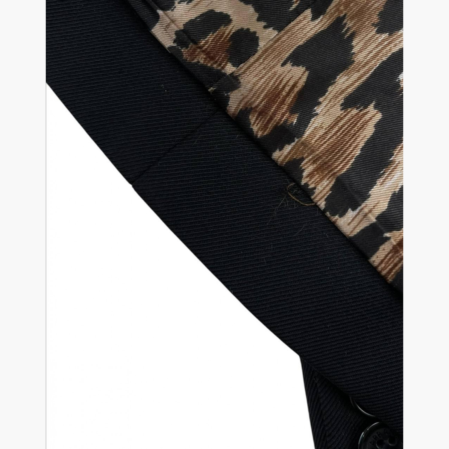Чорний піджак із леопардовою підкладкою. Склад — 90% вовна, 7% поліамід, 3% еластан. У відмінному стані, є незначні сліди вжитку.