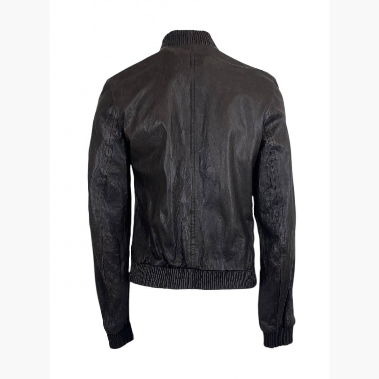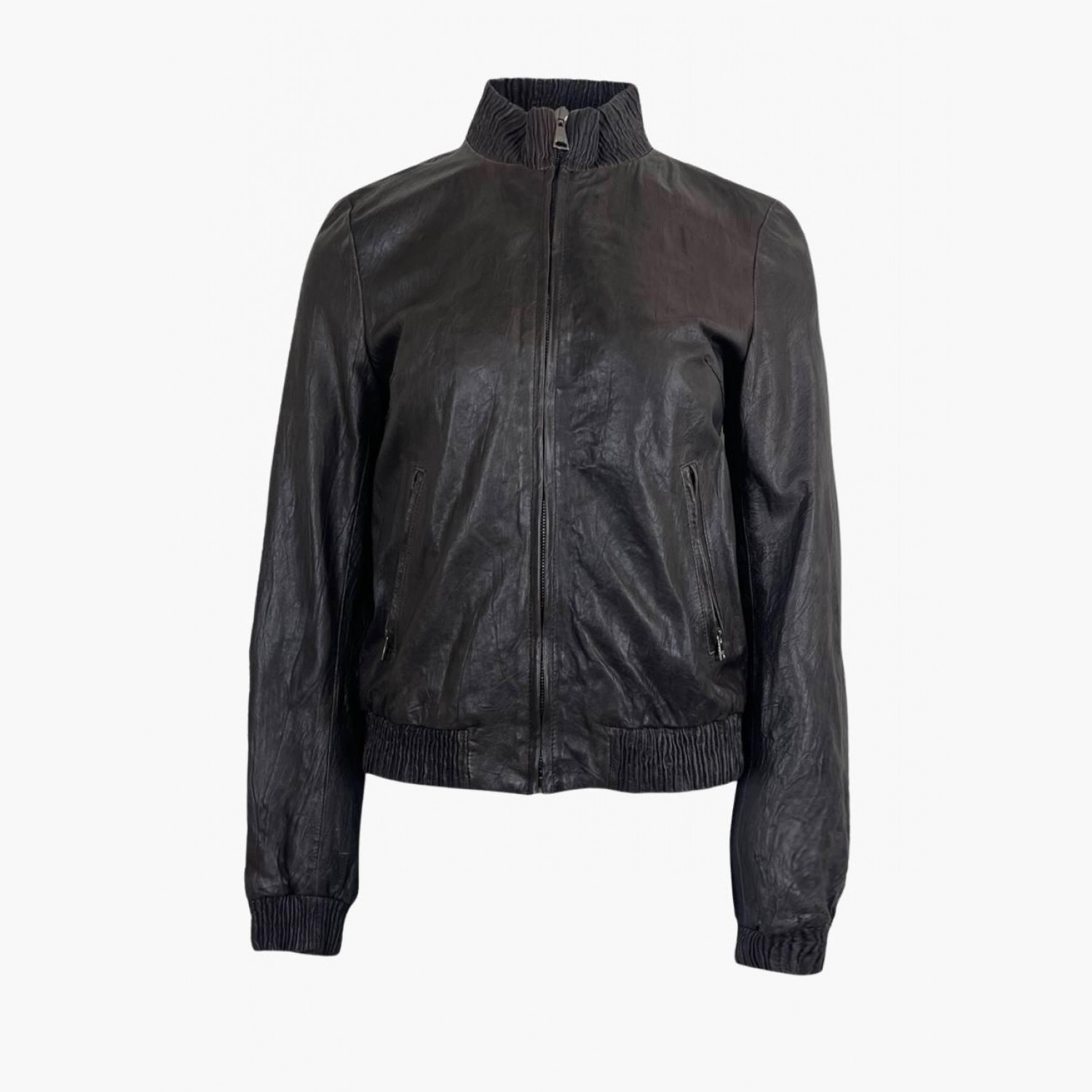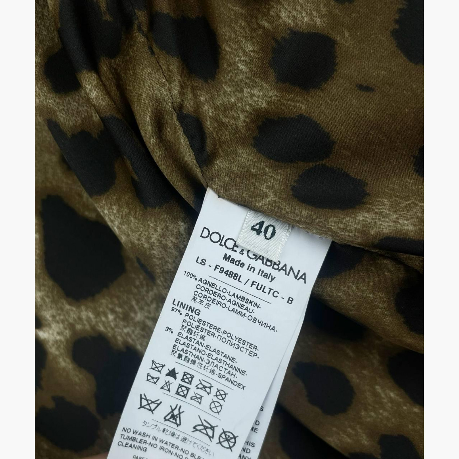Темно-коричнева приталена куртка з леопардовою підкладкою. Склад: основний матеріал — 100% шкіра ягняти; підкладка — 97% поліестер, 3% еластан. У дуже хорошому стані, є ледь помітні сліди вжитку.