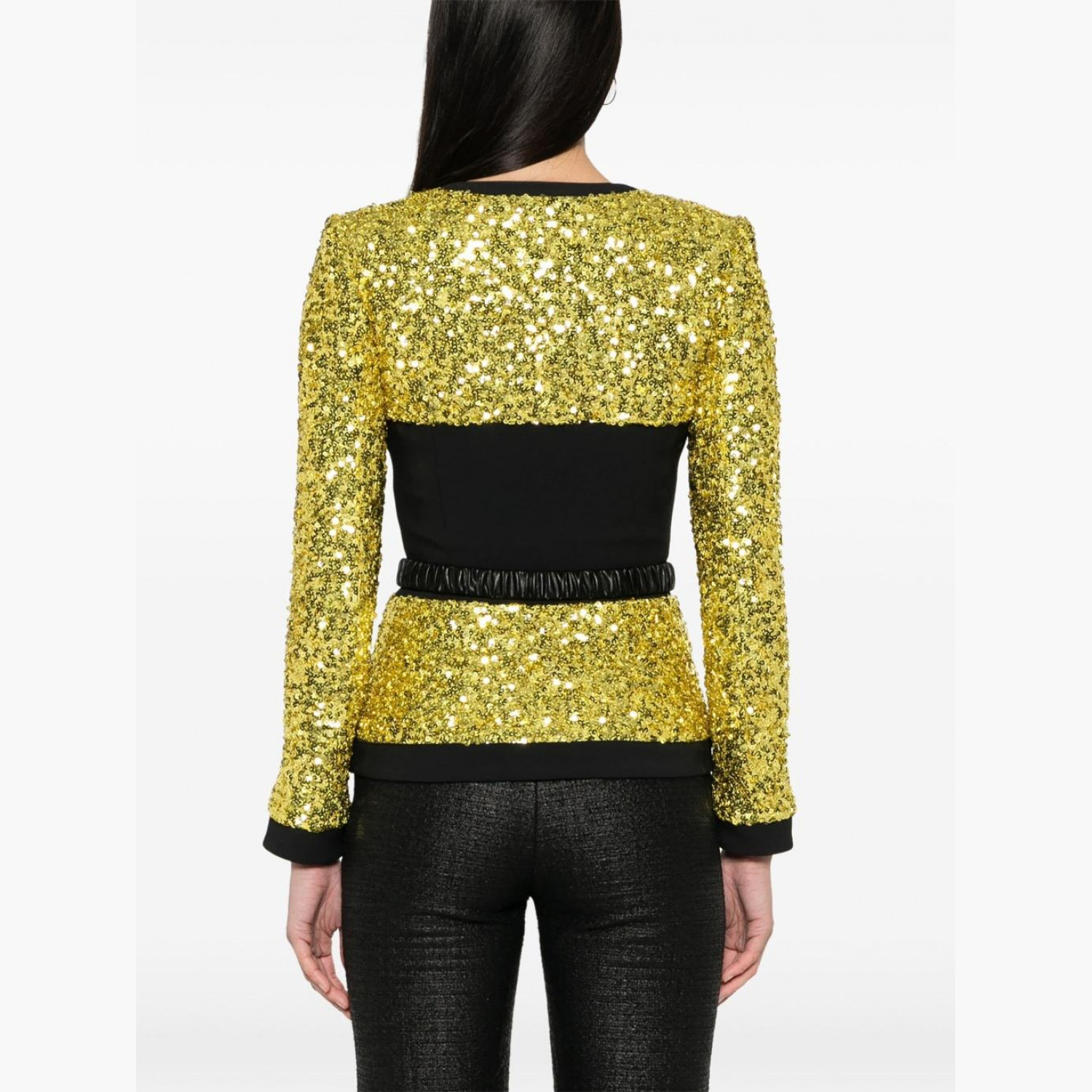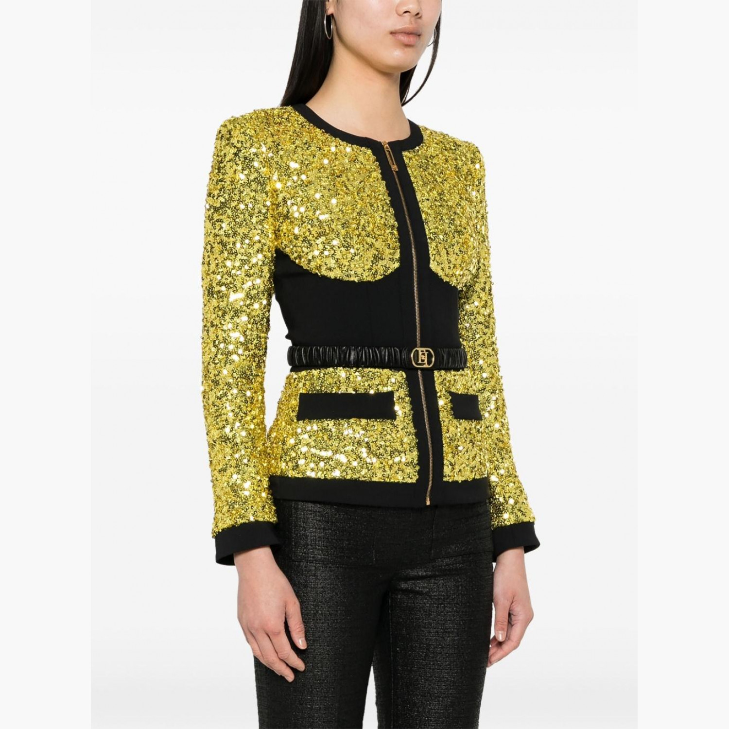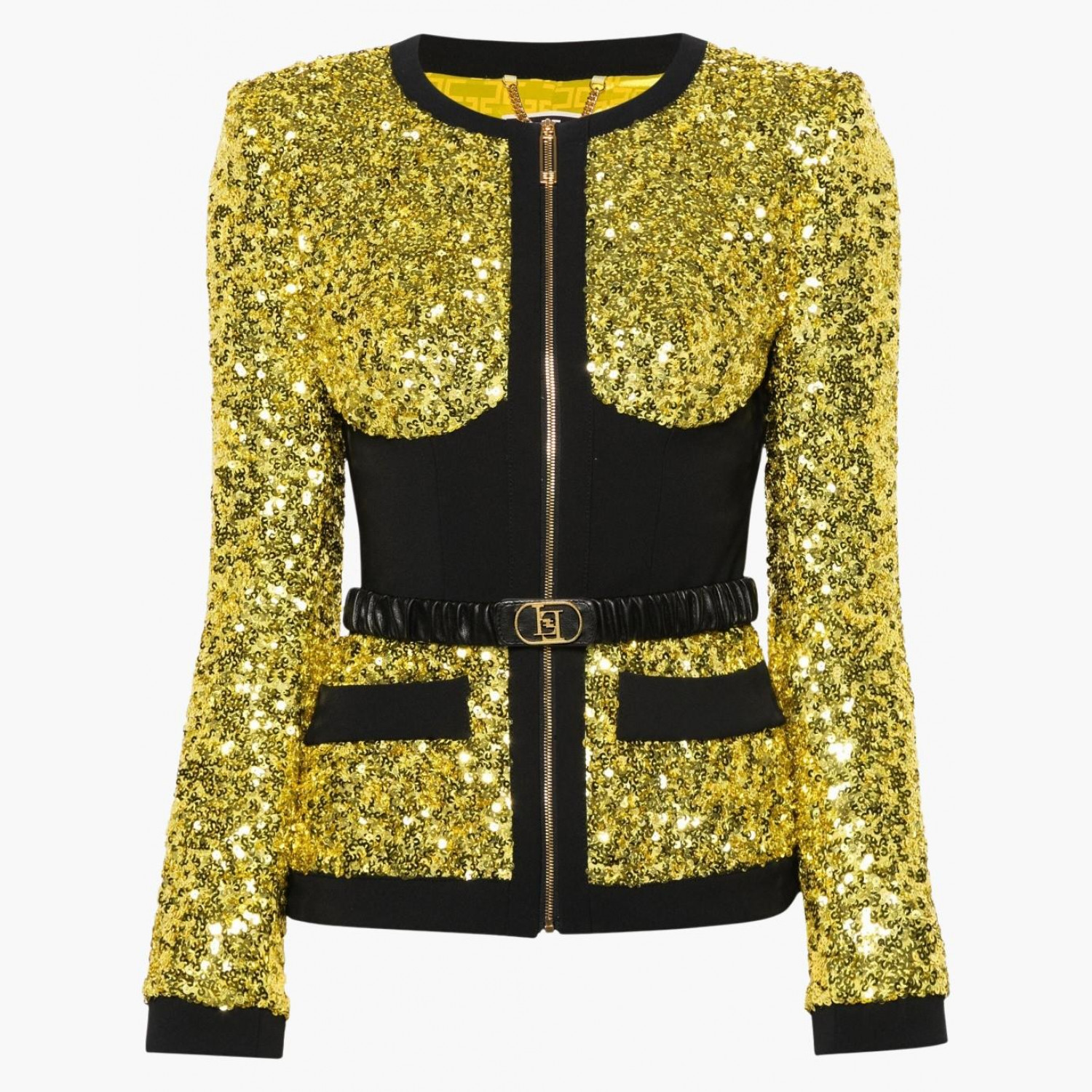 Жовтий блейзер, оздоблений паєтками, з поясом. Без коміра, з круглим вирізом, підплічниками, довгими рукавами, драпованими деталями, фальшивими кишенями спереду, підкладкою з жакардом із логотипом і фірмовою застібкою-блискавкою спереду.