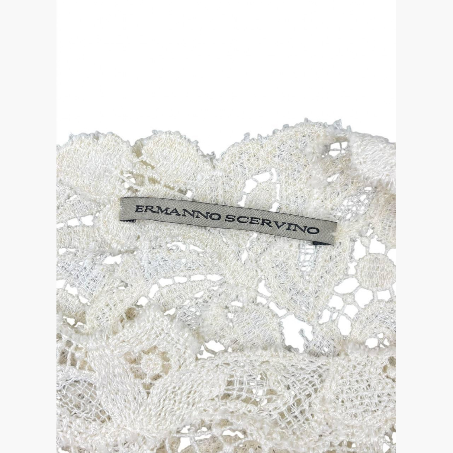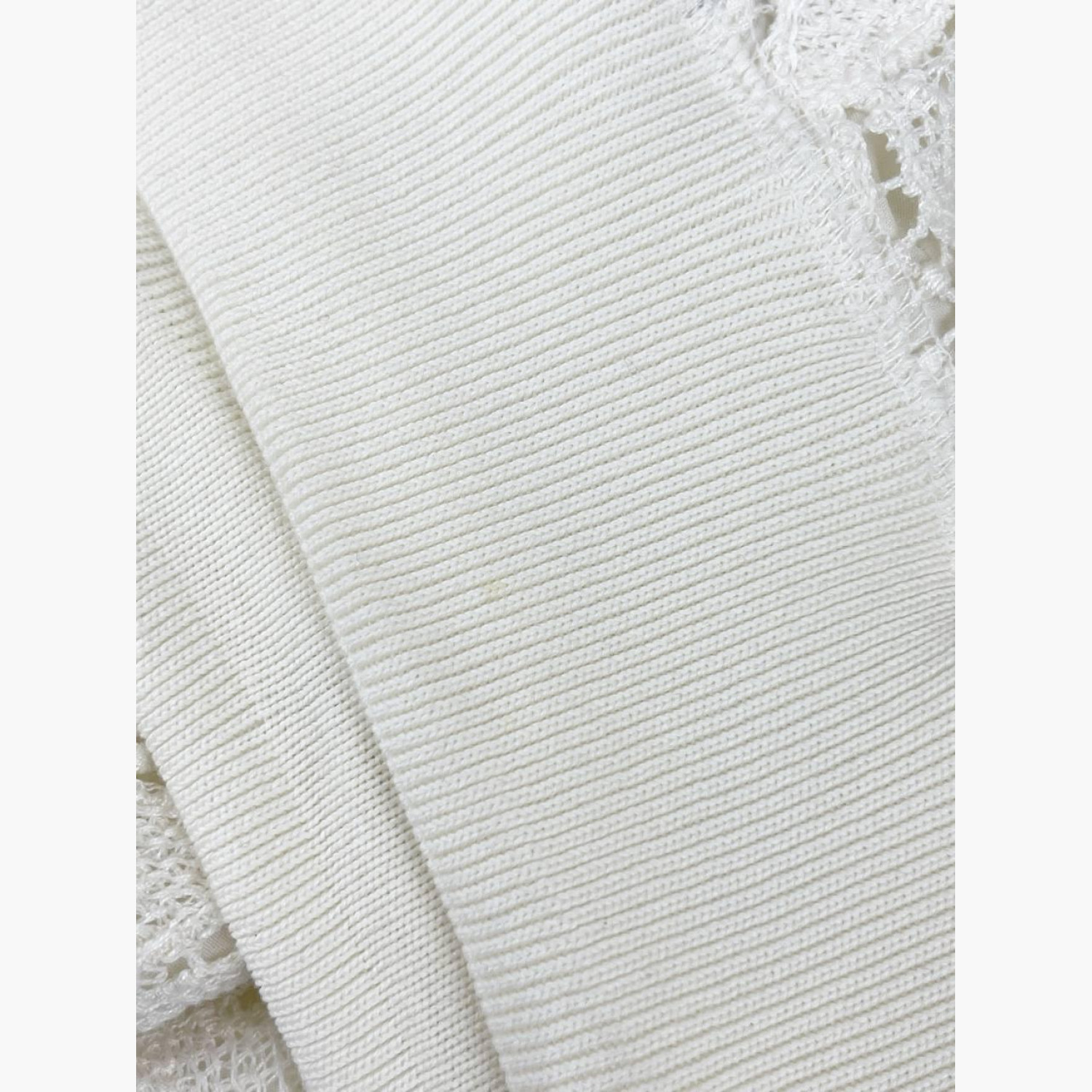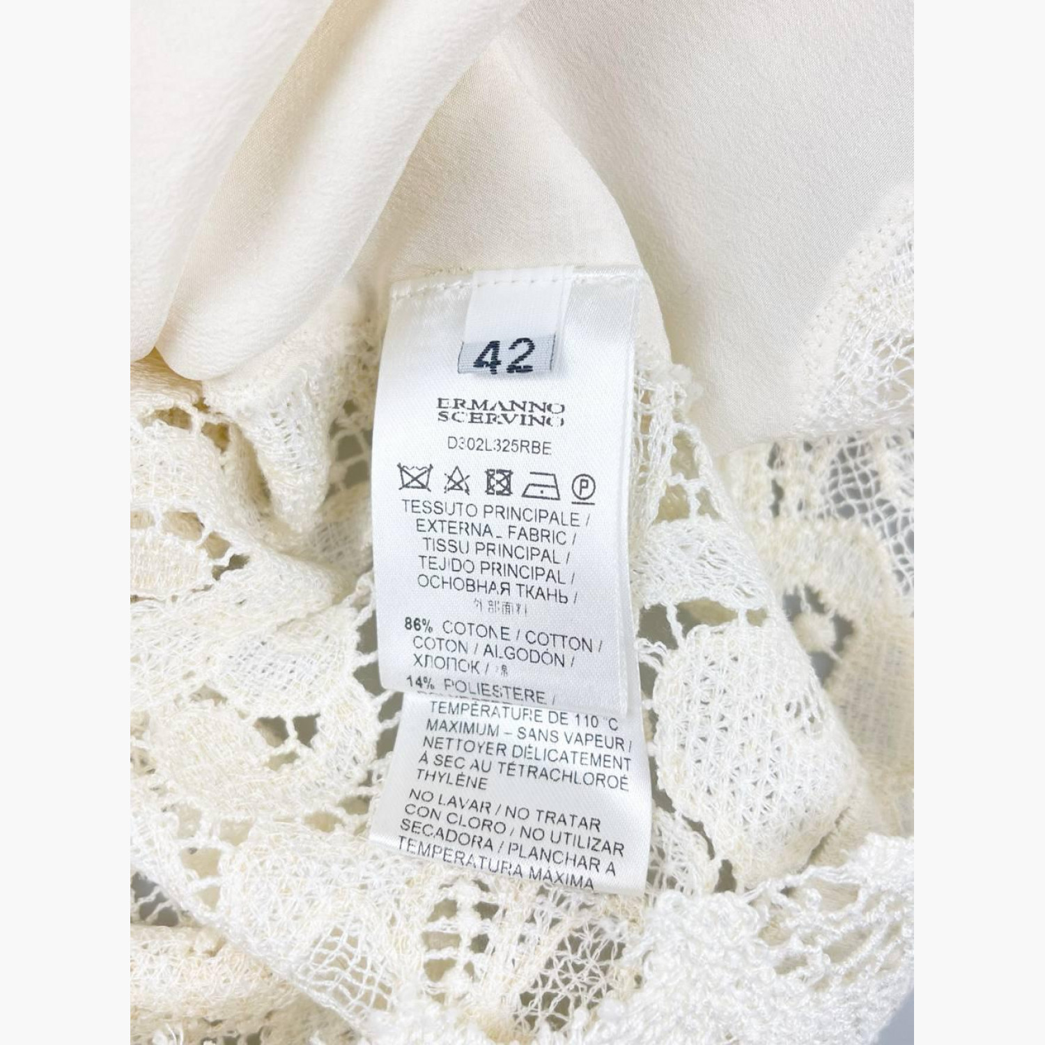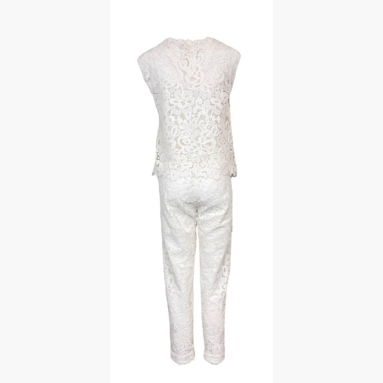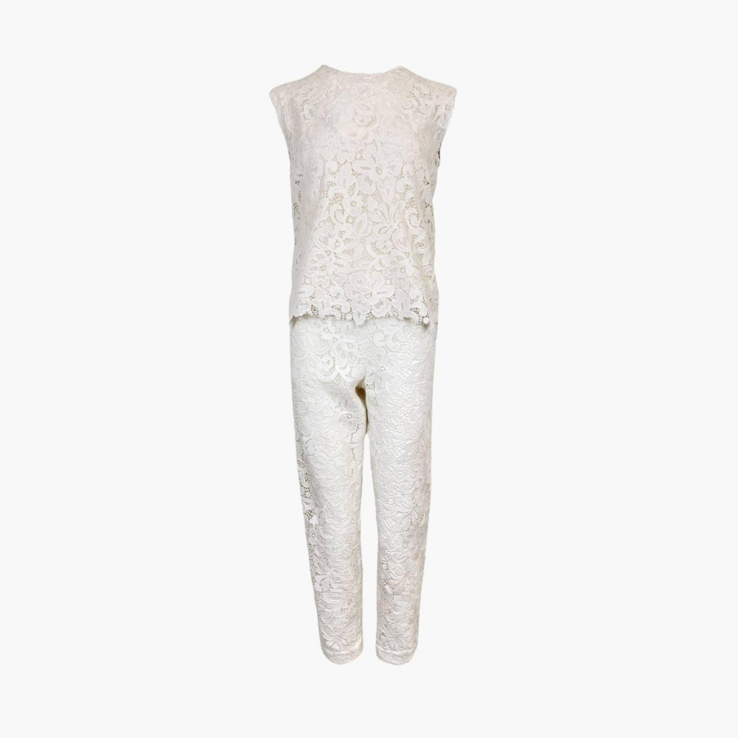 Молочний мереживний костюм: блузка з коротким рукавом та штани на шнурівці. Склад: основний матеріал — 86% бавовна, 14% поліестер; підкладка — 100% шовк. У хорошому стані, є ледь помітні сліди вжитку.