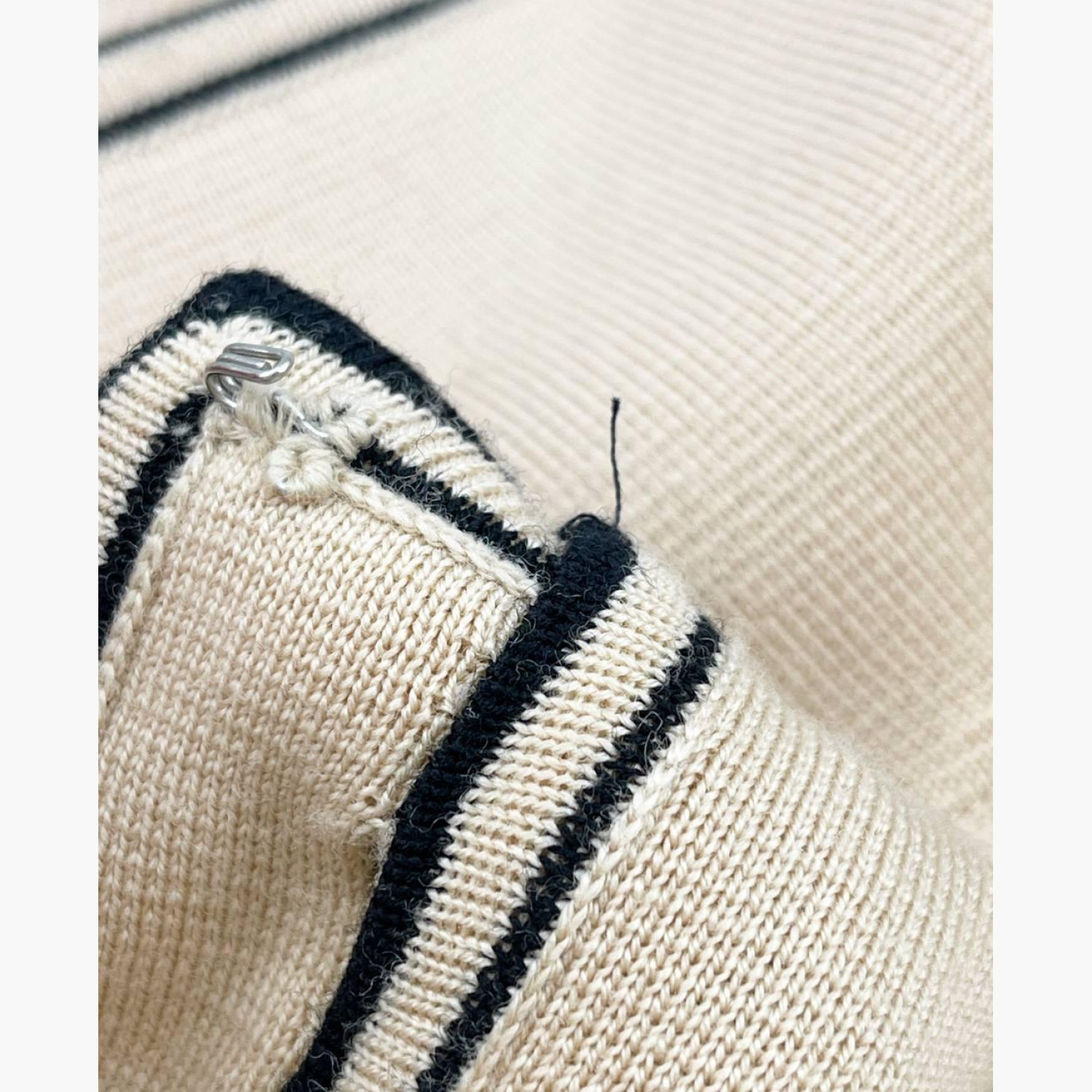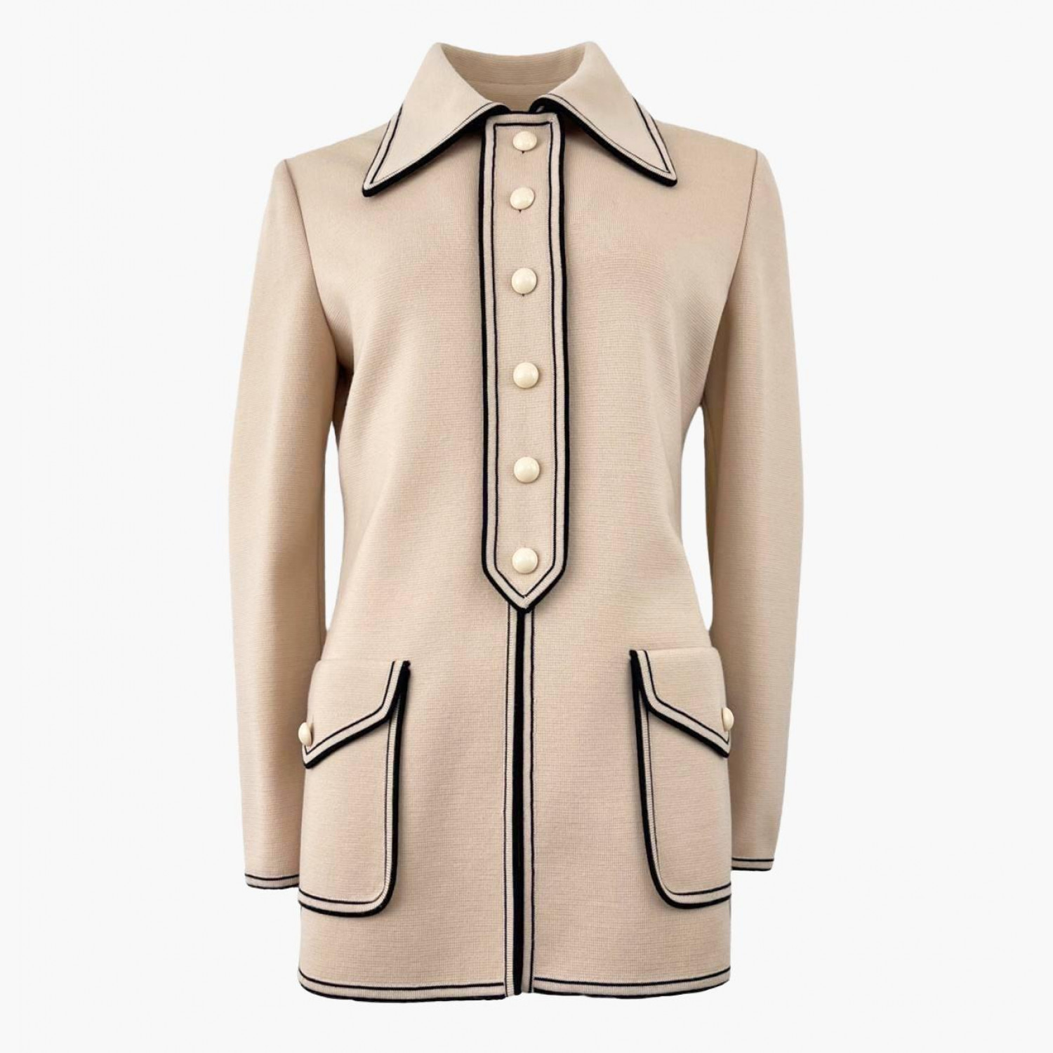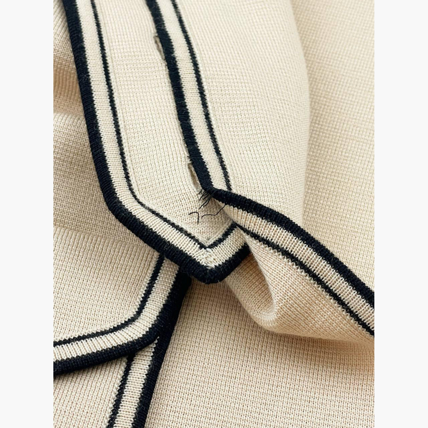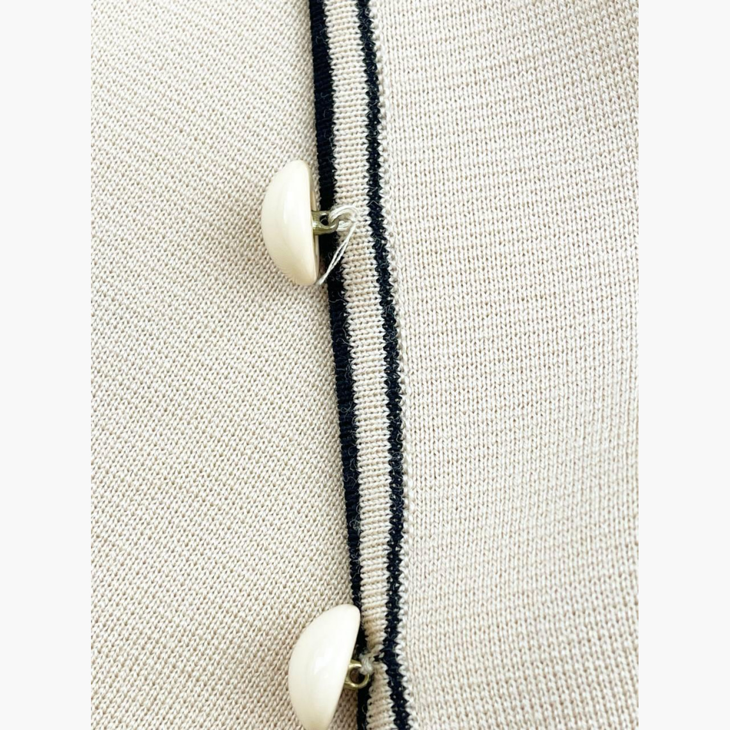 Бежевий кардиган з коміром та кишенями з чорною облямівкою. У гарному стані, є дефект і видно нитки.