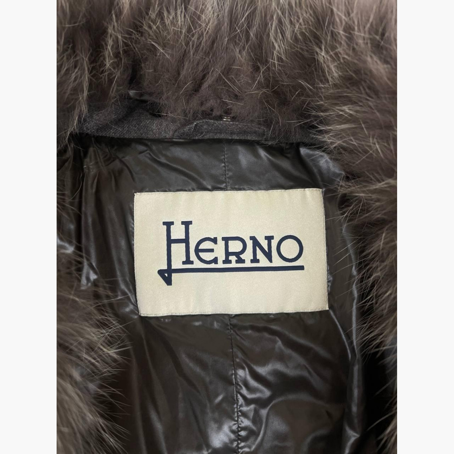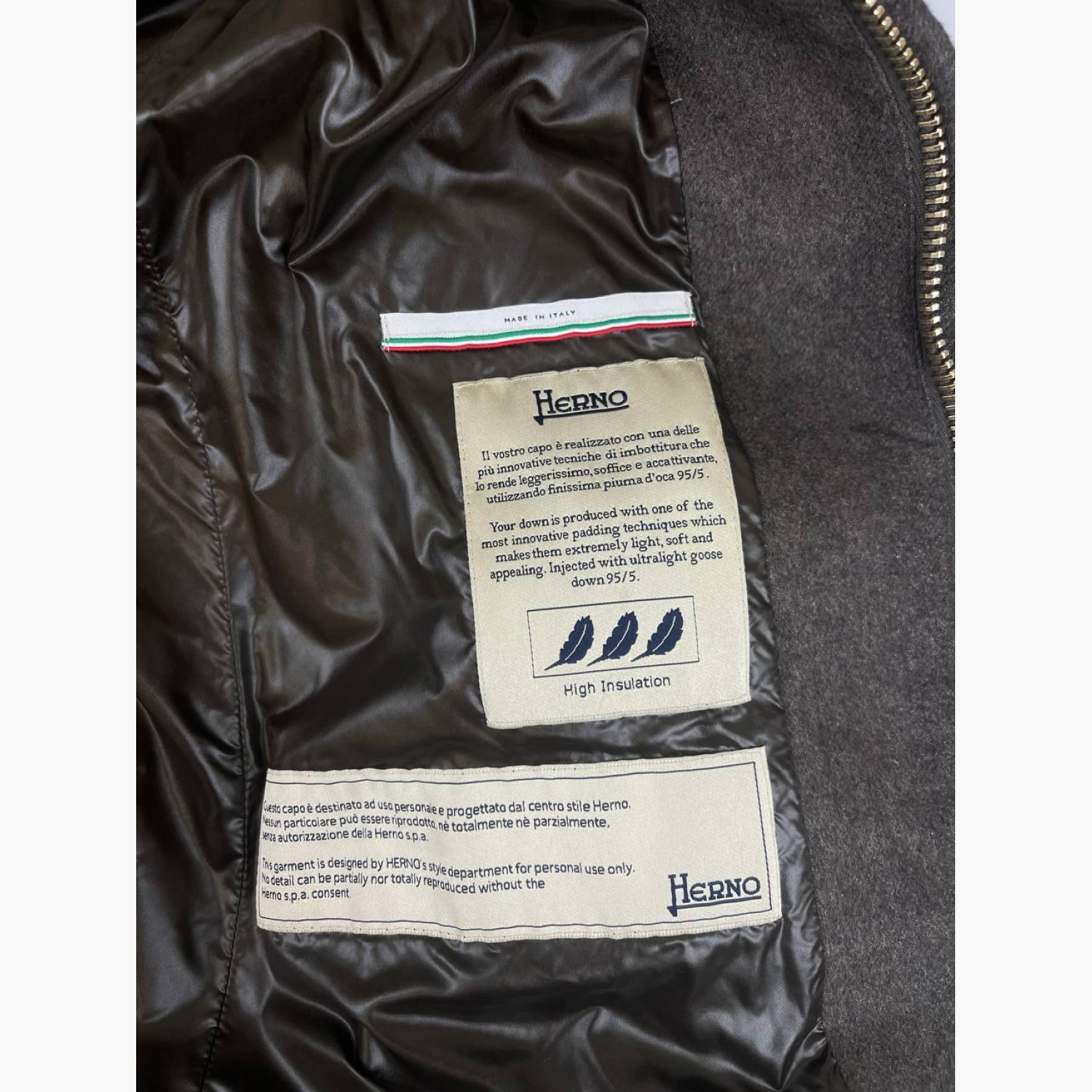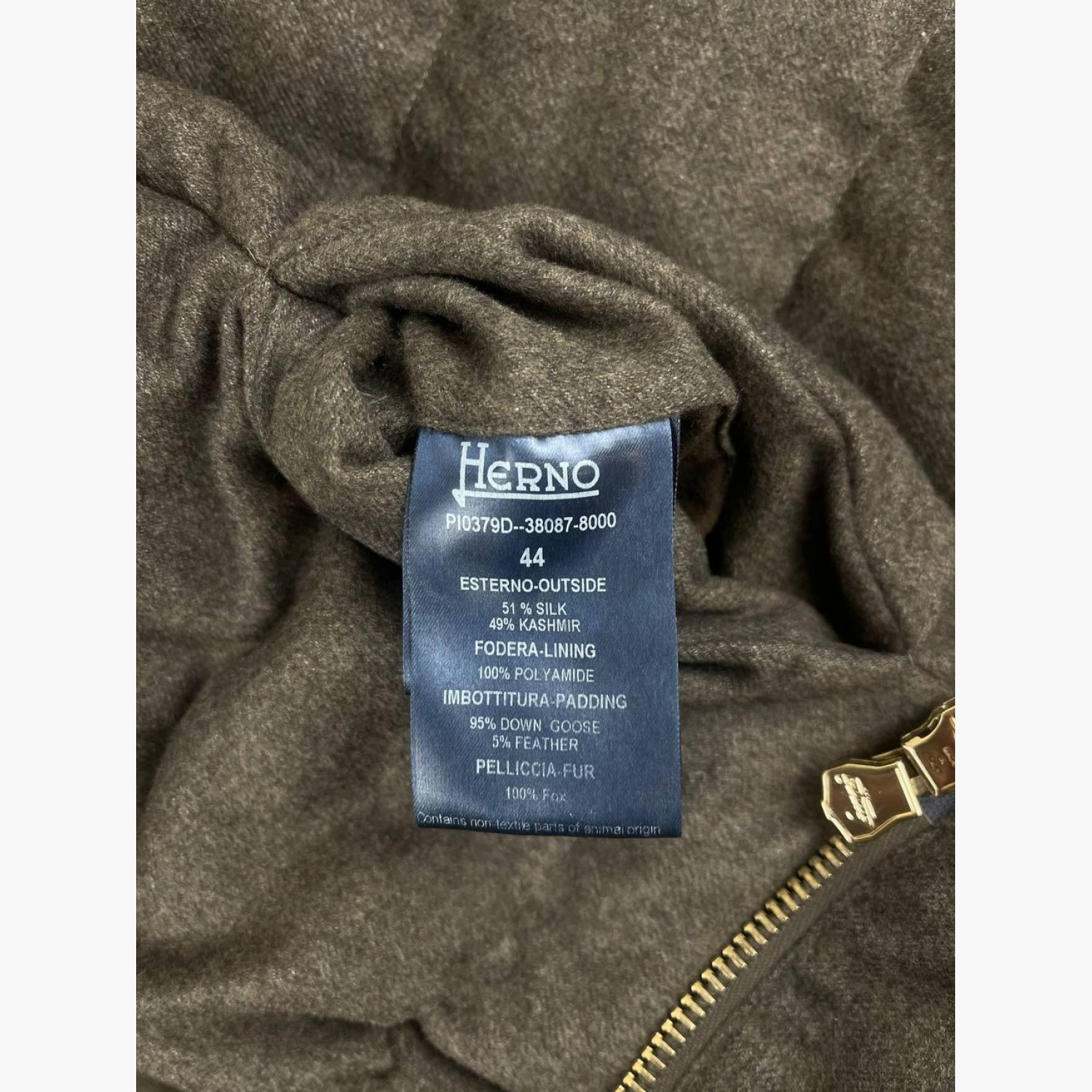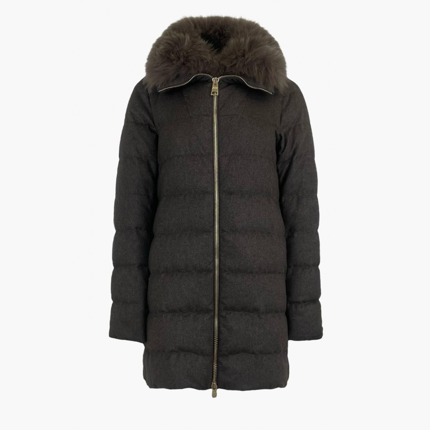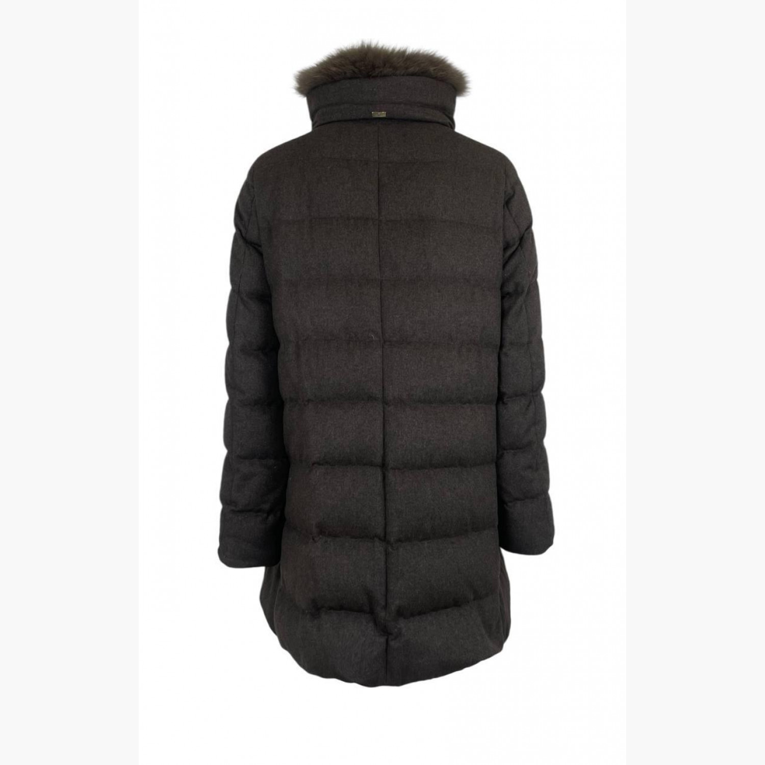 Коричневий довгий кашеміровий пуховик на блискавці з хутряним коміром. Склад: основний матеріал — 51% шовк, 49% кашемір; підкладка — 100% поліамід; наповнення — 95% гусячий пух, 5% перо; комір — 100% хутро лисиці. У відмінному стані, без слідів вжитку.