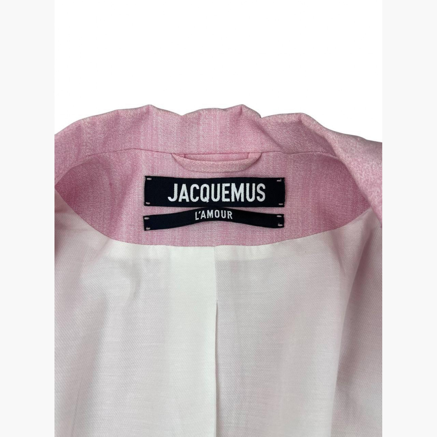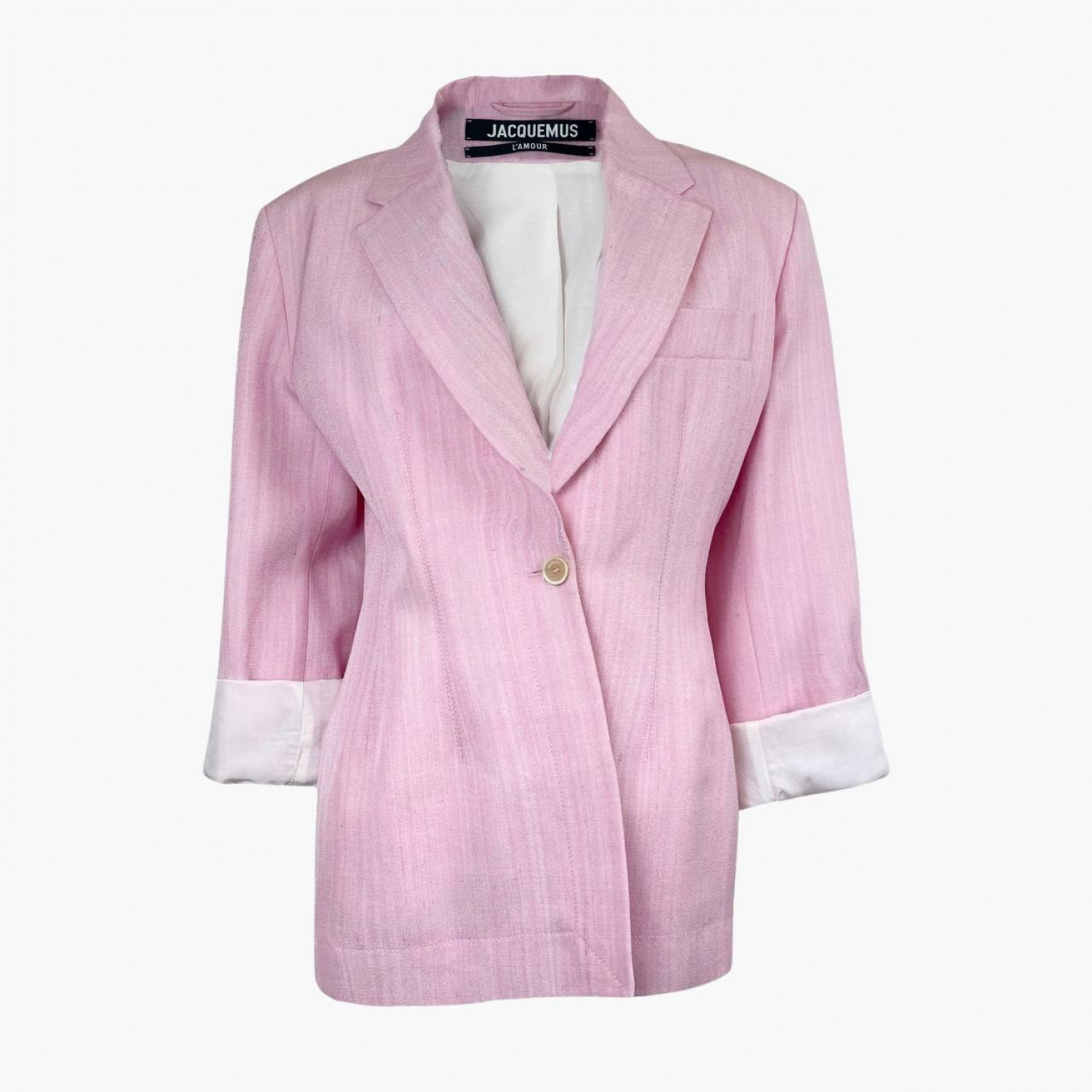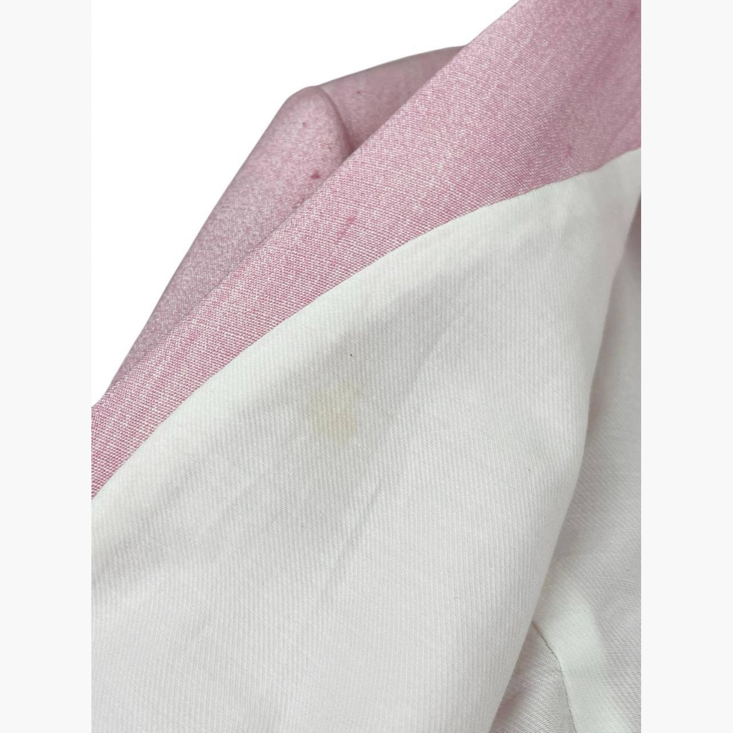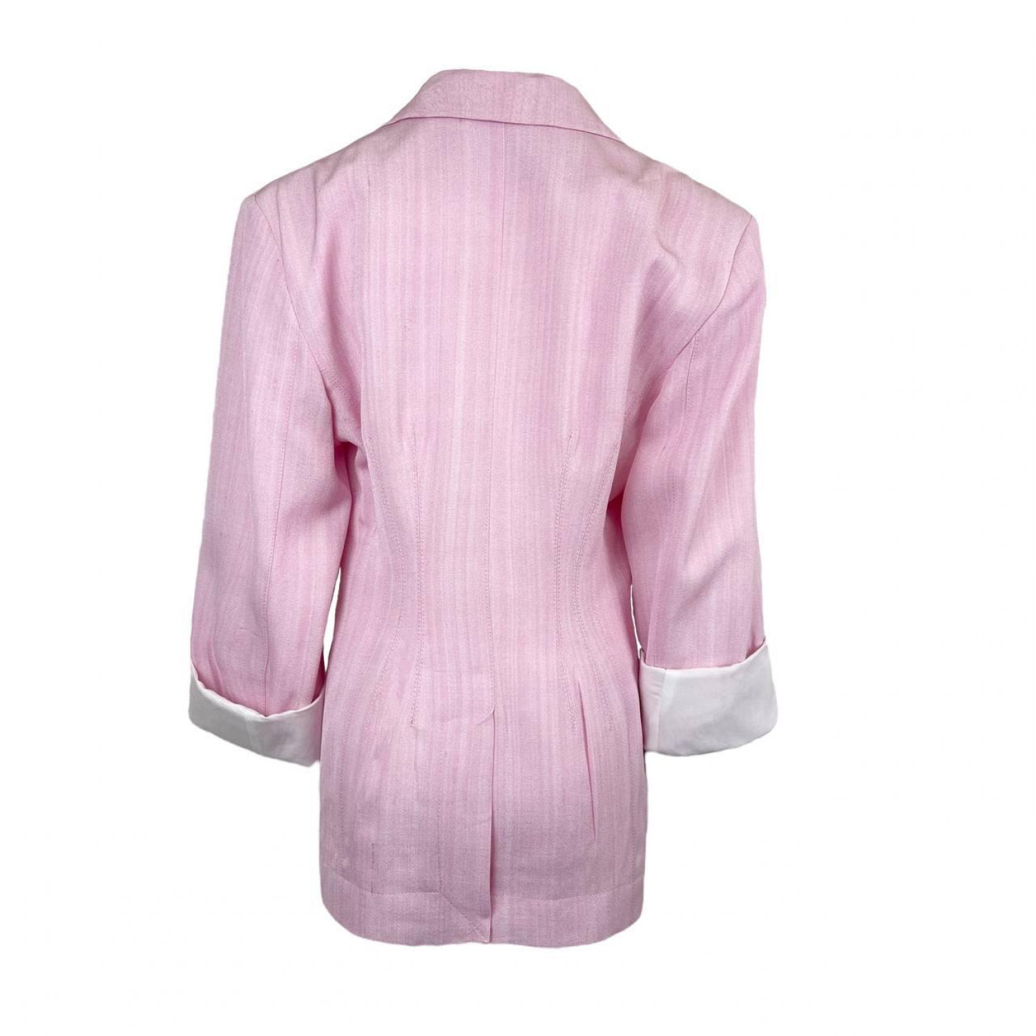 Рожевий жакет на одну ґудзик з декоративними строчками на талії. Склад: основний матеріал — 57% віскоза, 43% шовк; підкладка — 51% віскоза, 49% бавовна. У дуже хорошому стані, є сліди вжитку.