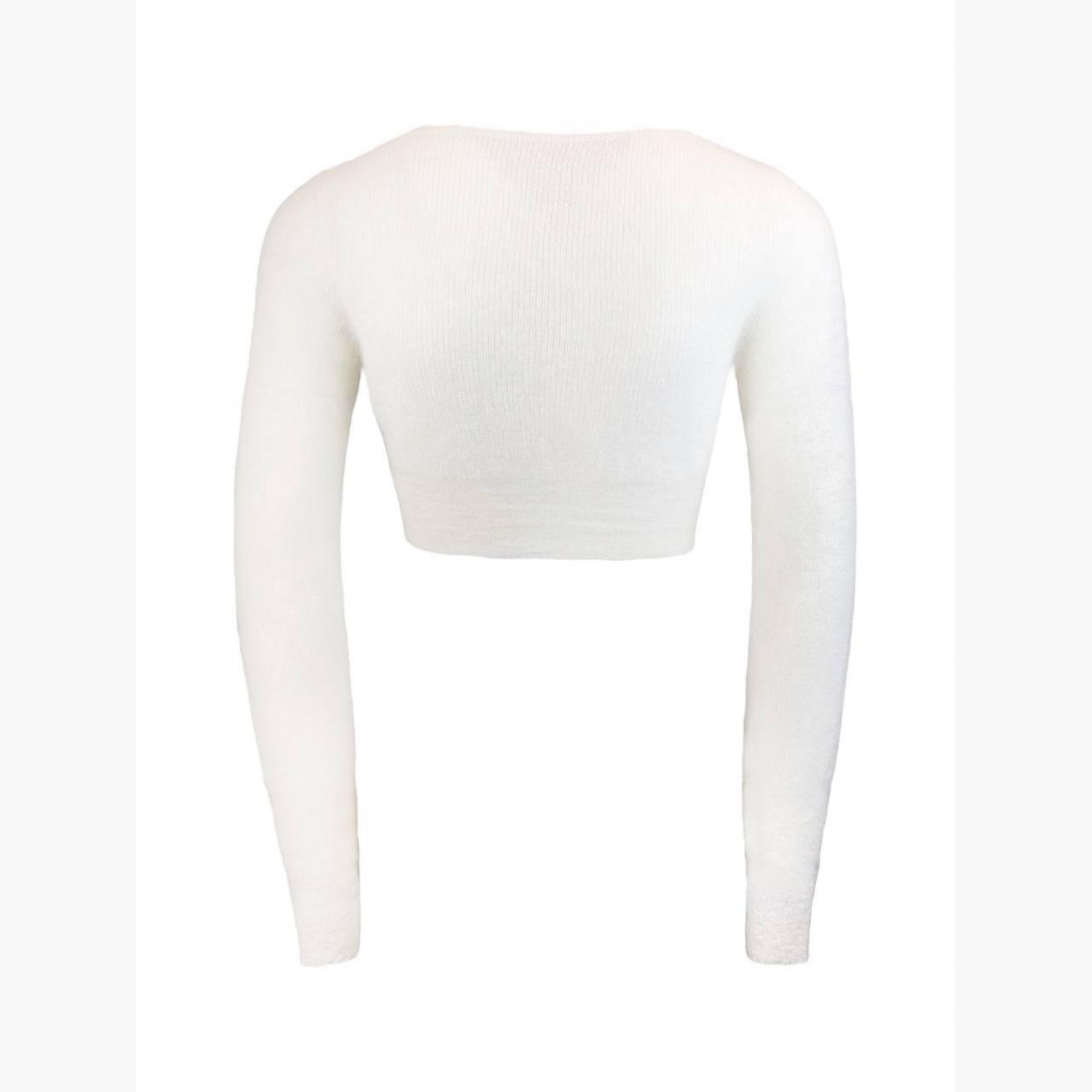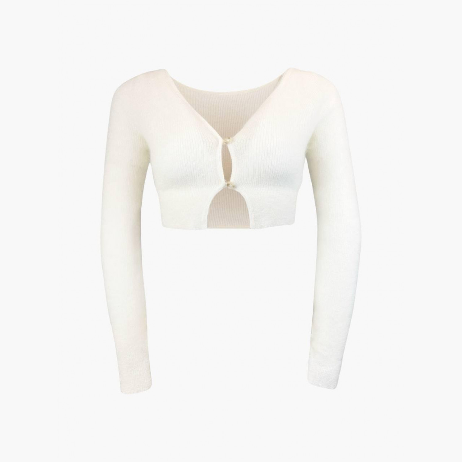 Молочного кольору мохеровий укорочений кардиган на двох ґудзиках. Склад — 50% мохер, 36% поліамід, 14% вовна. У відмінному стані, є ледь помітна плямка внизу.