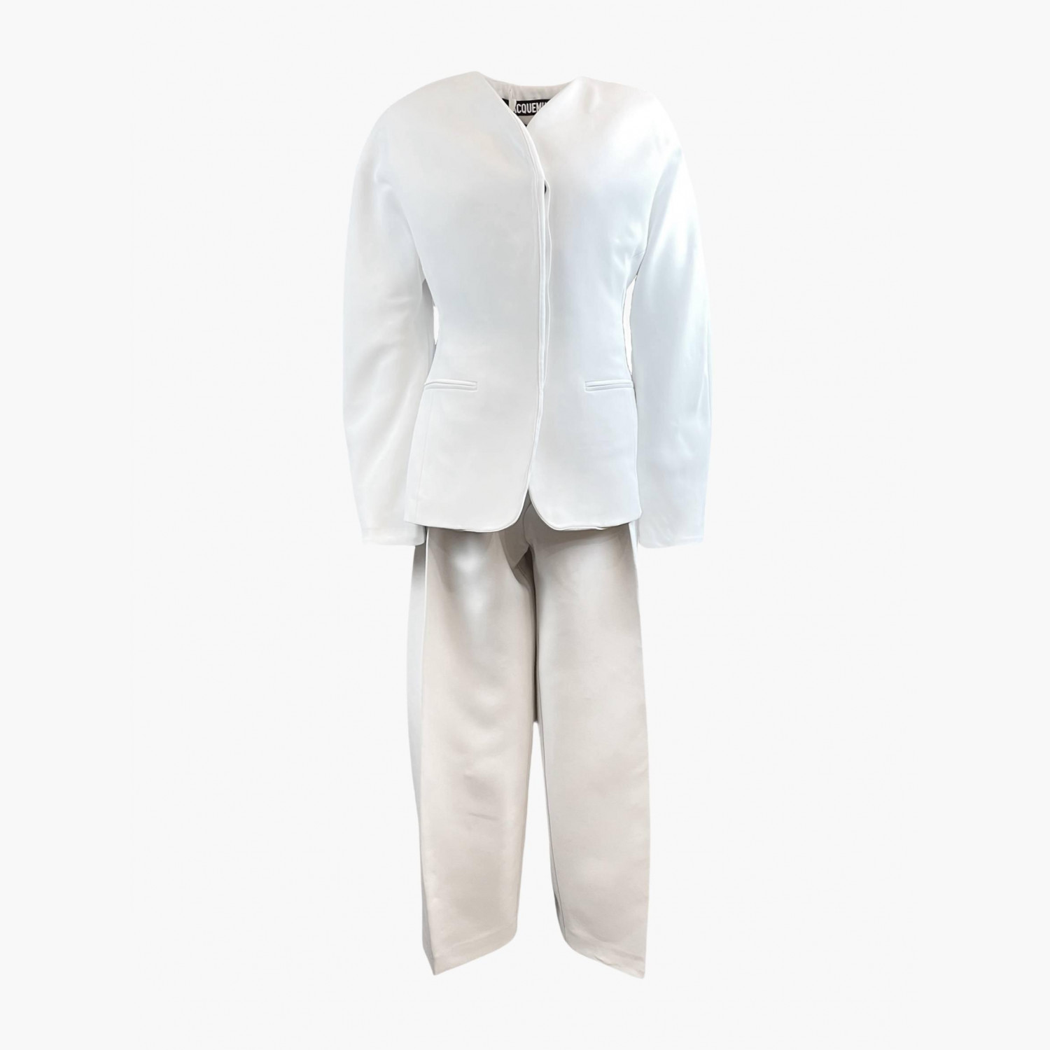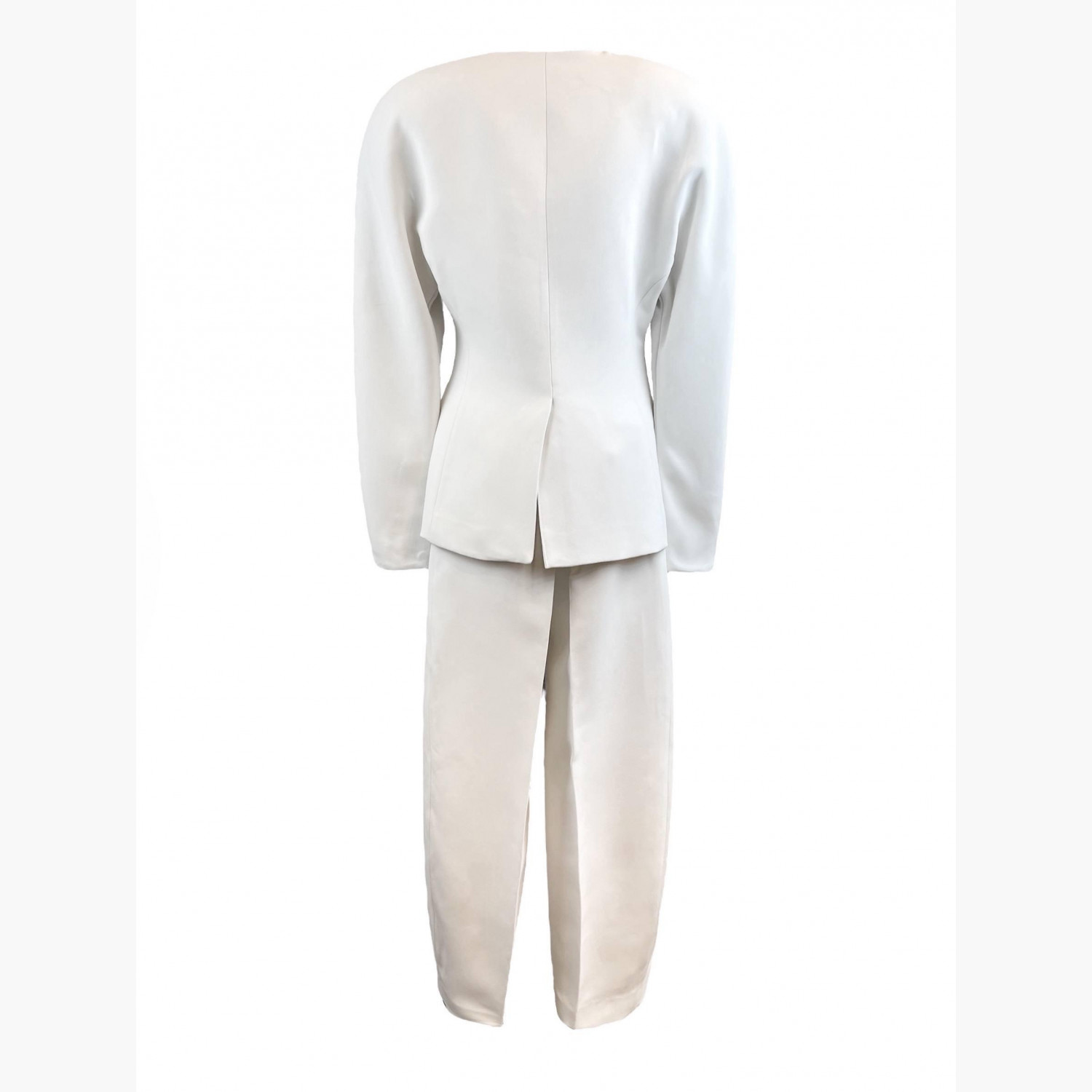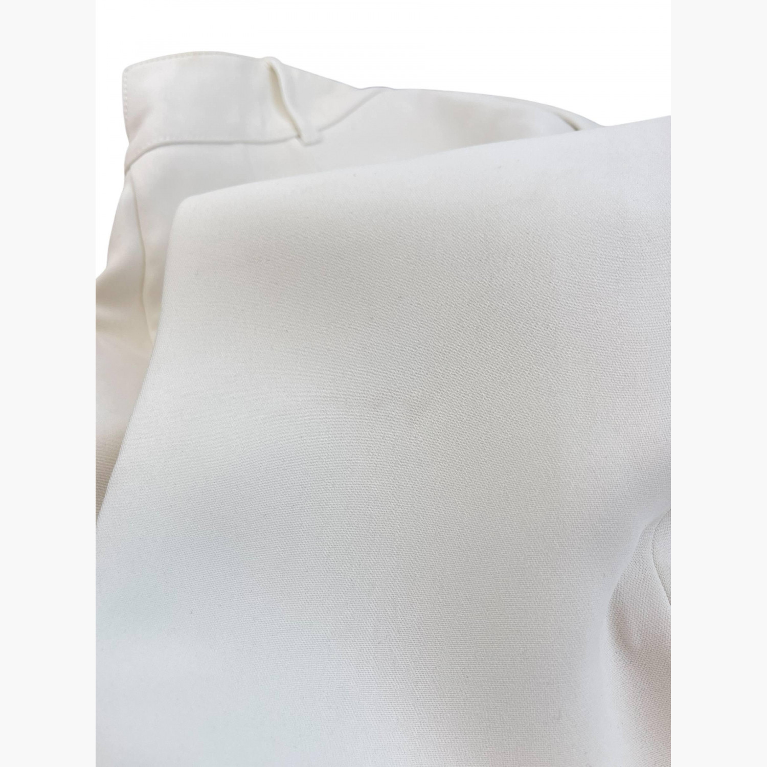 Білий приталений костюм із брюками палаццо.Склад: основна та додаткова тканина — 100% поліестер; підкладка — 100% віскоза.У гарному стані, є плями та дефект у вигляді відшарування дублерину.