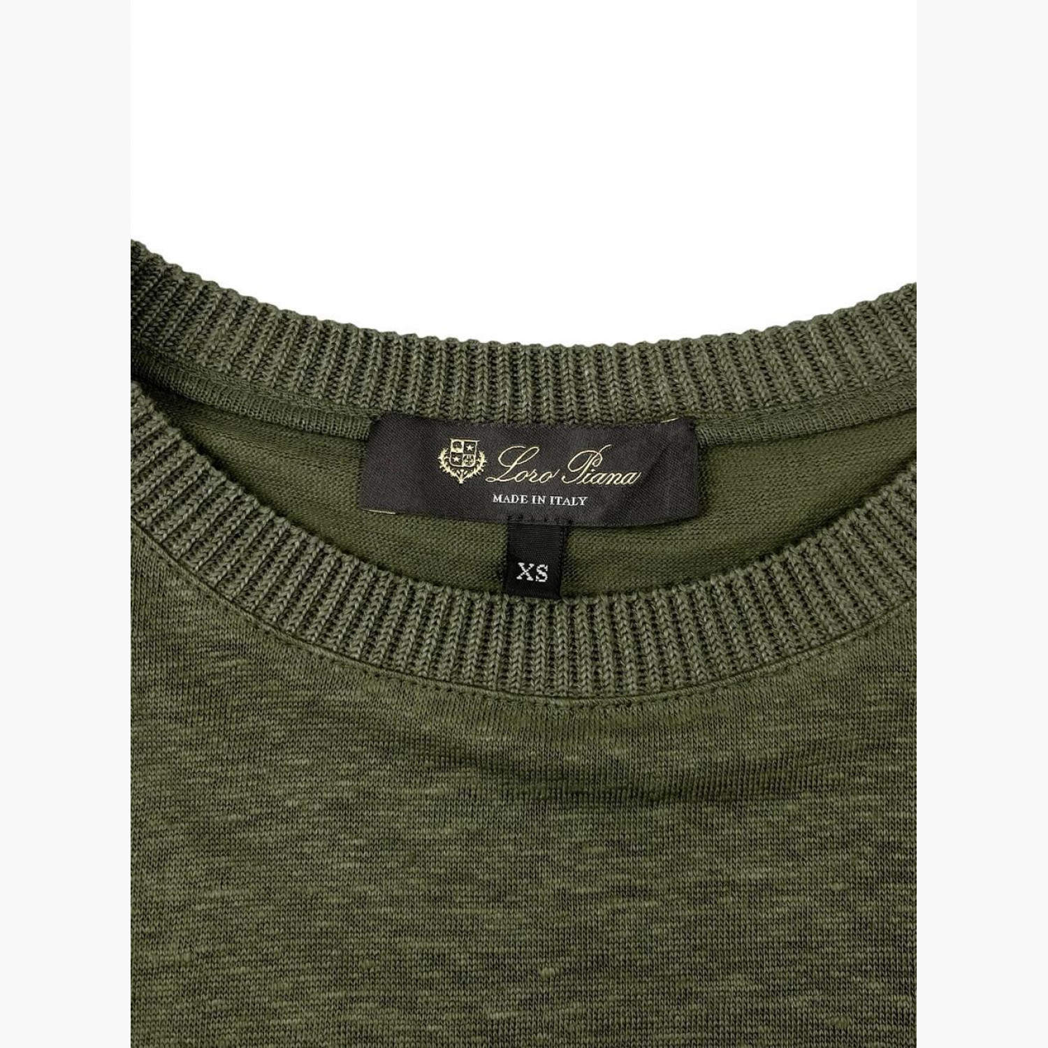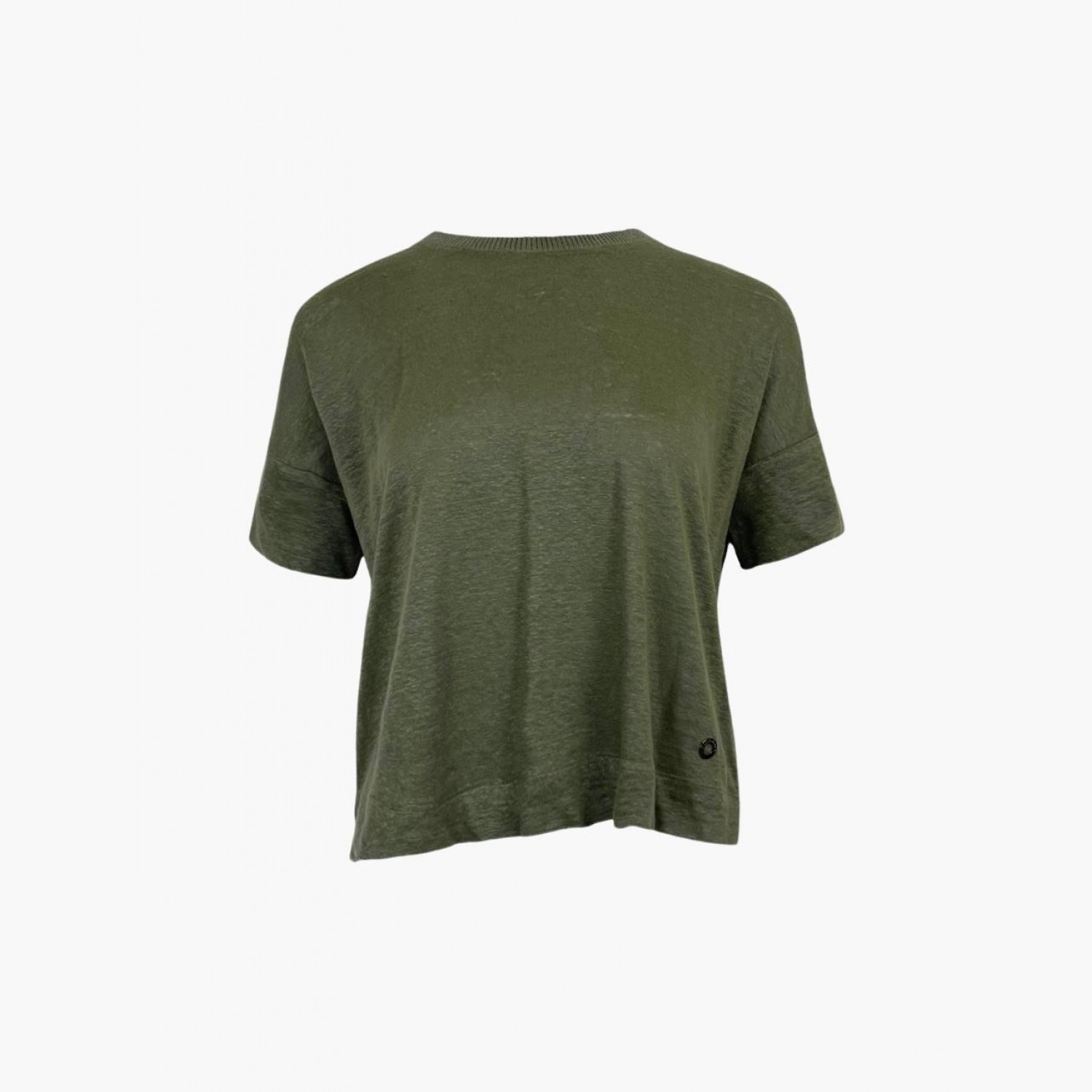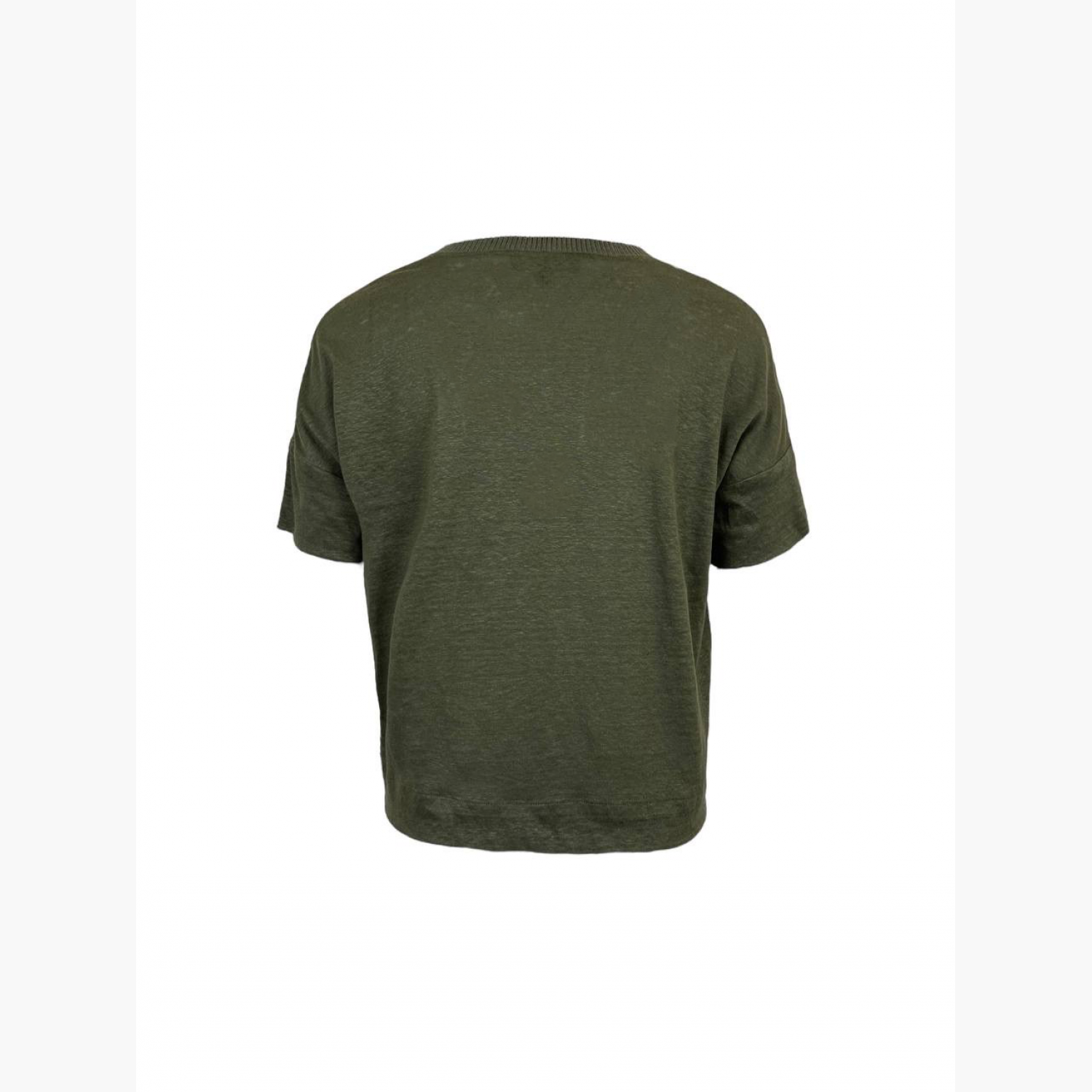Темно-зелена футболка з круглим вирізом. Склад: основний матеріал — 100% льон; деталі — 70% льон, 30% шовк. У відмінному стані, без слідів вжитку.