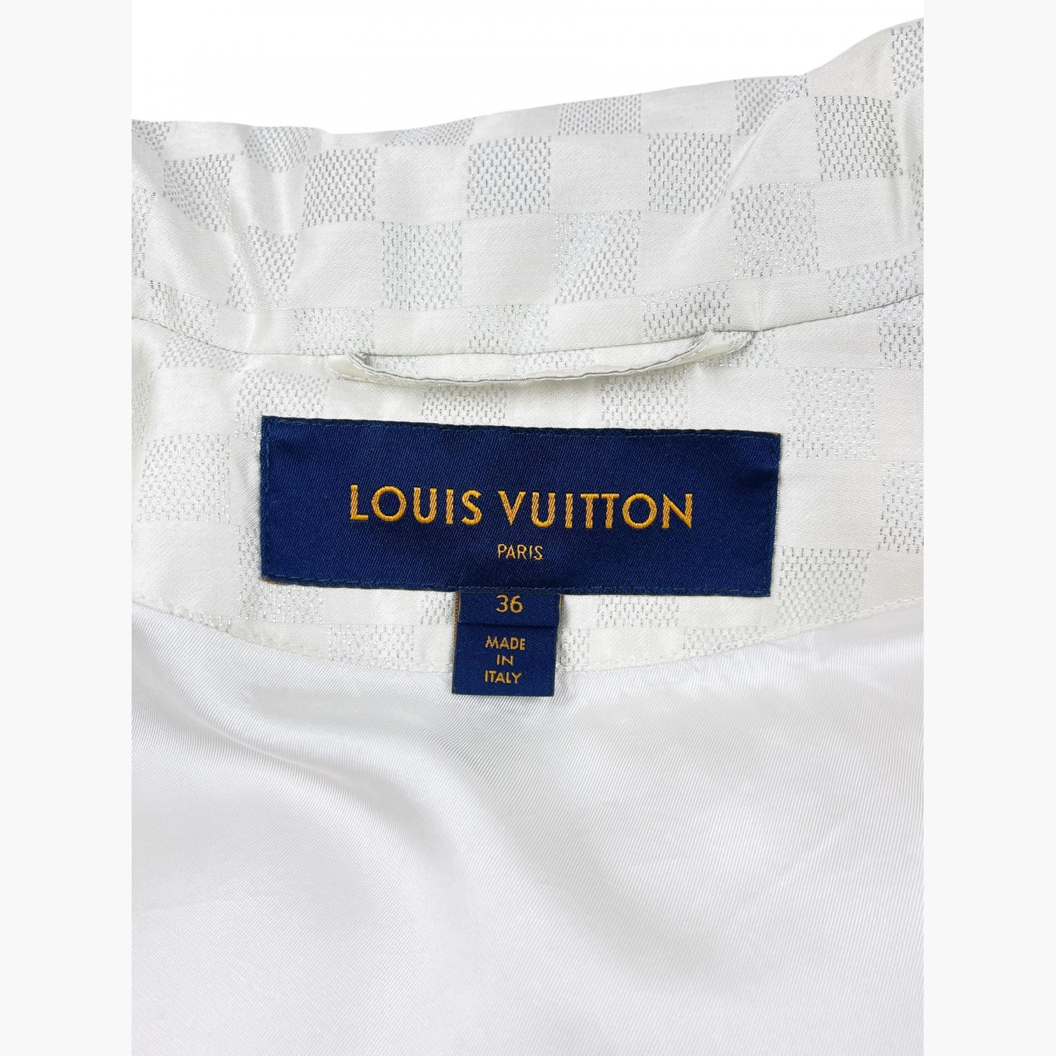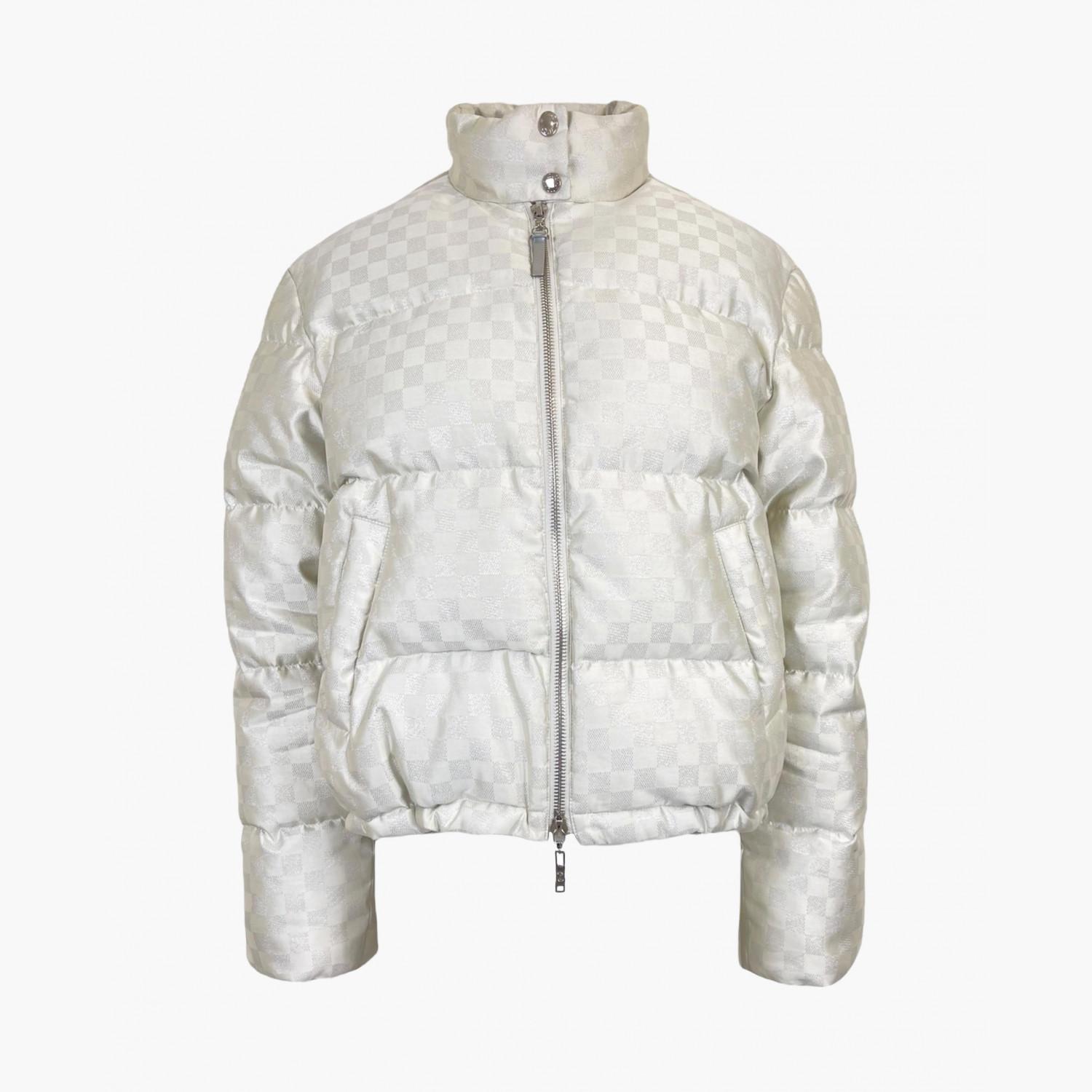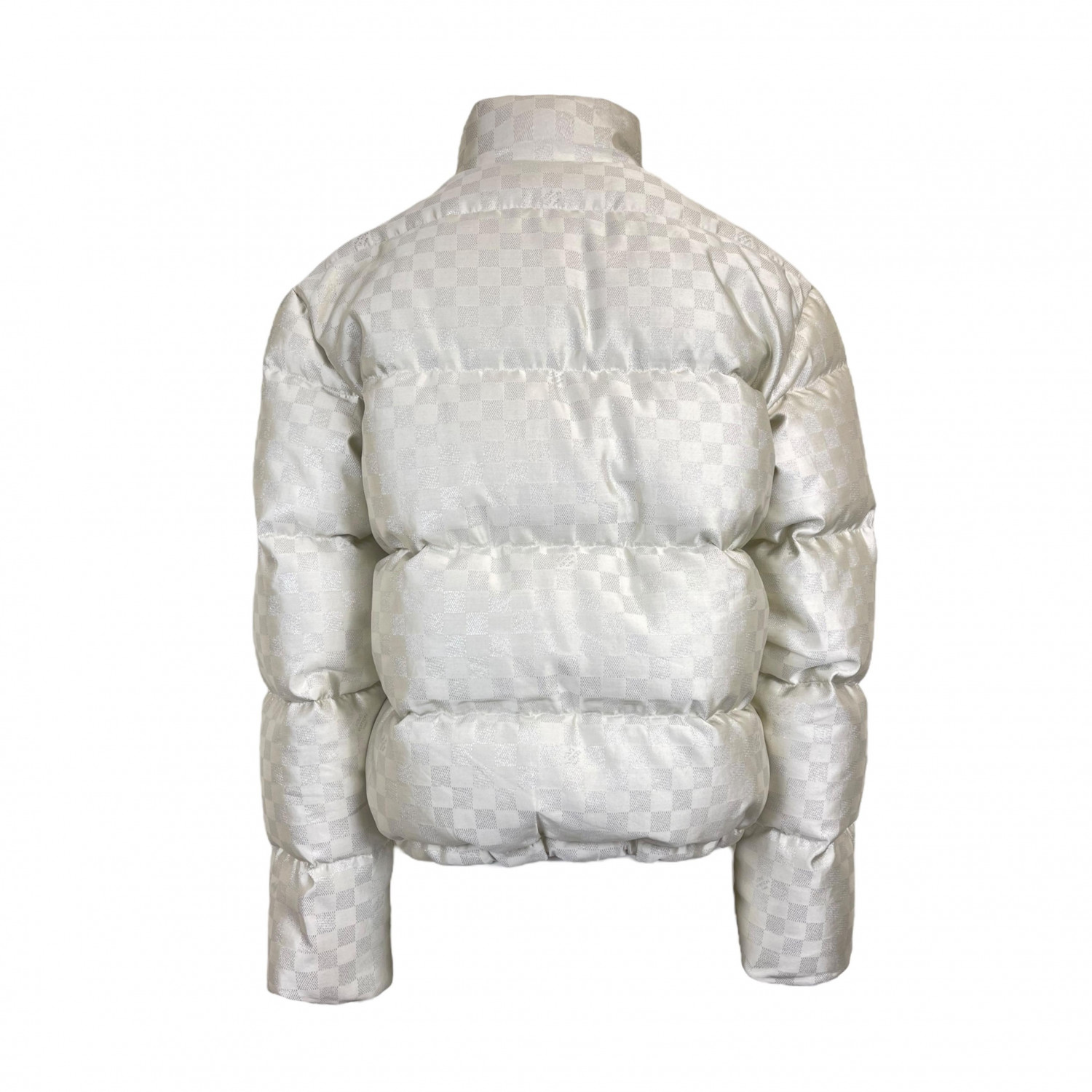 Білий укорочений пуховик на блискавці. Склад верху: 54% шкіра корови, 26% поліамід, 12% бавовна, 8% поліестер. Наповнення — пух і перо білої качки. У відмінному стані, без слідів вжитку.