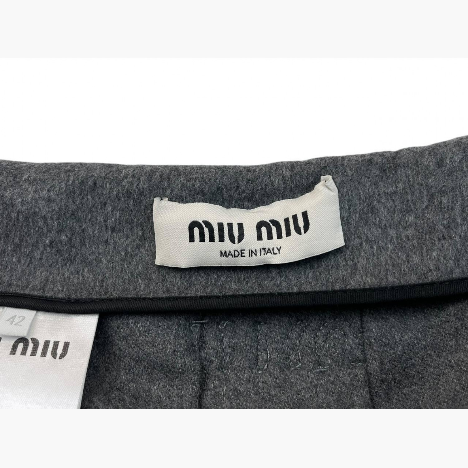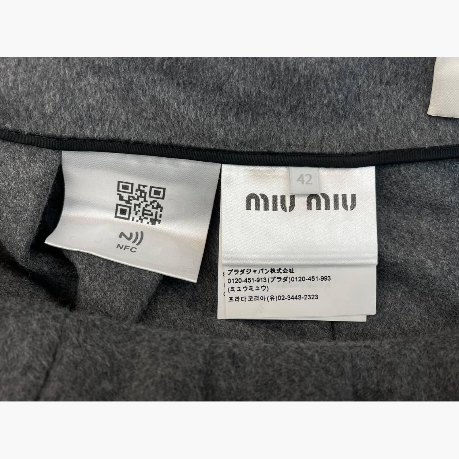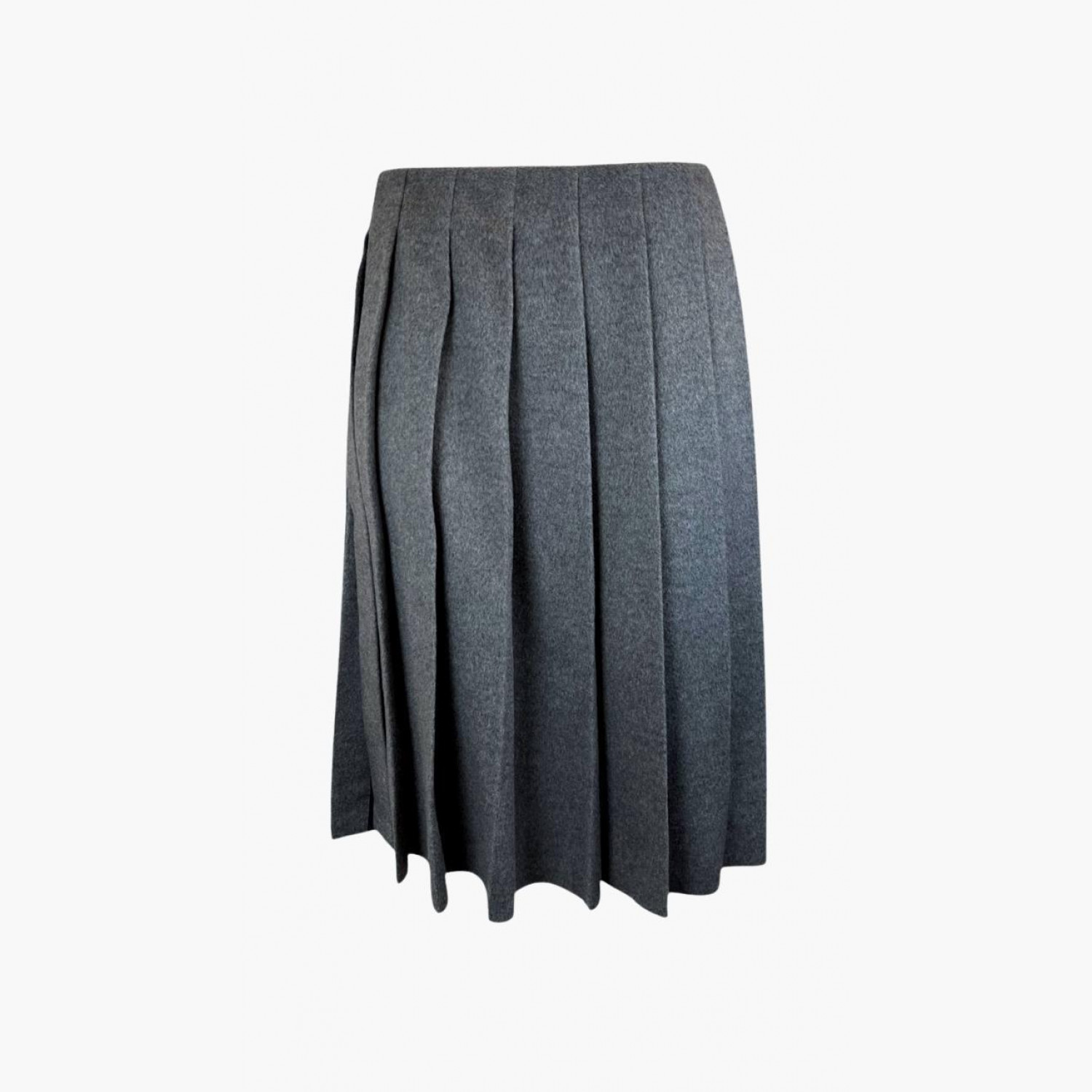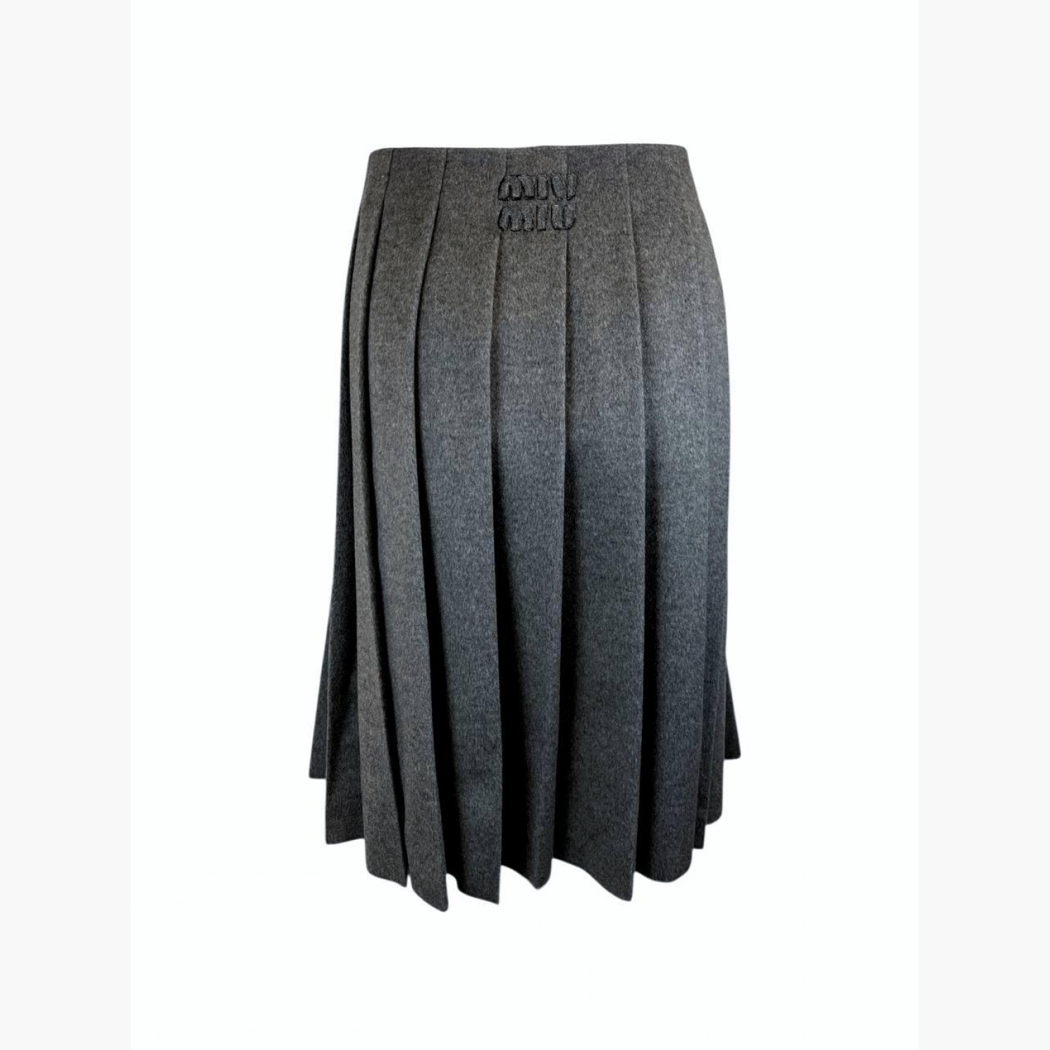 Сіра вовняна міді-спідниця в складку з необробленими краями, боковим розрізом і логотипом на поясниці. Склад — 90% чиста вовна, 10% кашемір. У відмінному стані, без слідів вжитку.