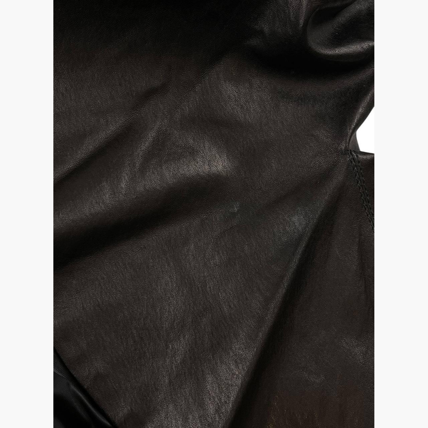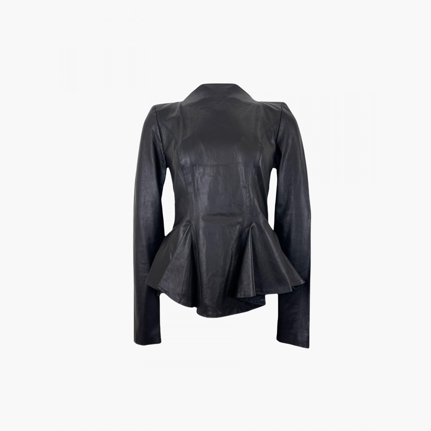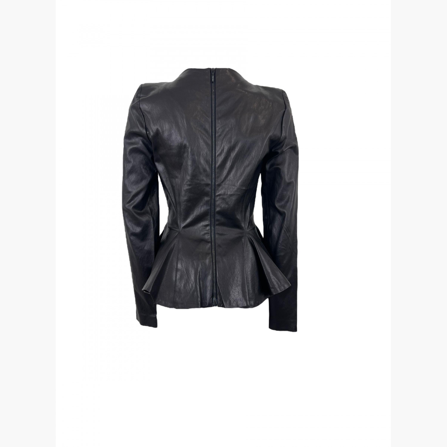 Чорна шкіряна блузка з баскою та блискавкою на спині. Склад: основний матеріал — 100% шкіра; підкладка — 100% поліестер. У відмінному стані, є сліди вжитку.