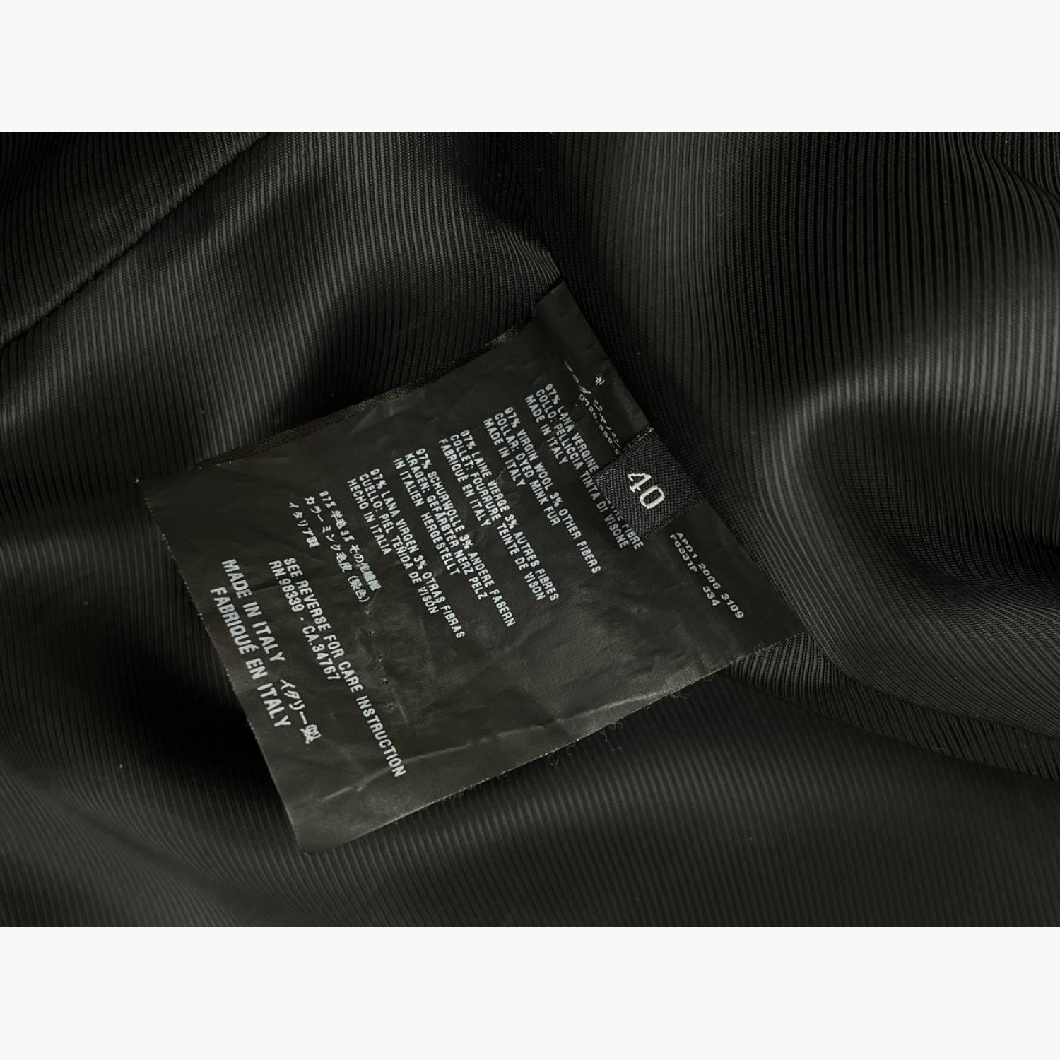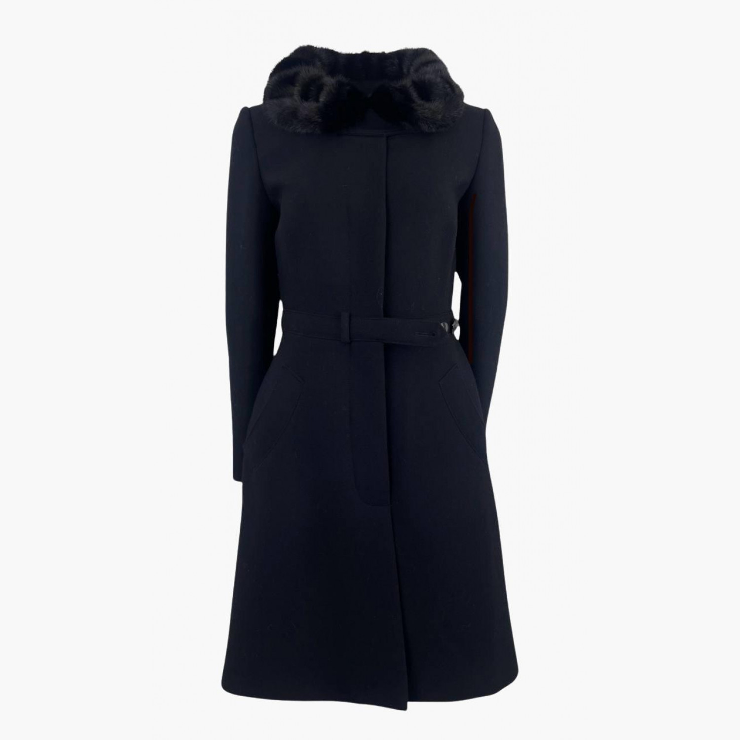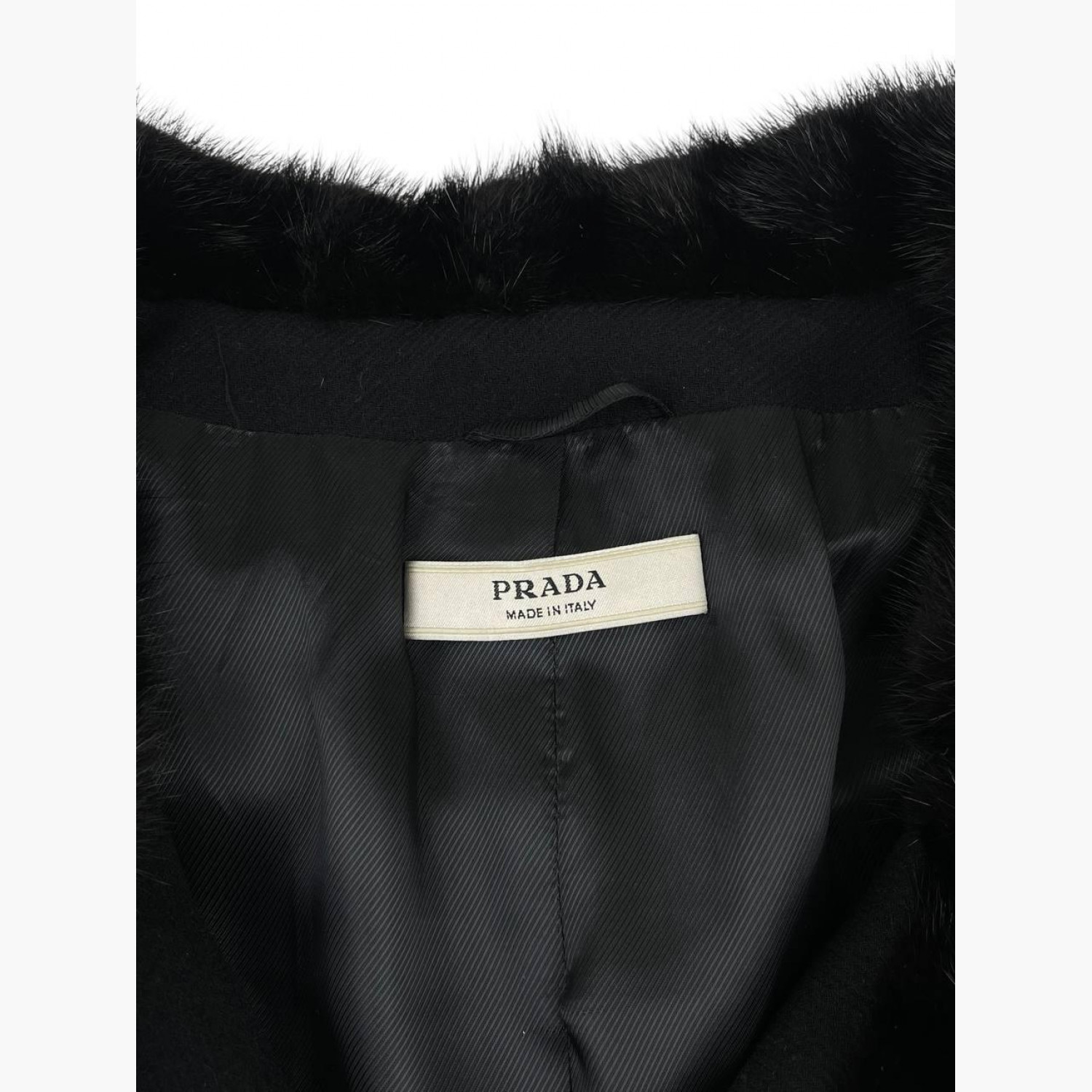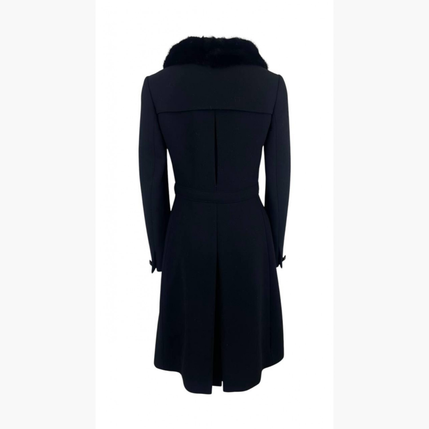 Чорне вовняне пальто з хутряним коміром. Склад: основний матеріал — 97% вовна, 3% інші волокна; комір — фарбоване хутро норки. В відмінному стані, на підкладці є незначні зачіпки.