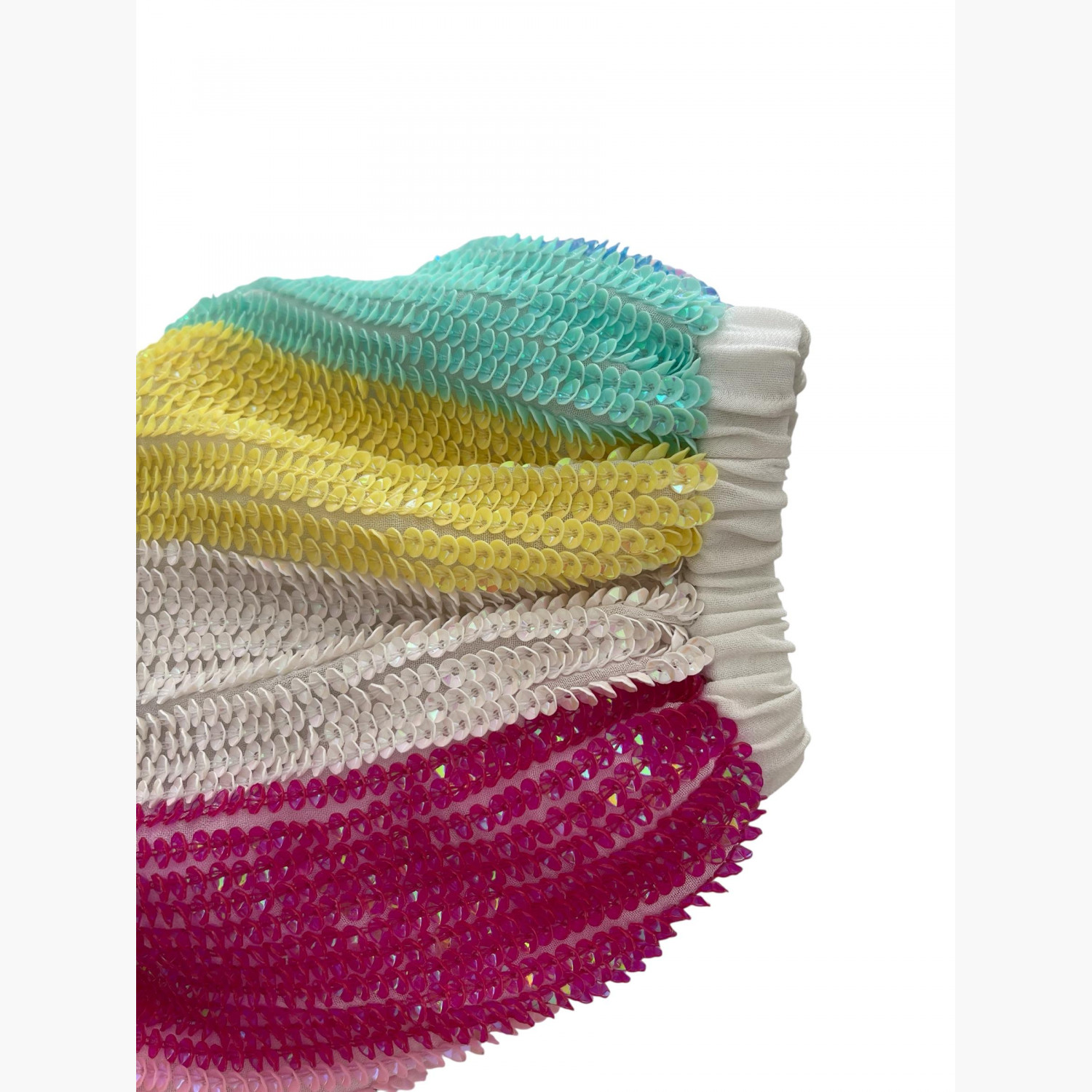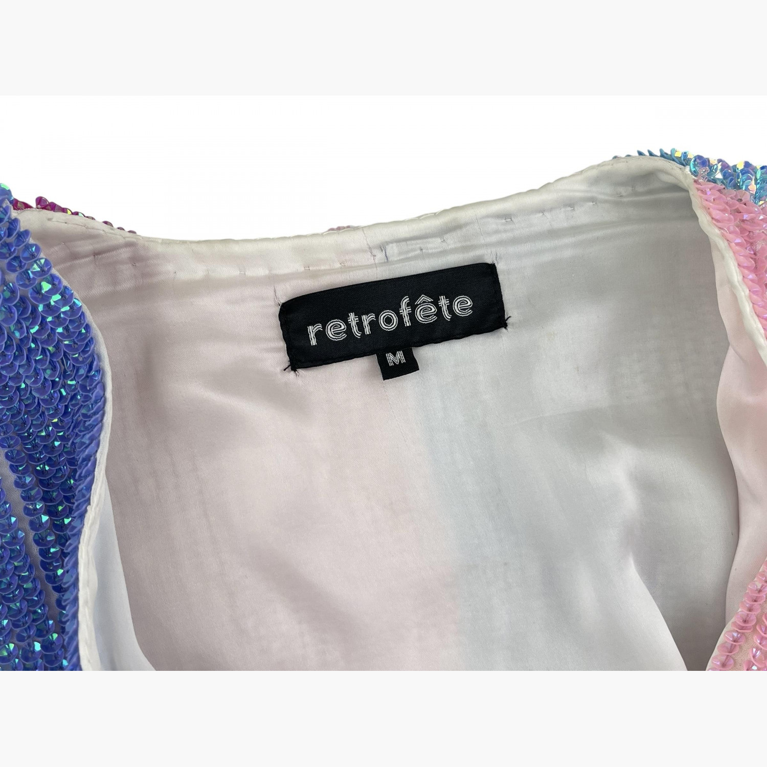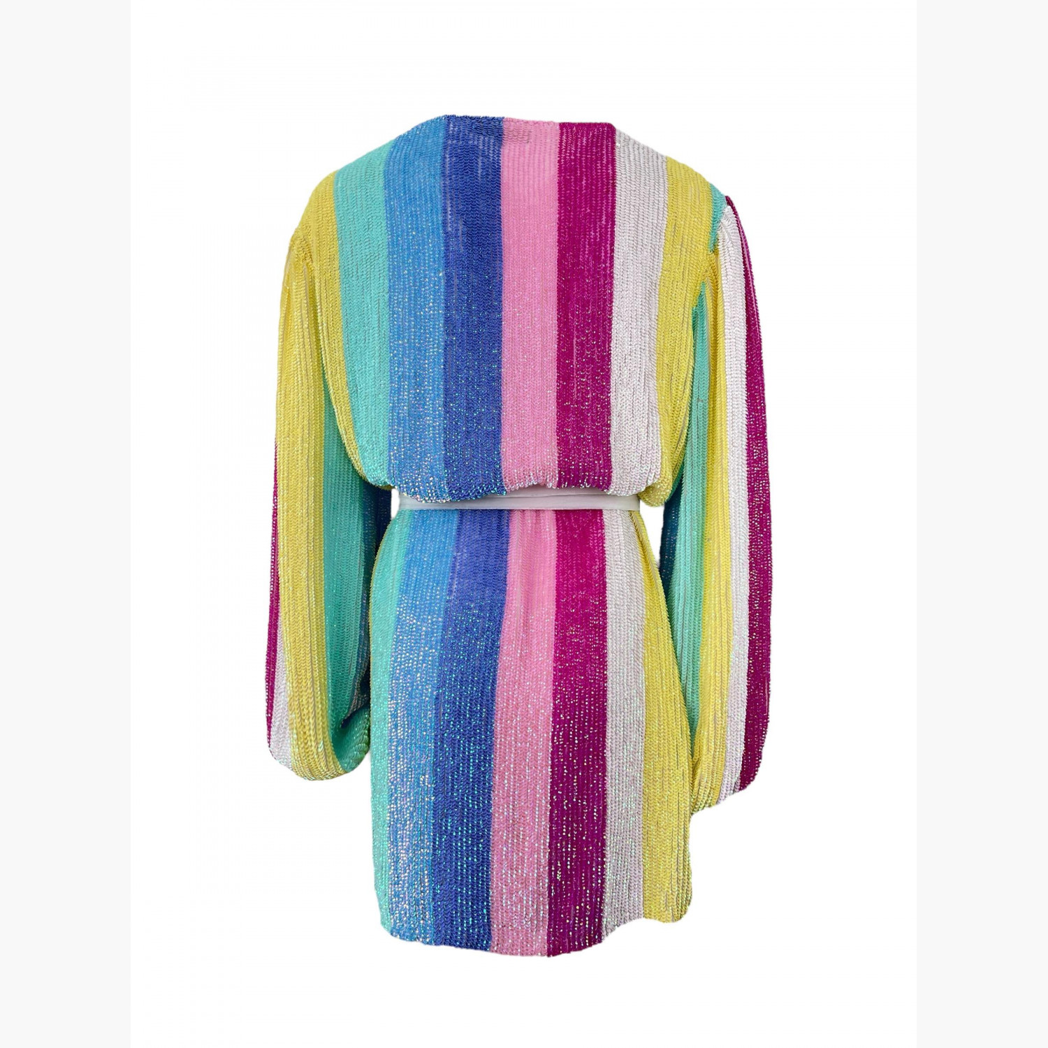 Оксамитова сукня-халат, оздоблена кольоровими паєтками, з поясом. Стан гарний, є сліди вжитку та незначні дефекти.