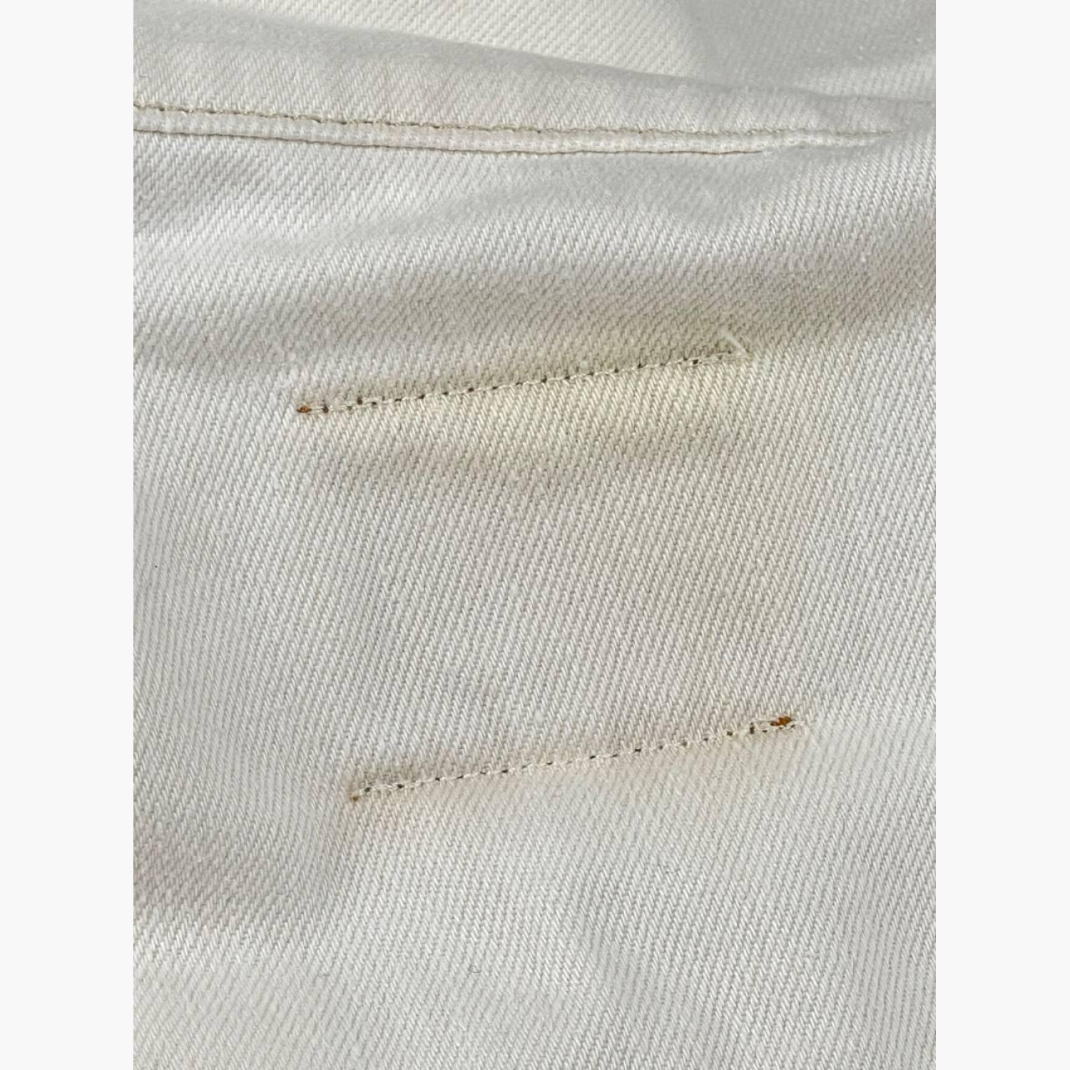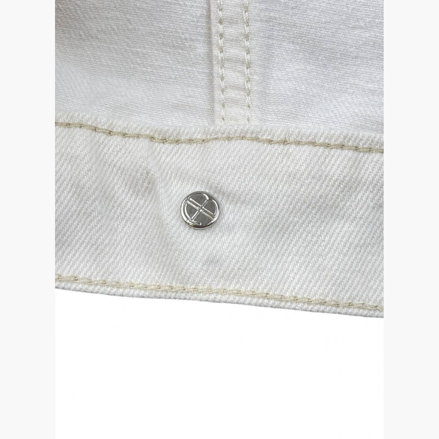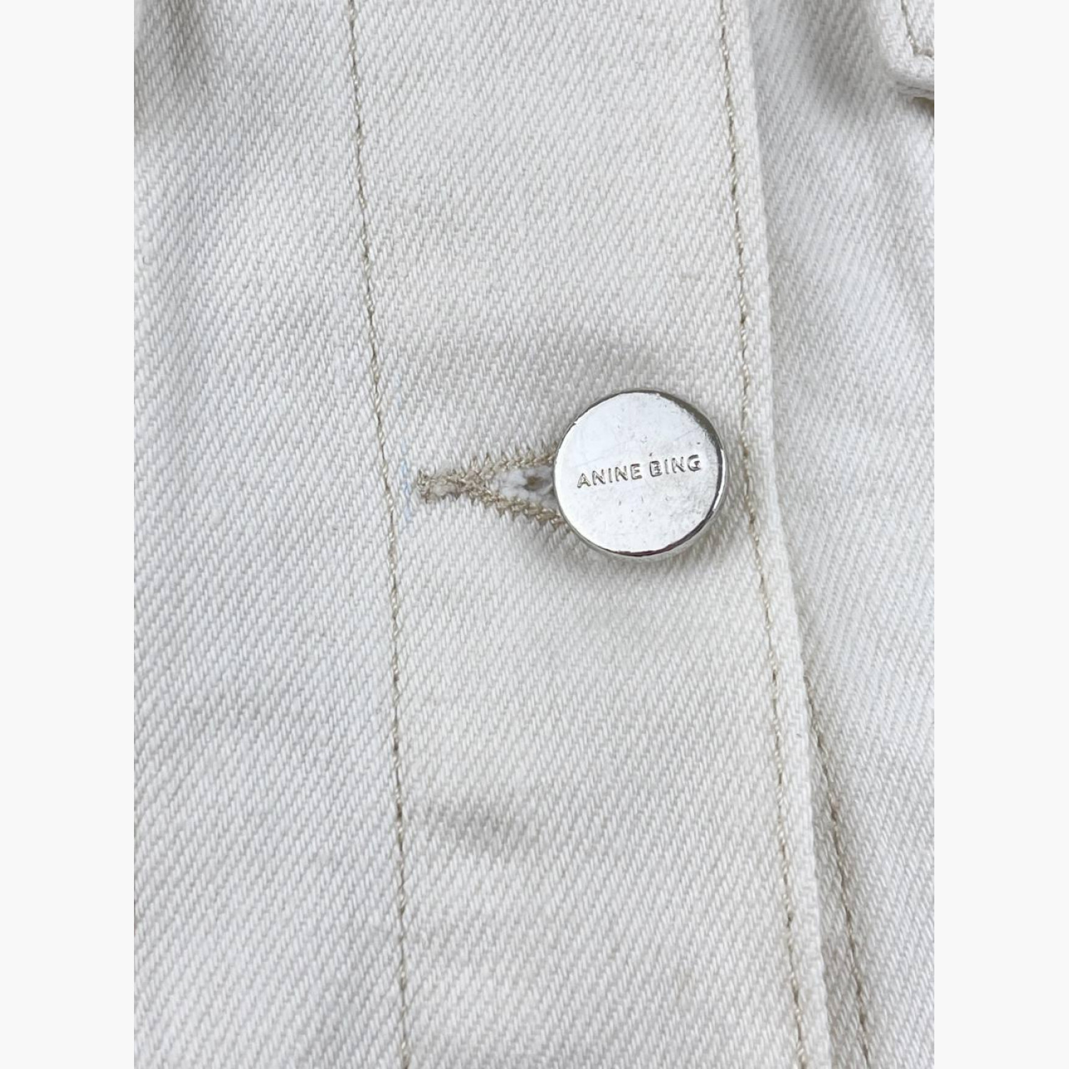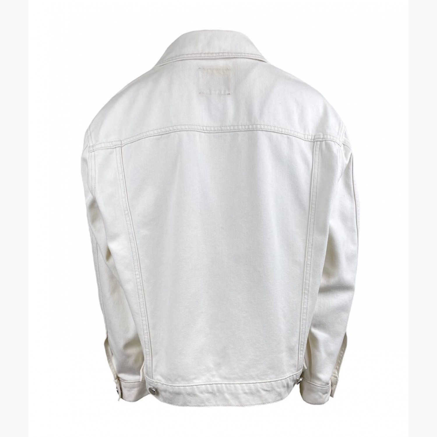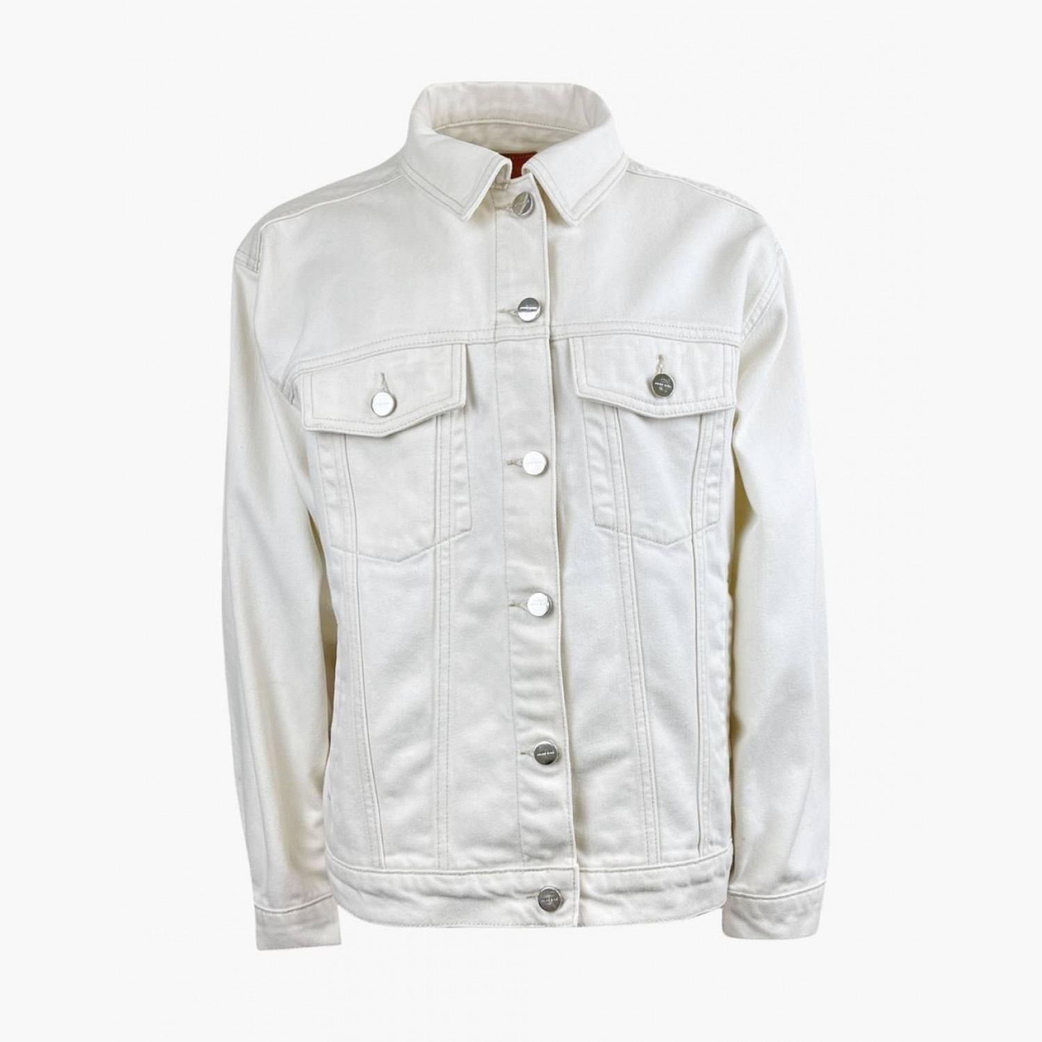 Біла джинсова куртка на ґудзиках. Склад — 80% бавовна, 20% льон. У дуже хорошому стані, є сліди вжитку.
