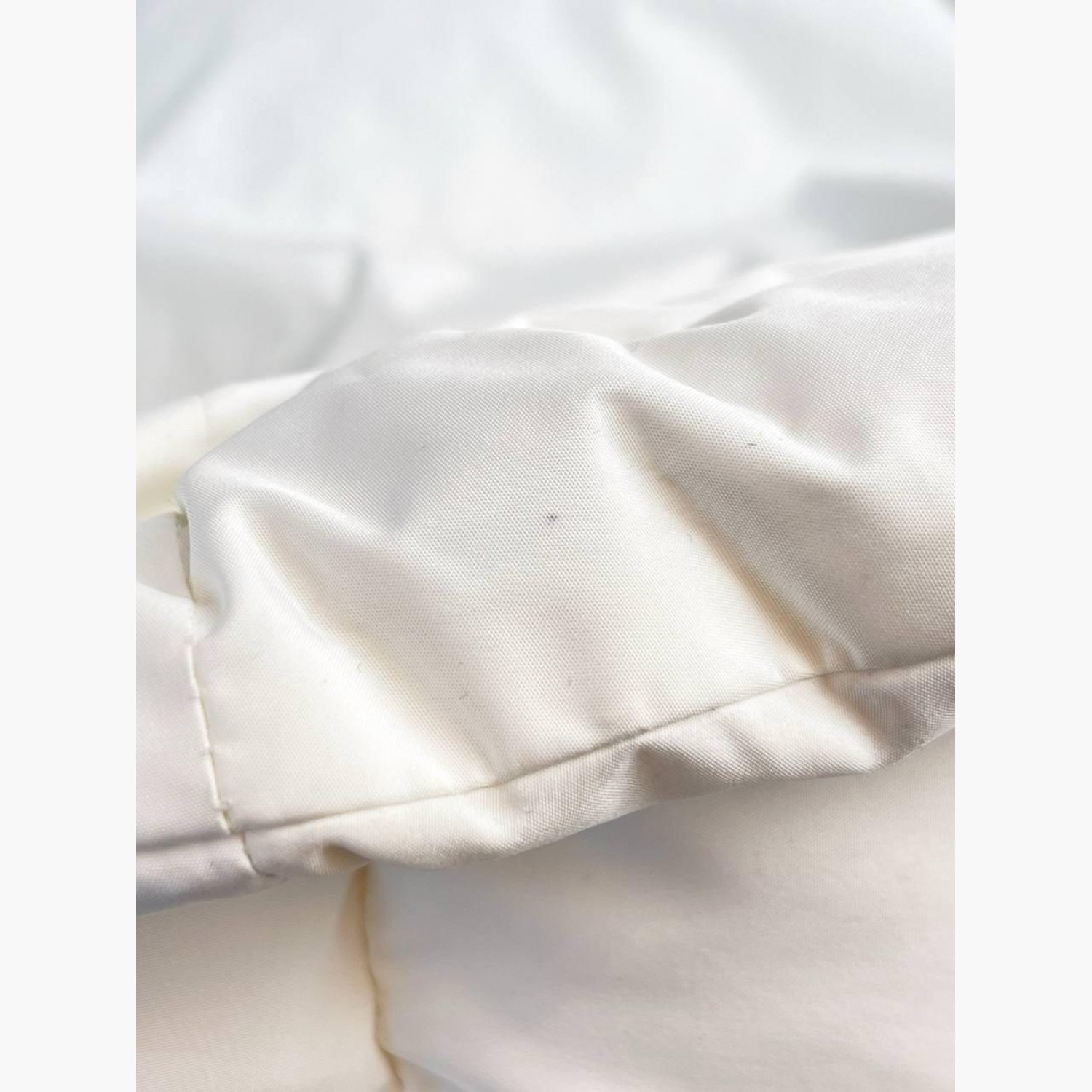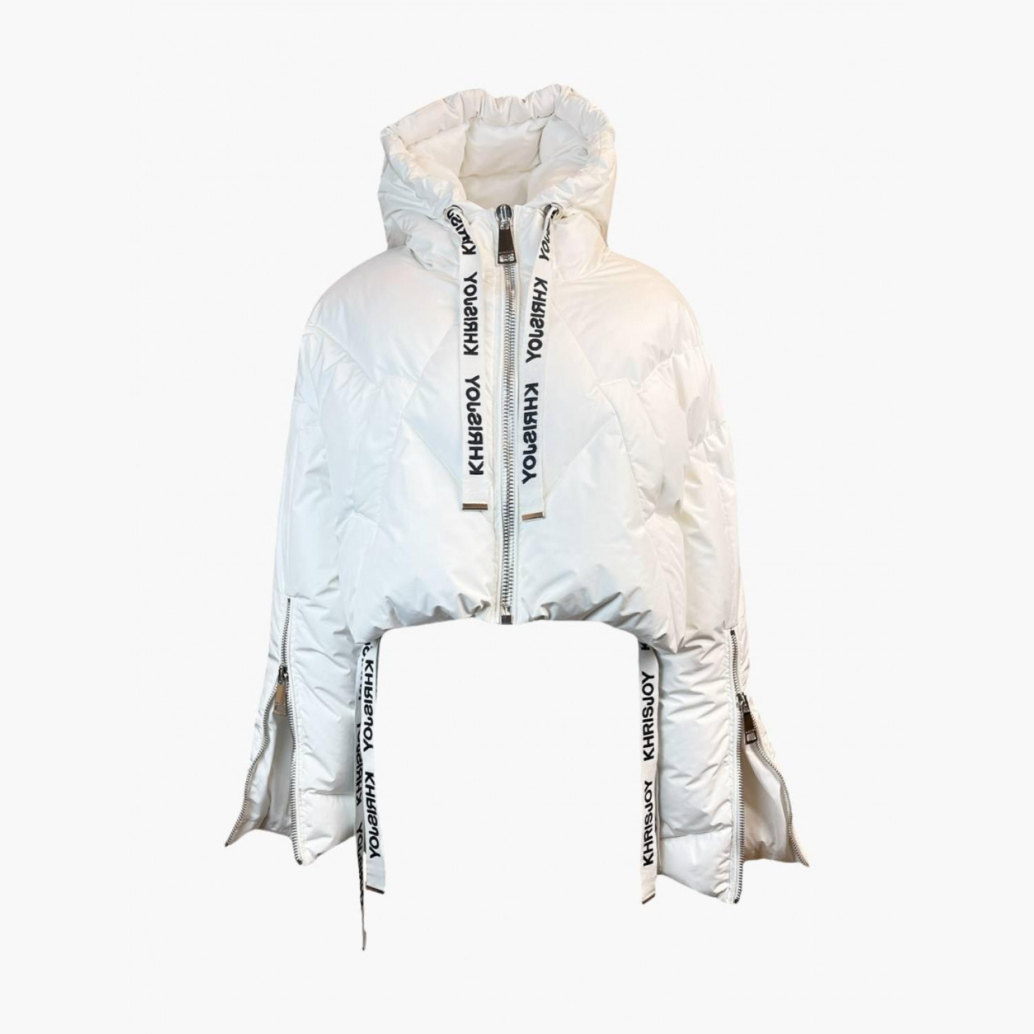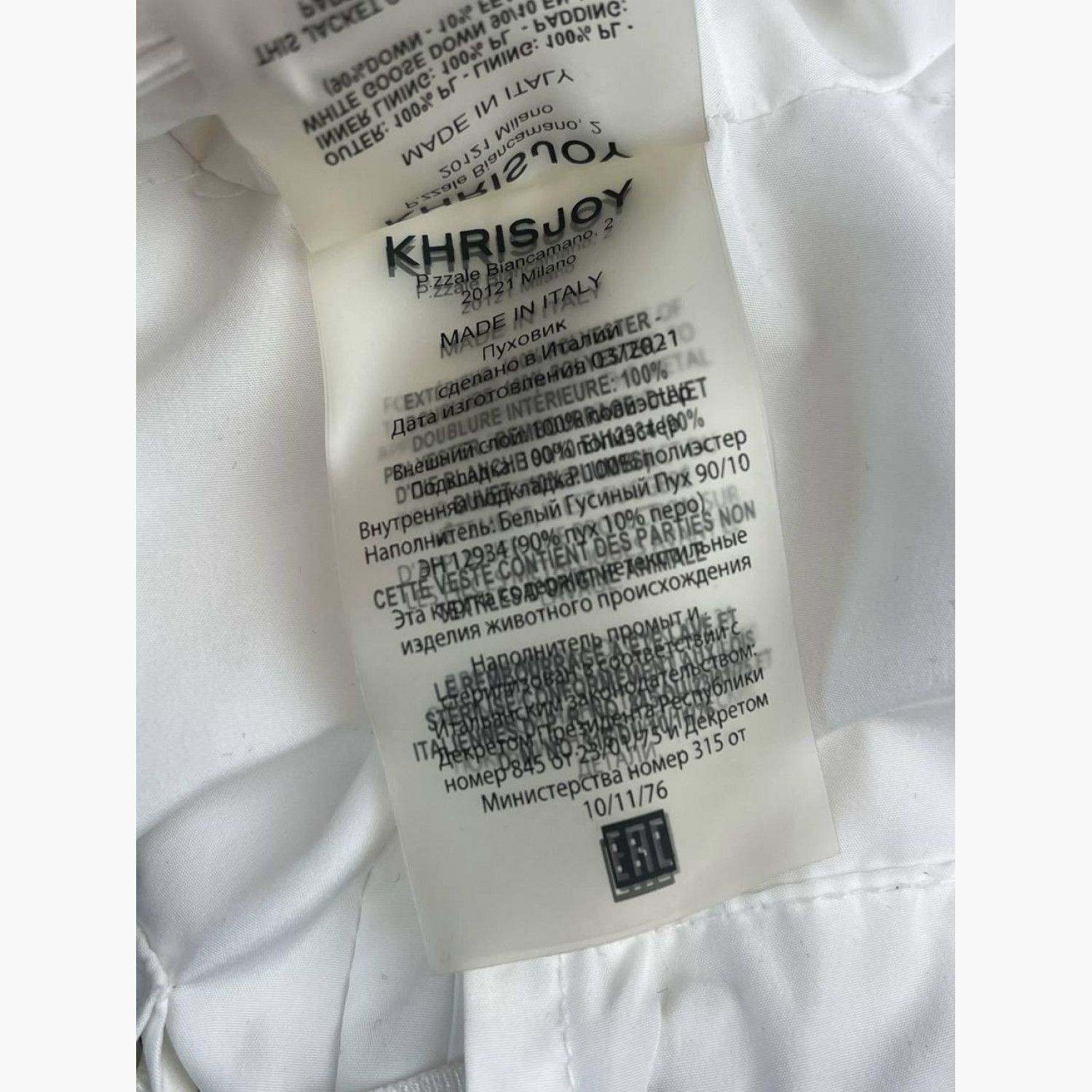 Білий укорочений пуховик на блискавці з капюшоном, рукави також на блискавці. Склад: основний матеріал і підкладка — 100% поліестер; наповнювач — 90% білий гусячий пух, 10% перо. У відмінному стані, без значних слідів вжитку.