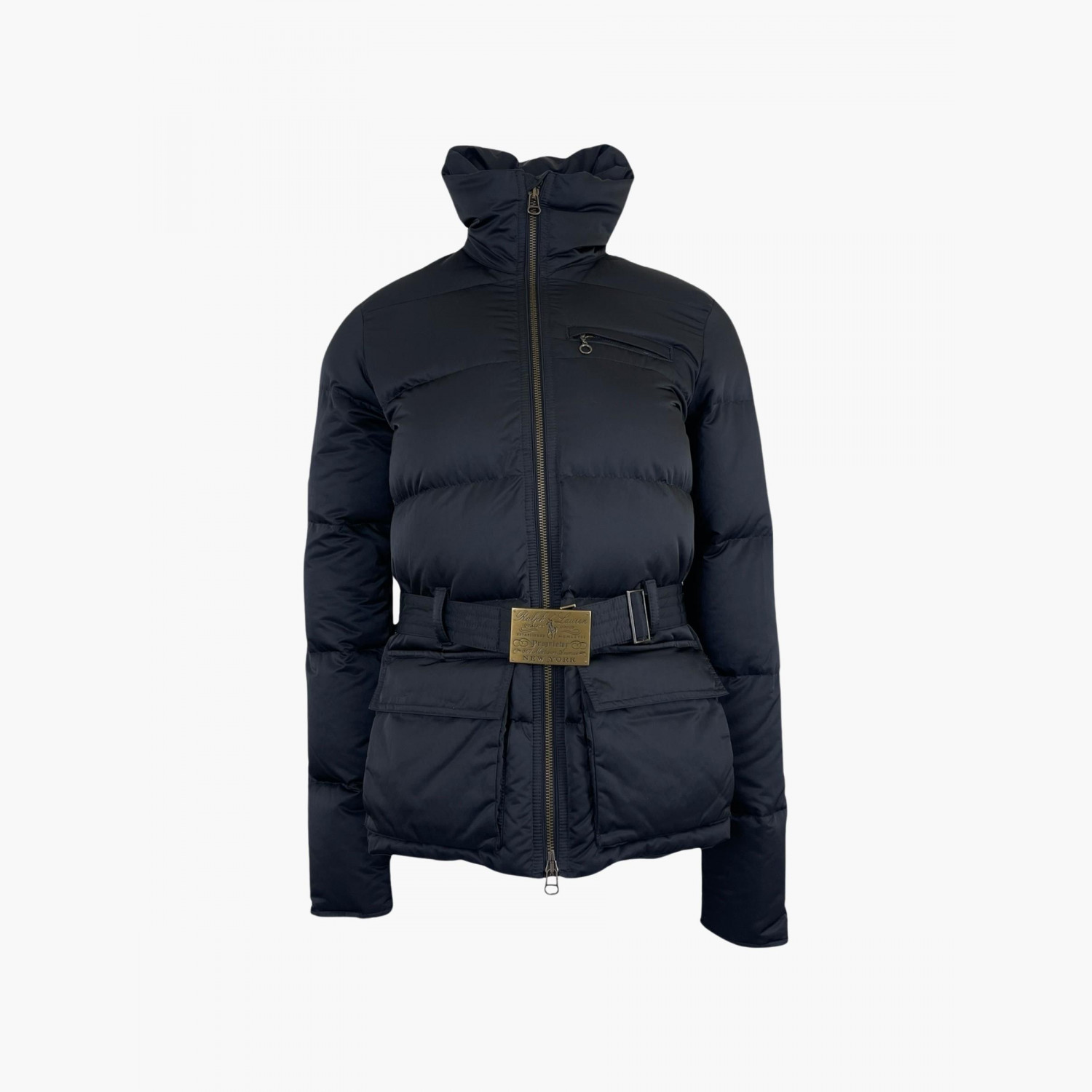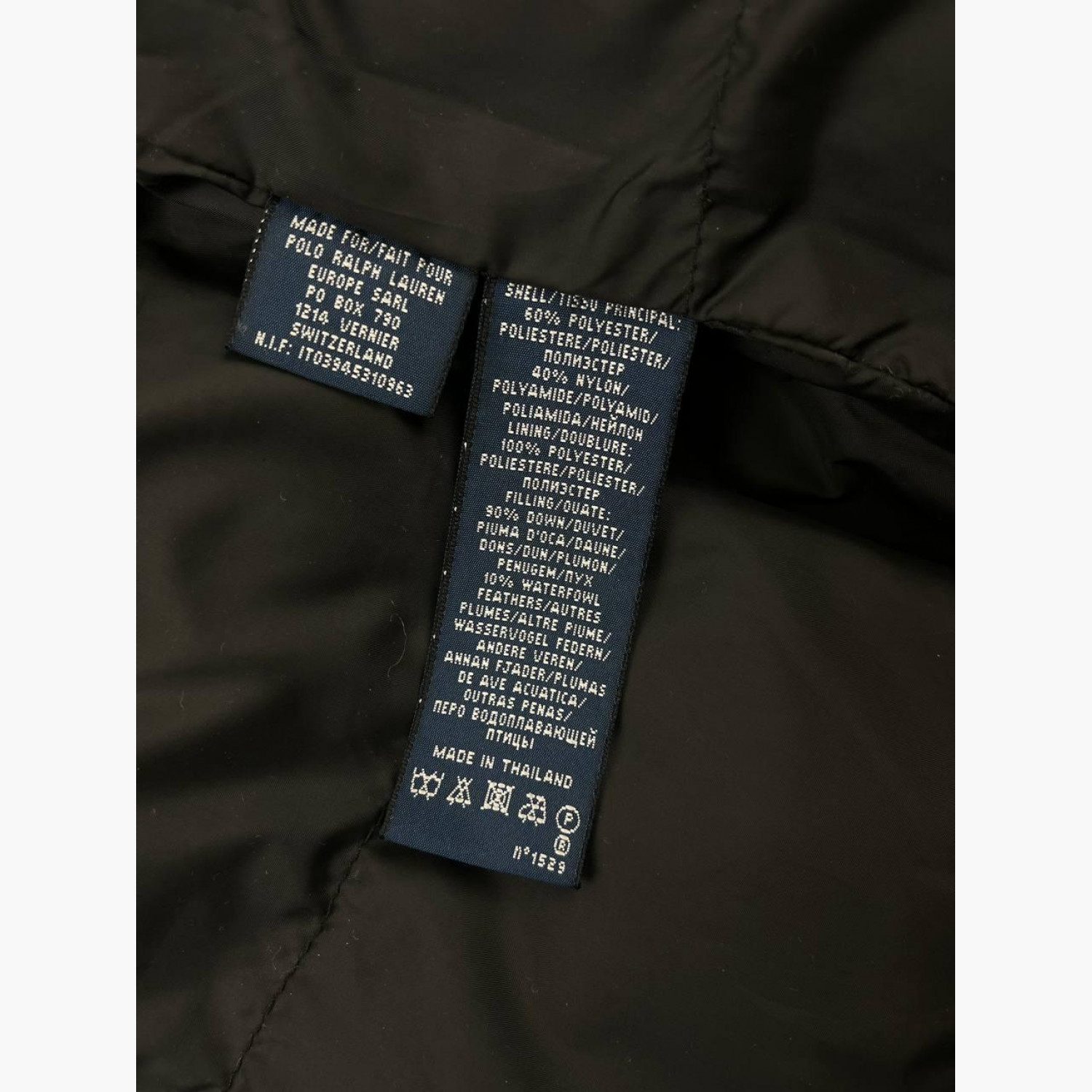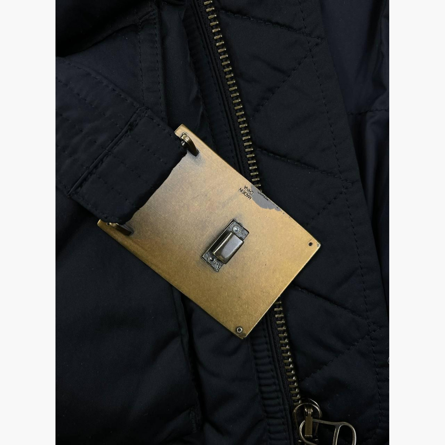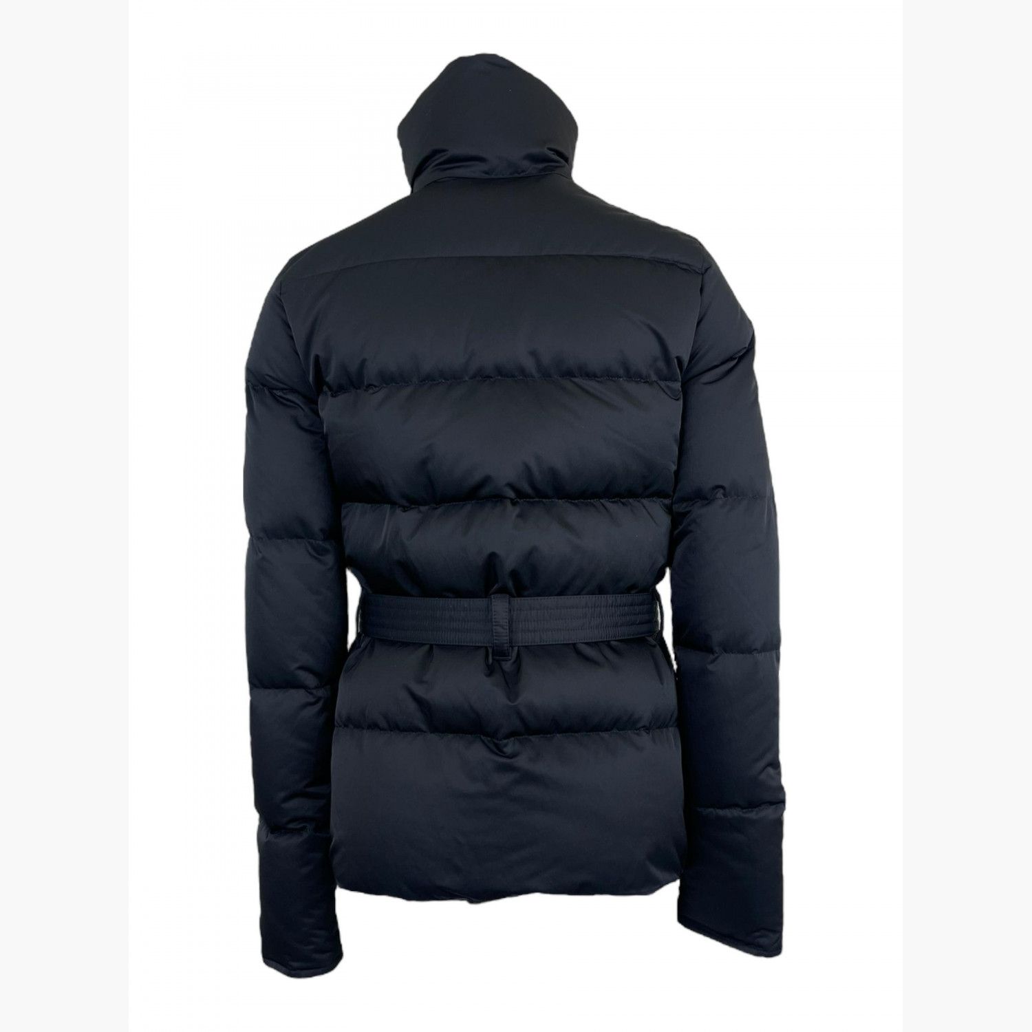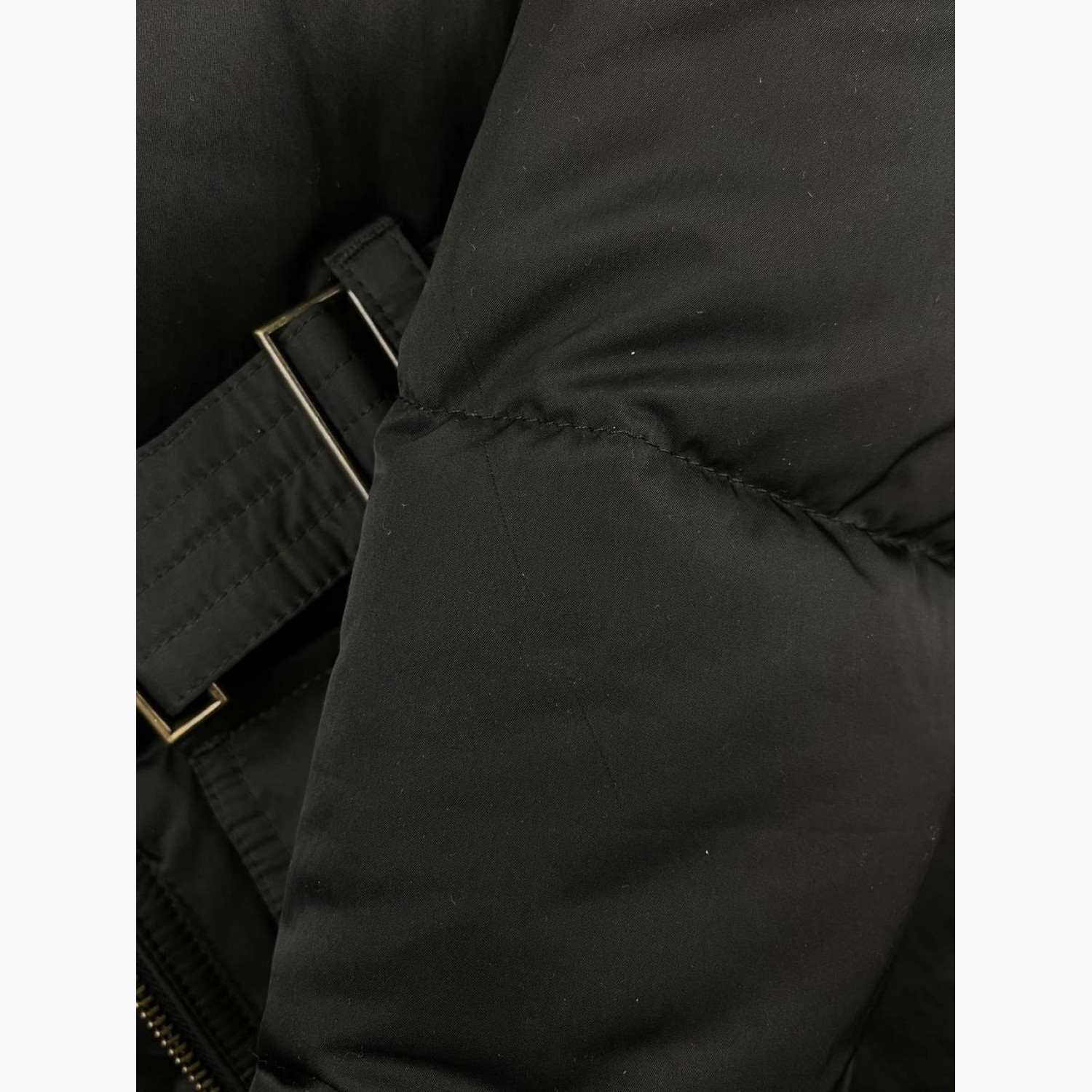 Чорний пуховик на блискавці з поясом і металевою пряжкою. Склад: основний матеріал — 60% поліестер, 40% поліамід; підкладка — 100% поліестер; наповнення — 90% пух, 10% перо водоплавного птаха. У дуже хорошому стані, є незначні сліди вжитку.