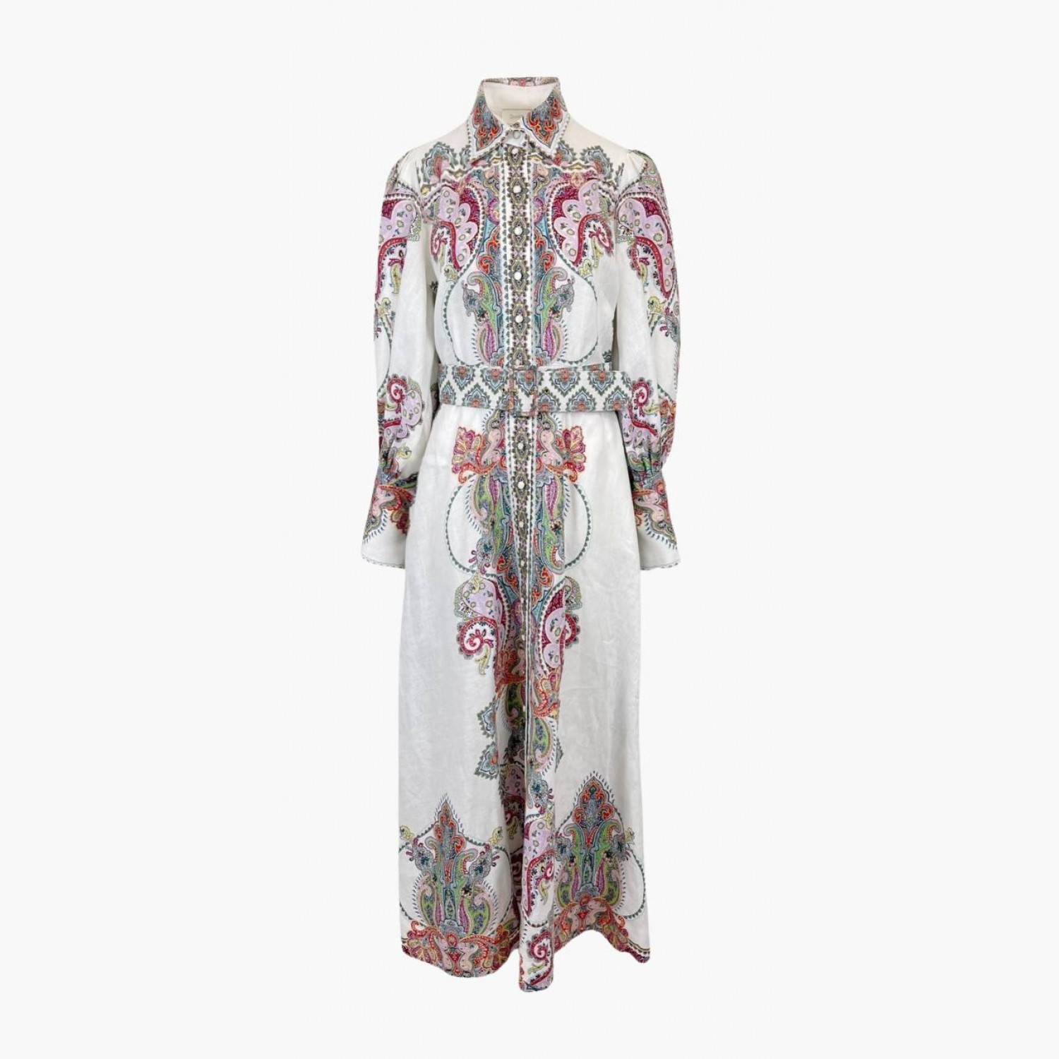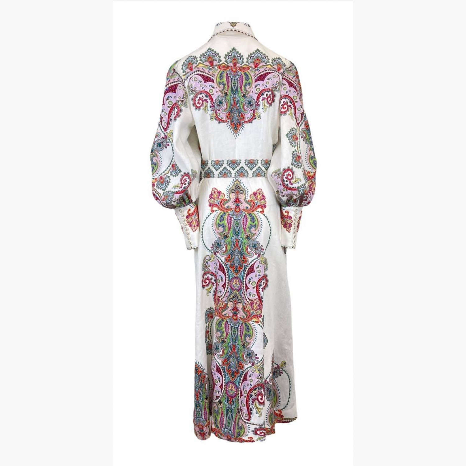 Біла лляна сукня з довгим круглим рукавом, на ґудзиках і на поясі, з квітковим принтом. У відмінному стані, без слідів вжитку.