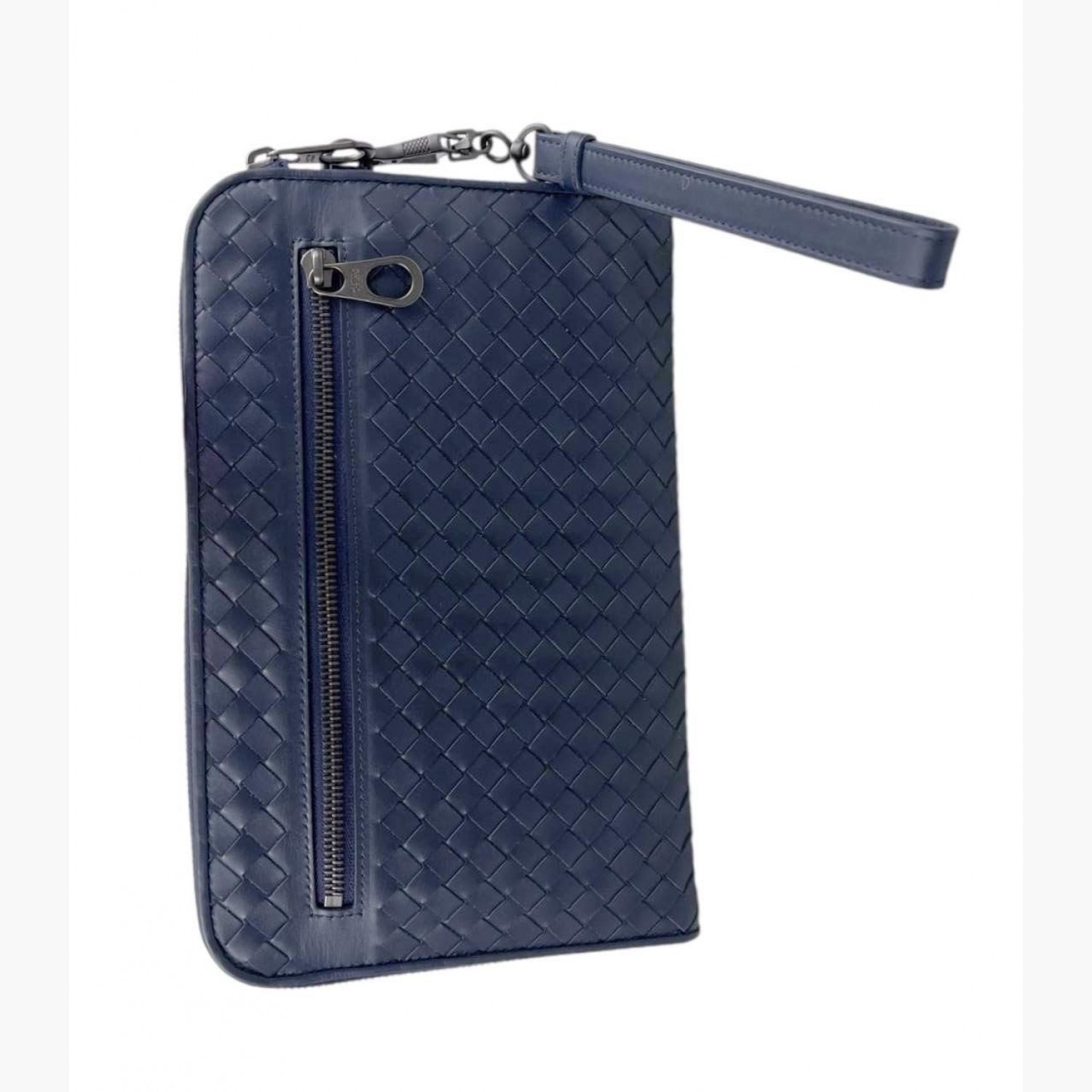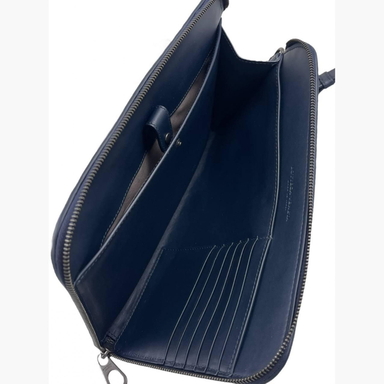 Темно-синє плетене портмоне з шкіри. Всередині одне основне відділення з відкритими кишенями та подвійним відкритим кишенею, поверх якого розташовано шість відділень для карт. На задній стороні — кишеня на блискавці. У відмінному стані, без слідів вжитку.